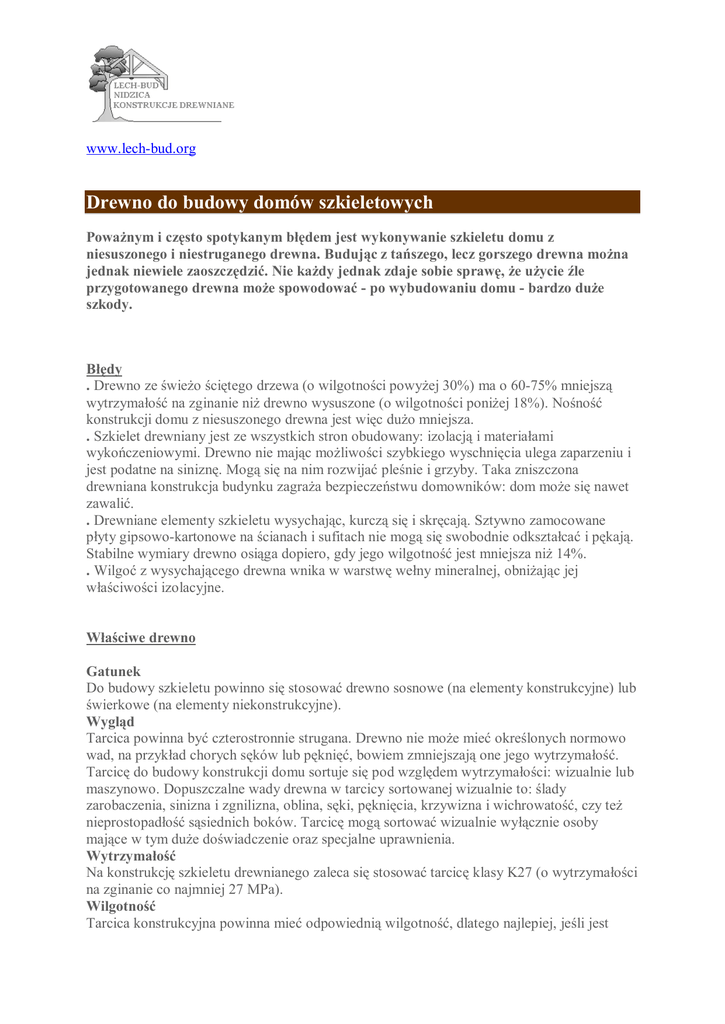 www.lech-bud.org Drewno do budowy domów szkieletowych Poważnym i często spotykanym błędem jest wykonywanie szkieletu domu z niesuszonego i niestruganego drewna. Budując z tańszego, lecz gorszego drewna można jednak niewiele zaoszczędzić. Nie każdy jednak zdaje sobie sprawę, że użycie źle przygotowanego drewna może spowodować - po wybudowaniu domu - bardzo duże szkody. Błędy . Drewno ze świeżo ściętego drzewa (o wilgotności powyżej 30%) ma o 60-75% mniejszą wytrzymałość na zginanie niż drewno wysuszone (o wilgotności poniżej 18%). Nośność konstrukcji domu z niesuszonego drewna jest więc dużo mniejsza. . Szkielet drewniany jest ze wszystkich stron obudowany: izolacją i materiałami wykończeniowymi. Drewno nie mając możliwości szybkiego wyschnięcia ulega zaparzeniu i jest podatne na siniznę. Mogą się na nim rozwijać pleśnie i grzyby. Taka zniszczona drewniana konstrukcja budynku zagraża bezpieczeństwu domowników: dom może się nawet zawalić. . Drewniane elementy szkieletu wysychając, kurczą się i skręcają. Sztywno zamocowane płyty gipsowo-kartonowe na ścianach i sufitach nie mogą się swobodnie odkształcać i pękają. Stabilne wymiary drewno osiąga dopiero, gdy jego wilgotność jest mniejsza niż 14%. . Wilgoć z wysychającego drewna wnika w warstwę wełny mineralnej, obniżając jej właściwości izolacyjne. Właściwe drewno Gatunek Do budowy szkieletu powinno się stosować drewno sosnowe (na elementy konstrukcyjne) lub świerkowe (na elementy niekonstrukcyjne). Wygląd Tarcica powinna być czterostronnie strugana. Drewno nie może mieć określonych normowo wad, na przykład chorych sęków lub pęknięć, bowiem zmniejszają one jego wytrzymałość. Tarcicę do budowy konstrukcji domu sortuje się pod względem wytrzymałości: wizualnie lub maszynowo. Dopuszczalne wady drewna w tarcicy sortowanej wizualnie to: ślady zarobaczenia, sinizna i zgnilizna, oblina, sęki, pęknięcia, krzywizna i wichrowatość, czy też nieprostopadłość sąsiednich boków. Tarcicę mogą sortować wizualnie wyłącznie osoby mające w tym duże doświadczenie oraz specjalne uprawnienia. Wytrzymałość Na konstrukcję szkieletu drewnianego zaleca się stosować tarcicę klasy K27 (o wytrzymałości na zginanie co najmniej 27 MPa). Wilgotność Tarcica konstrukcyjna powinna mieć odpowiednią wilgotność, dlatego najlepiej, jeśli jest www.lech-bud.org komorowo suszona . Wilgotność tarcicy z drewna sosnowego, z której można budować dom, powinna wynosić: . nie więcej niż 18% - jeśli elementy będą obudowane, . nie więcej niż 23% - jeśli elementy będą na otwartym powietrzu. Drewno przywiezione na budowę nie powinno mieć wilgotności większej niż 18-19%. W trakcie budowy - trwającej przeważnie kilkanaście tygodni - drewno wysycha do wilgotności około 16%, co zapewnia maksymalną wytrzymałość i niezmienność wymiarów elementów. W drewnie suszonym komorowo nie ma żadnych zarodników pleśni i grzybów. W czasie suszenia zabijane są także larwy owadów oraz całkowicie zatrzymane jest sinienie drewna. Odporność na ogień Drewno konstrukcyjne strugane jest bardziej odporne na działanie ognia niż niestrugane: płomienie ognia ślizgają się po jego gładkiej powierzchni. Drewno strugane jest również rzadziej atakowane przez owady, którym trudniej dostać się do środka elementu przez gładką powierzchnię. Tekst Wojciech Nitka Konstrukcje dachowe Konstrukcje tradycyjne Tradycyjne konstrukcje dachowe oparte są na dużych przekrojach elementów konstrukcji – 7x14 cm lub 8x16 cm, a nawet więszkszych. Stosuje się je powszechnie na budynkach mieszkalnych wznoszonych w technologiach murowanych. Poszczególne elementy łączy się na wręby ciesielskie i śruby. Na tradycyjne Konstrukcje dachowe stosuje się drewno „spod piły”. Takie drewno wymaga impregnacji środkami chemicznymi. materiały pochodzą ze strony www.szkielet.com.pl