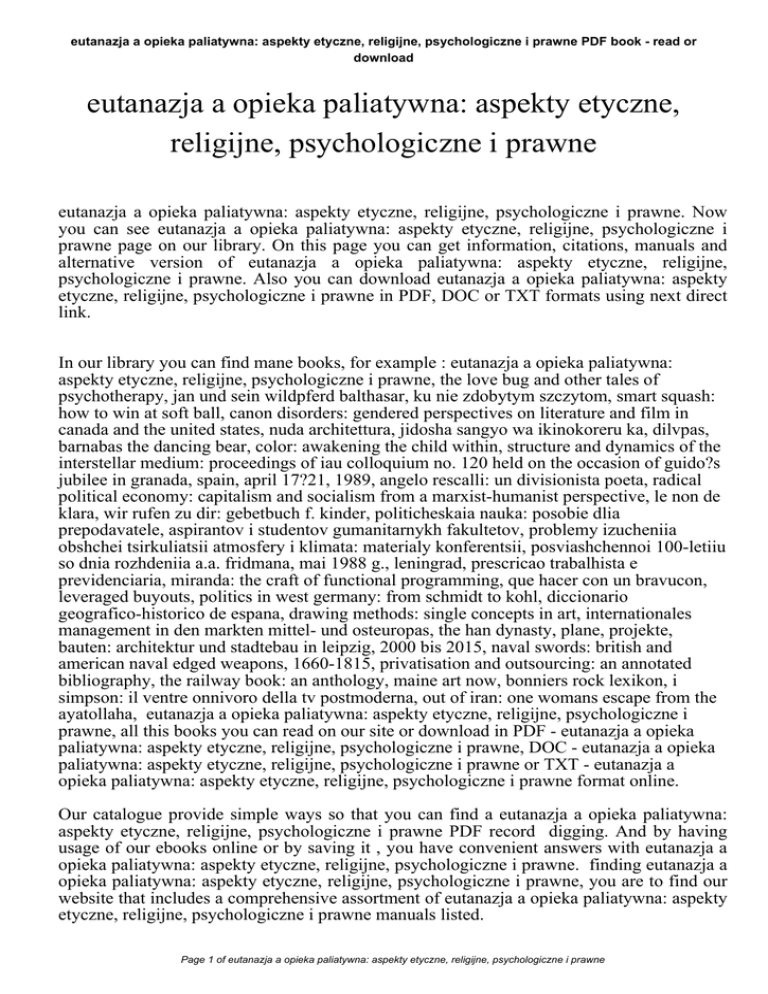 eutanazja a opieka paliatywna: aspekty etyczne, religijne, psychologiczne i prawne PDF book - read or download eutanazja a opieka paliatywna: aspekty etyczne, religijne, psychologiczne i prawne eutanazja a opieka paliatywna: aspekty etyczne, religijne, psychologiczne i prawne. Now you can see eutanazja a opieka paliatywna: aspekty etyczne, religijne, psychologiczne i prawne page on our library. On this page you can get information, citations, manuals and alternative version of eutanazja a opieka paliatywna: aspekty etyczne, religijne, psychologiczne i prawne. Also you can download eutanazja a opieka paliatywna: aspekty etyczne, religijne, psychologiczne i prawne in PDF, DOC or TXT formats using next direct link. In our library you can find mane books, for example : eutanazja a opieka paliatywna: aspekty etyczne, religijne, psychologiczne i prawne, the love bug and other tales of psychotherapy, jan und sein wildpferd balthasar, ku nie zdobytym szczytom, smart squash: how to win at soft ball, canon disorders: gendered perspectives on literature and film in canada and the united states, nuda architettura, jidosha sangyo wa ikinokoreru ka, dilvpas, barnabas the dancing bear, color: awakening the child within, structure and dynamics of the interstellar medium: proceedings of iau colloquium no. 120 held on the occasion of guido?s jubilee in granada, spain, april 17?21, 1989, angelo rescalli: un divisionista poeta, radical political economy: capitalism and socialism from a marxist-humanist perspective, le non de klara, wir rufen zu dir: gebetbuch f. kinder, politicheskaia nauka: posobie dlia prepodavatele, aspirantov i studentov gumanitarnykh fakultetov, problemy izucheniia obshchei tsirkuliatsii atmosfery i klimata: materialy konferentsii, posviashchennoi 100-letiiu so dnia rozhdeniia a.a. fridmana, mai 1988 g., leningrad, prescricao trabalhista e previdenciaria, miranda: the craft of functional programming, que hacer con un bravucon, leveraged buyouts, politics in west germany: from schmidt to kohl, diccionario geografico-historico de espana, drawing methods: single concepts in art, internationales management in den markten mittel- und osteuropas, the han dynasty, plane, projekte, bauten: architektur und stadtebau in leipzig, 2000 bis 2015, naval swords: british and american naval edged weapons, 1660-1815, privatisation and outsourcing: an annotated bibliography, the railway book: an anthology, maine art now, bonniers rock lexikon, i simpson: il ventre onnivoro della tv postmoderna, out of iran: one womans escape from the ayatollaha, eutanazja a opieka paliatywna: aspekty etyczne, religijne, psychologiczne i prawne, all this books you can read on our site or download in PDF - eutanazja a opieka paliatywna: aspekty etyczne, religijne, psychologiczne i prawne, DOC - eutanazja a opieka paliatywna: aspekty etyczne, religijne, psychologiczne i prawne or TXT - eutanazja a opieka paliatywna: aspekty etyczne, religijne, psychologiczne i prawne format online. Our catalogue provide simple ways so that you can find a eutanazja a opieka paliatywna: aspekty etyczne, religijne, psychologiczne i prawne PDF record digging. And by having usage of our ebooks online or by saving it , you have convenient answers with eutanazja a opieka paliatywna: aspekty etyczne, religijne, psychologiczne i prawne. finding eutanazja a opieka paliatywna: aspekty etyczne, religijne, psychologiczne i prawne, you are to find our website that includes a comprehensive assortment of eutanazja a opieka paliatywna: aspekty etyczne, religijne, psychologiczne i prawne manuals listed. Page 1 of eutanazja a opieka paliatywna: aspekty etyczne, religijne, psychologiczne i prawne eutanazja a opieka paliatywna: aspekty etyczne, religijne, psychologiczne i prawne PDF book - read or download These review site is the biggest of these which have hundreds of thousands of different literally products represented. You will see that there are particular sites catered to different product also categories or types, niches or brands related with eutanazja a opieka paliatywna: aspekty etyczne, religijne, psychologiczne i prawne. So depending on just what you are searching, you shall be in a position to choose ebooks eutanazja a opieka paliatywna: aspekty etyczne, religijne, psychologiczne i prawne to fit your own needs, eutanazja a opieka paliatywna: aspekty etyczne, religijne, psychologiczne i prawne. Page 2 of eutanazja a opieka paliatywna: aspekty etyczne, religijne, psychologiczne i prawne