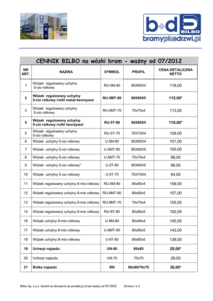 CENNIK BILBO na wózki bram - waŜny od 07/2012 NR ART. NAZWA SYMBOL PROFIL CENA DETALICZNA NETTO RU-5M-80 80X80X4 116,00 1 Wózek regulowany uchylny 5-cio rolkowy 2 Wózek regulowany uchylny 5-cio rolkowy /rolki metal-tworzywo/ RU-5MT-80 80X80X5 115,00* 3 Wózek regulowany uchylny 5-cio rolkowy RU-5MT-70 70x70x4 113,00 4 Wózek regulowany uchylny 5-cio rolkowy /rolki tworzywo/ RU-5T-80 80X80X5 110,00* 5 Wózek regulowany uchylny 5-cio rolkowy RU-5T-70 70X70X4 109,00 6 Wózek uchylny 5-cio rolkowy U-5M-80 80X80X4 101,00 7 Wózek uchylny 5-cio rolkowy U-5MT-80 80X80X5 100,00 8 Wózek uchylny 5-cio rolkowy U-5MT-70 70x70x4 99,00 9 Wózek uchylny 5-cio rolkowy* U-5T-80 80X80X5 96,00 10 Wózek uchylny 5-cio rolkowy U-5T-70 70X70X4 94,00 11 Wózek regulowany uchylny 8-mio rolkowy RU-8M-80 80x80x4 159,00 12 Wózek regulowany uchylny 8-mio rolkowy RU-8MT-80 80x80x5 157,00 13 Wózek regulowany uchylny 8-mio rolkowy RU-8MT-70 70x70x4 155,00 14 Wózek regulowany uchylny 8-mio rolkowy RU-8T-80 80x80x5 152,00 16 Wózek uchylny 8-mio rolkowy U-8M-80 80x80x4 145,00 17 Wózek uchylny 8-mio rolkowy U-8MT-80 80x80x5 143,00 18 Wózek uchylny 8-mio rolkowy U-8T-80 80x80x5 139,00 19 Uchwyt najazdu UN-80 80x80 29,00* 20 Uchwyt najazdu UN-70 70x70 29,00 21 Rolka najazdu RN 80x80/70x70 36,00* Bilbo Sp. z o.o. Cennik na akcesoria do produkcji bram waŜny od 07/2012 Strona 1 z 2 22 Rolka prowadząca fi 43 23 Rolka prowadząca fi 43 z kompletem montaŜowym 24 Rolka prowadząca fi 34 25 26 27 28 Rolka prowadząca fi 34 z kompletem montaŜowym Listwa zębata metalowa 8mm – 1000mm Listwa zębata metalowa 10mm – 1000mm Listwa zębata z tworzywa, z rdzeniem stalowym w odcinkach 0,33mm – cena za 1000mm T43 Ceownik 50 6,00* T43+kpl Ceownik 50 17,00 T34 Ceownik 40 6,00* T34+kpl Ceownik 40 17,00 RI.M4F-8 M4 31,00* RI.M4F-10 M4 43,00* RI.M4P M4 43,00* 29 Listwa zębata metalowa 22x22x2000m RI.M4Z M4 50,00/metr 30 Listwa zębata metalowa 30x30x2000mm RI.M6Z M6 150,00/metr *na stanach magazynowych BILBO Sp. z o.o. , pozostały asortyment na zamówienie czas realizacji 7-14 dni roboczych. R-regulowany U-uchylny M – rolka metalowa T-rolka tworzywowa Dla zarejestrowanych odbiorców hurtowych firmy BILBO, od powyŜszych cen ustalony indywidualnie rabat. Wysyłka firmą kurierską OPEK wg wagi zamówienia do 10kg 20zł+VAT, do 20kg 24zł+VAT, do 30kg 28zł+VAT. Bilbo Sp. z o.o. Cennik na akcesoria do produkcji bram waŜny od 07/2012 Strona 2 z 2