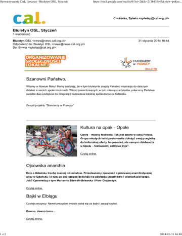 Stowarzyszenie CAL (poczta) - Biuletyn OSL, Styczeń 1z2 https://mail.google.com/mail/u/0/?ui=2&ik=213b13fb45&view=pt&se... Choińska, Sylwia <[email protected]> Biuletyn OSL, Styczeń 1 wiadomość Biuletyn OSL <[email protected]> Odpowiedź do: Biuletyn OSL <[email protected]> Do: Sylwia <[email protected]> 31 stycznia 2014 16:44 Szanowni Państwo, Witamy w Nowym Roku! Mamy nadzieję, że w tym biuletynie znajdą Państwo inspirację do dalszych działań w swoich społecznościach. Wśród prezentowanych w tym miesiącu artykułów, polecamy Państwa uwadze dwa podejścia do integracji i budowania lokalnej społeczności w Gdańsku. Zespół projektu "Standardy w Pomocy" Kultura na opak - Opole Opole – miasto festiwalu. Tak jest znane w całej Polsce. Grupa młodych ludzi postanowiła dołożyć swoją cegiełkę do kulturalnej oferty, bo przecież„nie samym chlebem (a w Opolu – festiwalem) człowiek żyje”. Czytaj online. Ojcowska anarchia Dziś o Gdańsku trochę inaczej niż ostatnio. Przestawiamy opowieść o pierwszej anarchistycznej ulicy w Gdańsku i o tym, że aby czegoś dokonać nie potrzeba urzędników i wielkich pieniędzy. Jak? Opowiedzą o tym Marianna Sitek-Wróblewska i Piotr Olejarczyk. Czytaj online. Bajki w Elblągu Czytają wszyscy. Nawet prezydent miasta wziął się za bajki i zaczął czytać. Dawno, dawno temu… Czytaj online. 2014-01-31 16:48 Stowarzyszenie CAL (poczta) - Biuletyn OSL, Styczeń 2z2 https://mail.google.com/mail/u/0/?ui=2&ik=213b13fb45&view=pt&se... Dzwon – serce Głogoczowa Głogoczów - pomysł na wieś tematyczną okiem Ewy Chromniak - czyli, gdzie mogą Państwo zatrzymać się podróżując zakopianką? Czytaj online. Ważny jest człowiek Momentami miewałam chwile słabości i chęć by rzucić to wszystko, przyznaje Alicja Wioletta Tempes z Ośrodka Pomocy Społecznej w Mieroszowie w rozmowie z Moniką Makowiecką. Czytaj online. Nowa fala na Przymorzu My tylko chcemy, żeby mieszkańcom chciało się chcieć – mówi Lokalna Grupa, która formuje się w dzielnicy Gdańska Przymorze. Czytaj online. Rezygnacja 2014-01-31 16:48