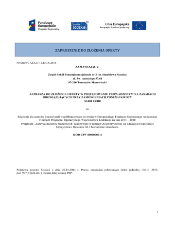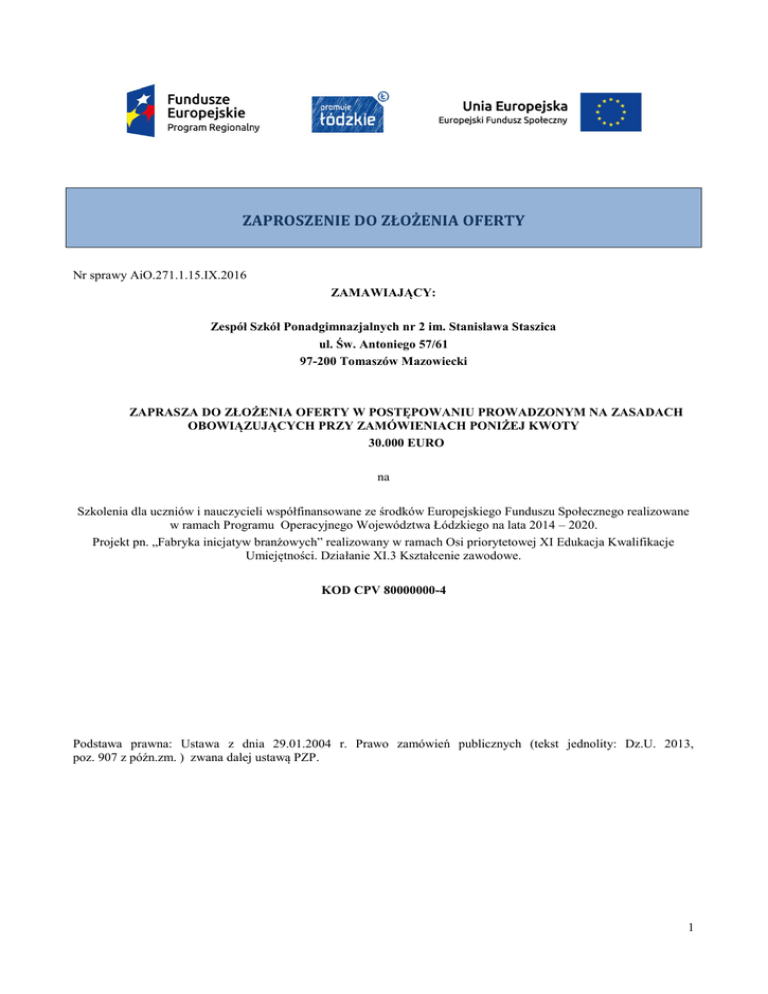 ZAPROSZENIE DO ZŁOŻENIA OFERTY Nr sprawy AiO.271.1.15.IX.2016 ZAMAWIAJĄCY: Zespół Szkół Ponadgimnazjalnych nr 2 im. Stanisława Staszica ul. Św. Antoniego 57/61 97-200 Tomaszów Mazowiecki ZAPRASZA DO ZŁOŻENIA OFERTY W POSTĘPOWANIU PROWADZONYM NA ZASADACH OBOWIĄZUJĄCYCH PRZY ZAMÓWIENIACH PONIŻEJ KWOTY 30.000 EURO na Szkolenia dla uczniów i nauczycieli współfinansowane ze środków Europejskiego Funduszu Społecznego realizowane w ramach Programu Operacyjnego Województwa Łódzkiego na lata 2014 – 2020. Projekt pn. „Fabryka inicjatyw branżowych” realizowany w ramach Osi priorytetowej XI Edukacja Kwalifikacje Umiejętności. Działanie XI.3 Kształcenie zawodowe. KOD CPV 80000000-4 Podstawa prawna: Ustawa z dnia 29.01.2004 r. Prawo zamówień publicznych (tekst jednolity: Dz.U. 2013, poz. 907 z późn.zm. ) zwana dalej ustawą PZP. 1 ROZDZIAŁ I Opis przedmiotu zamówienia 1.1. Przedmiotem ogłoszenia jest przeprowadzenie szkoleń dla uczniów i nauczycieli w Projekcie pn. „Fabryka inicjatyw branżowych” realizowanym przez Zespół Szkół Ponadgimnazjalnych nr 2 im. St. Staszica w Tomaszowie Mazowieckim w ramach Programu Operacyjnego Województwa Łódzkiego na lata 2014 – 2020. 1.2.Przedmiot zamówienia składa się z jednego zadania: Przeprowadzenie zestawu szkoleń z zakresu: 1. „Kurs animatora czasu wolnego” w wymiarze 18 godzin na grupę 2. „Kurs pilotażu wycieczek” w wymiarze 40 godzin na grupę 3. „Kurs rezydent turystyczny” w wymiarze 18 godzin na grupę Miejsce szkolenia – siedziba Zamawiającego Zespół Szkół Ponadgimnazjalnych nr 2 im. ST. Staszica 97-200 Tomaszów Mazowiecki ul. Św. Antoniego 57/61. W przypadku nauczycieli zamawiający dopuszcza miejsce realizacji szkolenia wskazane przez Wykonawcę. Dla grupy uczniów zamawiający dopuszcza inną kolejność przeprowadzanych szkoleń uzasadnioną efektywnością kształconych umiejętności. Terminy realizacji 1. „Kurs animatora czasu wolnego” Grupa 1 nauczyciele – 2 osoby 1.10.2016 – 30.11.2016 r. Grupa 2 uczniowie Technikum – 12 osób - 1.10.2016 – 30.11.2016 r.. 2. „Kurs pilotażu wycieczek” Grupa 1 nauczyciele – 1 osoba 1.10.2016 – 30.12.2016 r. Grupa 2 uczniowie Technikum – 12 osób - 30.11.2016 – 30.03.2017 r.. 3. „Kurs rezydent turystyczny” w wymiarze 18 godzin Grupa 2 uczniowie Technikum – 12 osób - 01.04.2017 – 23.06.2017 r.. Zakres obowiązków – Do obowiązków Podmiotu wykonującego zadanie należeć będzie: a) Dbałość o prawidłowy przebieg szkoleń, b) Rzetelne i efektywne wykonywanie powierzonych zadań, c) Dokładne i sumienne wykonywanie zadań określonych przez Podmiot Zarządzający, d) Bieżące informowanie Podmiotu Zarządzającego i dyrektora Zespołu Szkół Ponadgimnazjalnych nr 2 w Tomaszowie Maz. o stanie realizowanych zadań, e) Ścisłe i terminowe rozliczanie się z powierzonych zadań za pośrednictwem notatek służbowych, raportów mailowych, Przestrzeganie ustalonego w projekcie porządku technicznego, sprzętowego i dokumentacyjnego w odniesieniu do procesu szkoleniowego, f) g) Znajomość Regulaminu Rekrutacyjnego i Regulaminu Organizacyjnego zamieszczonego na podstronie internetowej projektu oraz treści wniosku o dofinansowanie w części dotyczącej realizacji powierzonego zadania, h) Przygotowanie i realizacja działań szkoleniowych zgodnie z programem ramowym. W szczególności: 1. opracowanie szczegółowego programu szkolenia uwzględniającego treści opisane językiem efektów kształcenia 2. zapewnienie materiałów szkoleniowych niezbędnych do prawidłowego przeprowadzenia szkolenia. 3. monitorowanie frekwencji uczestników szkolenia. rzetelne prowadzenie dokumentacji przebiegu szkolenia: dziennika zajęć edukacyjnych zawierającego tematy i wymiar godzin zajęć edukacyjnych, b) listy obecności zawierającej: imię, nazwisko i podpis uczestnika szkolenia, zgodnie ze wzorem przekazanym przez zamawiającego, c) rejestru wydanych zaświadczeń/certyfikatów potwierdzających ukończenie szkolenia i uzyskanie umiejętności lub kwalifikacji, zawierającego: numer, imię i nazwisko oraz nr PESEL uczestnika a) 2 4. 5. szkolenia, a w przypadku cudzoziemca nr dokumentu stwierdzającego tożsamość, oraz nazwę szkolenia i datę wydania zaświadczenia. Przeprowadzenia anonimowej ankiety służącej do oceny szkolenia przez uczestników, zgodnie ze wzorem przekazanym przez zamawiającego. przeprowadzenie dwukrotnego pomiaru poziomu wiedzy i ukształtowanych umiejętności ( przed i po szkoleniu) oraz zagregowanie wyników, zgodnie ze wzorem przekazanym przez zamawiającego 6. przeprowadzenie zgodnie z planem szkolenia i harmonogramem zatwierdzonym przez dyrektora szkoły, 7. Wydania uczestnikowi szkolenia zaświadczenia/certyfikatu poświadczającego zakończenie szkolenia i nabycie umiejętności/kompetencji. Do wydawanych zaświadczeń wymagane jest załączenie również suplementu zawierającego zakres oraz liczbę godzin poszczególnych zajęć edukacyjnych. Kserokopii potwierdzonego za zgodność kopii z oryginałem zaświadczenia/certyfikatu zapewnienie kosztów dojazdu trenera na miejsce szkolenia oraz wyżywienia i zakwaterowania trenera w trakcie szkolenia 8. 9. 1.3. Zamawiający dopuszcza składanie ofert częściowych ROZDZIAŁ II Warunki udziału w postępowaniu. O udzielenie zamówienia publicznego mogą się ubiegać: 1. Wykonawcy, którzy nie podlegają wykluczeniu z postępowania o zamówienia publiczne 2. Wykonawcy spełniający poniższe warunki: 1) Posiadają uprawnienia do wykonywania działalności szkoleniowej. Zamawiający uzna, że wykonawca posiada uprawnienia do wykonywania działalności szkoleniowej na podstawie złożonego oświadczenia. 2) Posiadają wiedzę i doświadczenie do wykonania zamówienia. Zamawiający uzna, że wykonawca posiada wiedzę i doświadczenie niezbędne do zrealizowania zamówienia, jeżeli: w okresie ostatnich 3 lat przed upływem terminu s