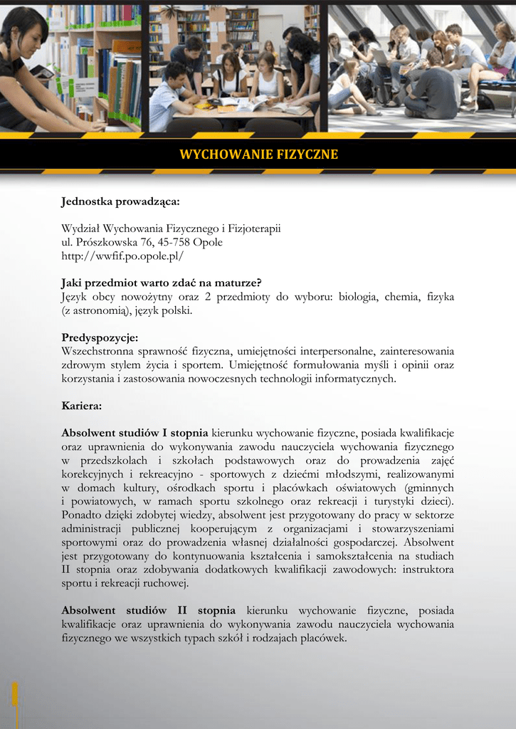 WYCHOWANIE FIZYCZNE Jednostka prowadząca: Wydział Wychowania Fizycznego i Fizjoterapii ul. Prószkowska 76, 45-758 Opole http://wwfif.po.opole.pl/ Jaki przedmiot warto zdać na maturze? Język obcy nowożytny oraz 2 przedmioty do wyboru: biologia, chemia, fizyka (z astronomią), język polski. Predyspozycje: Wszechstronna sprawność fizyczna, umiejętności interpersonalne, zainteresowania zdrowym stylem życia i sportem. Umiejętność formułowania myśli i opinii oraz korzystania i zastosowania nowoczesnych technologii informatycznych. Kariera: Absolwent studiów I stopnia kierunku wychowanie fizyczne, posiada kwalifikacje oraz uprawnienia do wykonywania zawodu nauczyciela wychowania fizycznego w przedszkolach i szkołach podstawowych oraz do prowadzenia zajęć korekcyjnych i rekreacyjno - sportowych z dziećmi młodszymi, realizowanymi w domach kultury, ośrodkach sportu i placówkach oświatowych (gminnych i powiatowych, w ramach sportu szkolnego oraz rekreacji i turystyki dzieci). Ponadto dzięki zdobytej wiedzy, absolwent jest przygotowany do pracy w sektorze administracji publicznej kooperującym z organizacjami i stowarzyszeniami sportowymi oraz do prowadzenia własnej działalności gospodarczej. Absolwent jest przygotowany do kontynuowania kształcenia i samokształcenia na studiach II stopnia oraz zdobywania dodatkowych kwalifikacji zawodowych: instruktora sportu i rekreacji ruchowej. Absolwent studiów II stopnia kierunku wychowanie fizyczne, posiada kwalifikacje oraz uprawnienia do wykonywania zawodu nauczyciela wychowania fizycznego we wszystkich typach szkół i rodzajach placówek. WYCHOWANIE FIZYCZNE Absolwent jest przygotowany do kontynuowania kształcenia i samokształcenia na studiach III stopnia oraz zdobywania dodatkowych kwalifikacji zawodowych w sporcie. Absolwent specjalności nauczycielsko – instruktorskiej ma formalne uprawnienia do prowadzenia zajęć sportowych i rekreacyjnych w ramach sportu szkolnego oraz rekreacji i turystyki kwalifikowanej w określonej dyscyplinie sportu. Ma wiedzę teoretyczną i umiejętności praktyczne z zakresu treningu sportowego. Absolwent specjalności nauczycielsko – trenerskiej posiada uprawnienia trenera klasy II w wybranej dyscyplinie sportu. Trener klasy drugiej, posiada uprawnienia do samodzielnego planowania, organizowania, prowadzenia i kontroli procesu szkolenia sportowego w danej dyscyplinie sportu i jest przygotowany do prowadzenia zajęć w klubach sportowych oraz zajęć w ramach sportu szkolnego i sportu osób niepełnosprawnych. STUDIA PIERWSZEGO STOPNIA Studia trwają 6 semestrów, w formie studiów stacjonarnych lub niestacjonarnych. Kierunek studiów przyporządkowany jest do obszaru kształcenia nauk medycznych, nauk o zdrowiu oraz nauk o kulturze fizycznej. Program kształcenia na studiach I stopnia na kierunku wychowanie fizyczne oferuje wykształcenie elit wysoko wykwalifikowanych kadr kultury fizycznej, a gruntowne przygotowanie teoretyczno - sprawnościowe absolwenta tego kierunku, umożliwia mu kompleksową realizacji zadań dydaktycznych, wychowawczych i opiekuńczych. Dzięki uzyskaniu i opanowaniu specyficznych umiejętności i sprawności zawodowych, absolwent jest zdolny do nauczania ruchu i usprawniania ciała oraz do samodzielnego diagnozowania, planowania, programowania i realizacji procesu kształtowania pożądanych postaw, rozwijania sprawności fizycznej oraz promowania zdrowia i aktywności fizycznej w miejscu pracy i środowisku lokalnym oraz ewaluacji tego procesu. Ponadto student I stopnia na kierunku wychowanie fizyczne ma możliwość zrealizowania jednego semestru lub całego roku studiów, na jednej z uczelni partnerskich w ramach programu międzynarodowej wymiany stypendialnej LLP Erasmus. Zgodnie ze standardami kształcenia nauczycieli, absolwent studiów I stopnia jest pedagogiem wszechstronnie przygotowanym do kompleksowej realizacji zadań kształcących, wychowawczych i opiekuńczych. WYCHOWANIE FIZYCZNE Absolwent zna język obcy na poziomie biegłości B1 Europejskiego Systemu Opisu Kształcenia Językowego oraz umie posługiwać się językiem specjalistycznym z zakresu nauk o kulturze fizycznej. STUDIA DRUGIEGO STOPNIA Studia trwają 4 semestry, w formie studiów stacjonarnych lub niestacjonarnych. Kierunek studiów przyporządkowany jest do obszaru kształcenia nauk medycznych, nauk o zdrowiu oraz nauk o kulturze fizycznej. Kształcenie realizowane jest na specjalności nauczycielsko-trenerskiej lub nauczycielskoinstruktorskiej w bezpośrednim kontakcie w zakresie rozwijania wiedzy, sprawności fizycznej oraz twórczych postaw i silnie rozwijających się osobowości. Studia II stopnia na kierunku Wychowanie Fizyczne, mają na celu wykształcenie absolwenta, który jest przygotowany do wypełniania funkcji kształcących, wychowawczych i opiekuńczych nauczyciela wychowania fizycznego we wszystkich rodzajach szkół i placówek oświatowych oraz w klubach i organizacjach sportowych. Absolwent jest przygotowany do kontynuowania kształcenia i samokształcenia na studiach III stopnia oraz zdobywania dodatkowych kwalifikacji zawodowych w sporcie. Zgodnie ze standardami kształcenia nauczycieli oraz instruktorów sportu i trenerów, absolwent posiada kompetencje prakseologiczne, komunikacyjne, współdziałania, moralne i informatyczne. Pozytywna ocena Polskiej Komisji Akredytacyjnej, jaką uzyskał kierunek studiów wychowanie fizyczne na I i II stopniu studiów gwarantuje wysoką jakość kształcenia. Studenci mogą również korzystać z bogatej oferty AZS KU Politechniki Opolskiej. Oprócz wielu sekcji rekreacyjnych (m.in. aerobik, kulturystyka, pływanie, zespołowe gry sportowe, wspinaczka, akrobatyka, łyżwiarstwo, narciarstwo, szermierka, sporty walki, badminton), mogą kontynuować karierę sportową w sekcjach wyczynowych. UWAGA: WYCHOWANIE FIZYCZNE Na kierunek wychowanie sprawnościowego. Opole dn. 30 maja 2014r. fizyczne NIE MA wstępnego egzaminu