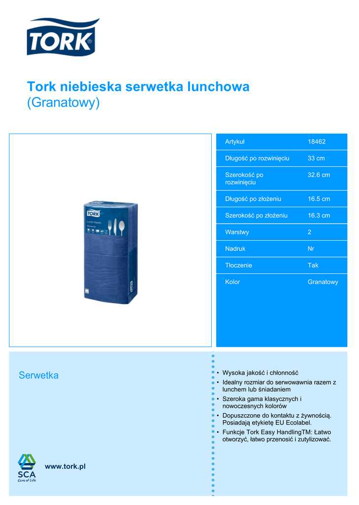 Tork niebieska serwetka lunchowa (Granatowy) Serwetka www.tork.pl Artykuł 18462 Długość po rozwinięciu 33 cm Szerokość po rozwinięciu 32.6 cm Długość po złożeniu 16.5 cm Szerokość po złożeniu 16.3 cm Warstwy 2 Nadruk Nr Tłoczenie Tak Kolor Granatowy • Wysoka jakość i chłonność • Idealny rozmiar do serwowawnia razem z lunchem lub śniadaniem • Szeroka gama klasycznych i nowoczesnych kolorów • Dopuszczone do kontaktu z żywnością. Posiadają etykietę EU Ecolabel. • Funkcje Tork Easy HandlingTM: Łatwo otworzyć, łatwo przenosić i zutylizować. Informacje o opakowaniu Opakowanie pojedyncze Opakowanie transportowe Paleta EAN 9011111189042 9011111184627 7322540256048 Sztuki 250 2500 50000 Opakowania pojedyncze - 10 200 Wysokość 120 mm 350 mm 1900 mm Szerokość 165 mm 348 mm 800 mm Długość 330 mm 598 mm 1200 mm Objętość 6.5 dm3 72.8 dm3 1.5 m3 Waga netto 888 g 8.9 kg 177.51 kg Waga brutto 917 g 9.9 kg 198.3 kg Rodzaj opakowania - Carton - Dopasowane serwetki i produkty do nakrycia stołu 19387 18346 Alternatywne produkty Certyfikaty produktu Kontakt SCA Hygiene Sp. z o.o. ul. Puławska 435A 02-801 Warszawa, Polska Tel.: +48 22 543 75 00 Faks: +48 22 543 75 01 Tork jest marką grupy SCA, Svenska Cellulosa Aktiebolaget. Grupa SCA oferuje artykuły higieniczne oraz produkty pochodzenia drzewnego w ponad 100 krajach. Więcej informacji można znaleźć pod adresem www.sca.com www.tork.pl 18770