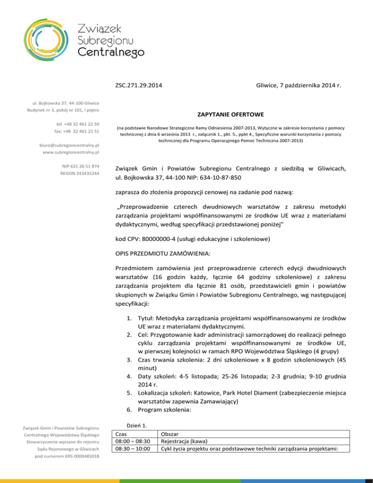 Gliwice, 7 paździer ika ZSC.271.29.2014 r. ul. Bojkowska 37, 44-100 Gliwice Bud ek r , pokój r , I piętro tel. +48 32 461 22 50 fax: +48 32 461 22 51 [email protected] ZAPYTANIE OFERTOWE (na podstawie Narodowe Strategiczne Ramy Odniesienia 2007-2013, Wytyczne w zakresie korzystania z pomocy technicznej z dnia wrześ ia r., załą z ik ., pkt. 5., ppkt 4., Specyficzne warunki korzystania z pomocy technicznej dla Programu Operacyjnego Pomoc Techniczna 2007-2013) www.subregioncentralny.pl NIP 631 26 51 874 REGON 243435244 )wiązek G i i Powiatów Su regio u Centralnego z siedzi ą w Gliwi a h, ul. Bojkowska 37, 44-100 NIP: 634-10-87-850 zaprasza do złoże ia propoz ji e owej a zada ie pod azwą: „Przeprowadze ie ztere h dwudniowych warsztatów z zakresu metodyki zarządza ia projekta i współfi a sowa i ze środków UE wraz z ateriała i d dakt z i, według spe fika ji przedstawio ej po iżej” kod CPV: 80000000-4 usługi eduka j e i szkole iowe OPIS PRZEDMIOTU ZAMÓWIENIA: Przedmiotem zamówienia jest przeprowadzenie czterech edycji dwudniowych warsztatów godzi każd , łą z ie godzi szkole iowe z zakresu zarządza ia projekte dla łą z ie 8 osó , przedstawi ieli g i i powiatów skupio h w )wiązku G i i Powiatów Su regio u Ce tral ego, wg astępują ej specyfikacji: 1. T tuł: Metod ka zarządza ia projekta i współfi a sowa i ze środków UE wraz z ateriała i d dakt z i. 2. Cel: Prz gotowa ie kadr ad i istra ji sa orządowej do realiza ji peł ego klu zarządza ia projekta i współfi a sowa i ze środków UE, w pierwszej kolej oś i w ra a h RPO Województwa Śląskiego grup 3. Czas trwania szkolenia: 2 dni szkoleniowe x 8 godzin szkoleniowych (45 minut) 4. Dat szkoleń: -5 listopada; 25-26 listopada; 2-3 grudnia; 9-10 grudnia 2014 r. 5. Lokaliza ja szkoleń: Katowice, Park Hotel Diament (zabezpieczenie miejsca warsztatów zapew ia )a awiają 6. Program szkolenia: )wiązek G i i Powiatów Subregionu Ce tral ego Województwa Śląskiego Stowarzyszenie wpisane do rejestru Sądu Rejonowego w Gliwicach pod numerem KRS 0000485018 Dzień . Czas 08:00 – 08:30 08:30 – 10:00 Obszar Rejestracja (kawa) C kl ż ia projektu oraz podstawowe te h iki zarządza ia projekta i: ul. Bojkowska 37, 44-100 Gliwice Bud ek r , pokój r , I piętro tel. +48 32 461 22 50 10:00 – 10:30 10:30 – 12:00 fax: +48 32 461 22 51 [email protected] www.subregioncentralny.pl 12:00 – 12:30 12:30 – 14:00 NIP 631 26 51 874 REGON 243435244 14:00 – 14:30 14:30 – 16:00 16:00 - inicjowanie projektów - planowanie projektów - realizacja projektów - kontrola i monitoring Przerwa kawowa Podstawowe założe ia Regio al ego Progra u Opera j ego Województwa Śląskiego a lata , w t podejś ie )IT oraz ko ple e tar ość do krajow h programów operacyjnych Lunch I i jowa ie i pla owa ie projektów: głów e ele e t studiu w ko al oś i i w iosku o dofi a sowa ie. Sesja I: Projekt i frastruktural e uzasad ie ie i diag oza, w t źródła i for a ji, ele, wskaź iki, a aliza waria tów i west j h, har o ogra realiza ji, matryca logiczna projektu, dokumentacja projektowa) Przerwa kawowa I i jowa ie i pla owa ie projektów: głów e ele e t studiu w ko al oś i i w iosku o dofi a sowa ie. Sesja II: Projekt iękkie określe ie grup do elowej, uzasad ie ie - analiza potrzeb, cele, wskaź iki )akoń ze ie Dzień . Czas 08:00 – 08:30 08:30 – 10:00 10:00 – 10:30 10:30 – 12:00 12:00 – 12:30 12:30 – 14:00 14:00 – 14:30 14:30 – 15:30 15:30 – 16:00 16:00 )wiązek G i i Powiatów Subregionu Ce tral ego Województwa Śląskiego Stowarzyszenie wpisane do rejestru Sądu Rejonowego w Gliwicach pod numerem KRS 0000485018 Obszar Rejestracja (kawa) I i jowa ie i pla owa ie projektów: głów e ele e t studiu w ko al oś i i w iosku o dofi a sowa ie. Sesja III: udżetowa ie projektów, określa ie pozio u dofi a sowa ia i luki fi a sowej, zagadnienia pomocy publicznej i pomocy de minimis Przerwa kawowa Pla owa ie i realiza ja projektów z zakresu efekt w oś i e erget z ej i o hro środowiska; uwaru kowa ia i rozwiąza ia sz zegółowe wraz z uwaru kowa ia i dot zą i ko ple e tar oś i z POIŚ Lunch Pla owa ie i realiza ja projektów z zakresu usług społe z h, o hro zdrowia i r ku pra ; uwaru kowa ia i rozwiąza ia sz zegółowe wraz z uwaru kowa ia i dot zą i powiązań z LPR oraz kr teria i rewitalizacji) Przerwa kawowa Pla owa ie i realiza ja projektów z zakresu eduka ji i adapta j oś i przedsię iorstw; uwaru kowa ia i rozwiąza ia sz zegółowe wraz z uwarunkowaniami pomoc y publicznej/de minimis) )ar s założeń dot zą h realiza ji, ko troli i onitoringu projektów w ramach RPO, w tym ZIT )akoń ze ie 7. Warsztat prowadzo e ędą w astępują h grupa h: a) 04.11.2014 – 05.11.2014 grupa ok. 20 osób b) 25.11.2014 – 26.11.2014 grupa ok. 20 osób c) 02.12.2014 – 03.12.2014 grupa ok. 20 osób d) 09.12.2014 – 10.12.2014 grupa ok. 21 osób 8. Warsztatów od wają się w ra a h projektu realizowa ego przez )wiązek G i i Powiatów Su regio u Ce tral ego, współfi a sowa ego ze środków U ii Europejskiej w ra a h Progra u Opera j ego Po o Techniczna. ul. Bojkowska 37, 44-100 Gliwice Bud ek r , pokój r , I piętro tel. +48 32 461 22 50 fax: +48 32 461 22 51 [email protected] www.subregioncentralny.pl NIP 631 26 51 874 REGON 243435244 PROPOZYCJA POWINNA ZAWIERAĆ NASTĘPUJĄCE DOKUMENTY: ofertę e ową zapytania, a for ularzu ofertow sta owią załą z ik r do podpisa e, opie zętowa e oświad ze ie o raku powiązań kapitałow h oraz 1 oso ow h z )a awiają – załą z ik r , FORMA PŁATNOŚCI: Płat ość koń owa a podstawie protokołu od ioru ałoś iowo zrealizowanej usługi. MIEJSCE I TERMIN ZŁOŻENIA PROPOZYCJI CENOWEJ: Propoz ję e ową ależ przesłać w for ie elektro i z ej [email protected] do dnia 15.10.2014r. (do godz. 12.00). a adres W ko aw a zo owiąza jest do telefo i z ego potwierdze ia otrz a ia ofert przez )a awiają ego. )a awiają ie odpowiada za pro le w ikają e z iep