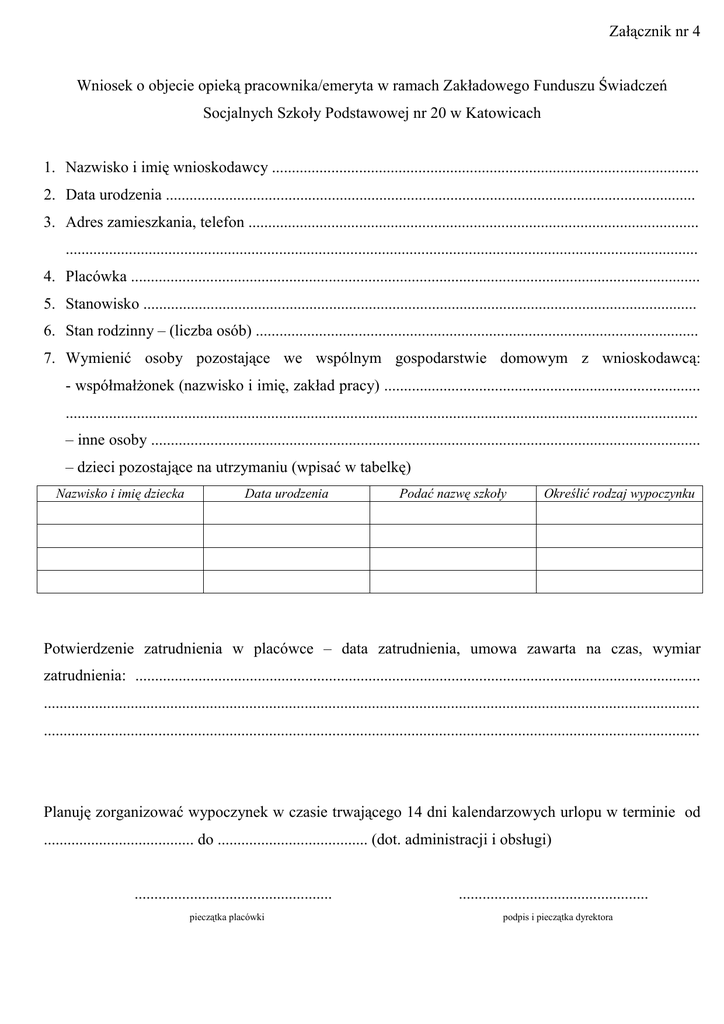 Załącznik nr 4 Wniosek o objecie opieką pracownika/emeryta w ramach Zakładowego Funduszu Świadczeń Socjalnych Szkoły Podstawowej nr 20 w Katowicach 1. Nazwisko i imię wnioskodawcy ............................................................................................................ 2. Data urodzenia ...................................................................................................................................... 3. Adres zamieszkania, telefon .................................................................................................................. ................................................................................................................................................................ 4. Placówka ................................................................................................................................................ 5. Stanowisko ............................................................................................................................................ 6. Stan rodzinny – (liczba osób) ................................................................................................................ 7. Wymienić osoby pozostające we wspólnym gospodarstwie domowym z wnioskodawcą: - współmałżonek (nazwisko i imię, zakład pracy) ................................................................................ ................................................................................................................................................................ – inne osoby ........................................................................................................................................... – dzieci pozostające na utrzymaniu (wpisać w tabelkę) Nazwisko i imię dziecka Data urodzenia Podać nazwę szkoły Określić rodzaj wypoczynku Potwierdzenie zatrudnienia w placówce – data zatrudnienia, umowa zawarta na czas, wymiar zatrudnienia: ............................................................................................................................................... ...................................................................................................................................................................... ...................................................................................................................................................................... Planuję zorganizować wypoczynek w czasie trwającego 14 dni kalendarzowych urlopu w terminie od ...................................... do ...................................... (dot. administracji i obsługi) .................................................. pieczątka placówki ................................................ podpis i pieczątka dyrektora miesięczny Średni dochód brutto z 3 ostatnich miesięcy w mojej rodzinie wynosi .................................................................................................................................................. zł na osobę. Wnoszę o objęcie mnie i członków rodziny opieką socjalną, określoną Regulaminem Zakładowego Funduszu Świadczeń Socjalnych w Szkole Podstawowej nr 20 w Katowicach i potwierdzam zgodność powyższych danych własnoręcznym podpisem: ........................................................... data i podpis pracownika UWAGA: 1. W przypadku stwierdzenia we wniosku przez osobę uprawnioną nieprawdziwych informacji o sytuacji życiowej, rodzinnej i materialnej, bądź jej umyślnego zatajenia, korzystający w sposób bezprawny ze świadczenia z funduszu jest zobowiązany do natychmiastowego zwrotu całości pobranej kwoty świadczenia, a ponadto traci prawo do ubiegania się o świadczenia określone regulaminem przez okres jednego roku. 2. Podwójne świadczenia: § 6.2 Zatrudnienie obojga małżonków w Szkole Podstawowej nr 20 w Katowicach nie daje podstaw do przyznania ich rodzinie podwójnych świadczeń z tego tytułu 3. Wnioskodawca jest zobowiązany każdorazowo do zgłoszenia ewentualnych zmian dotyczących sytuacji życiowej, rodzinnej i materialnej. wypoczynek pracownika % wypoczynek dzieci % zielona szkoła zapomogi % dofin. do wycieczek % bilety pożyczki inne paczki dzieci