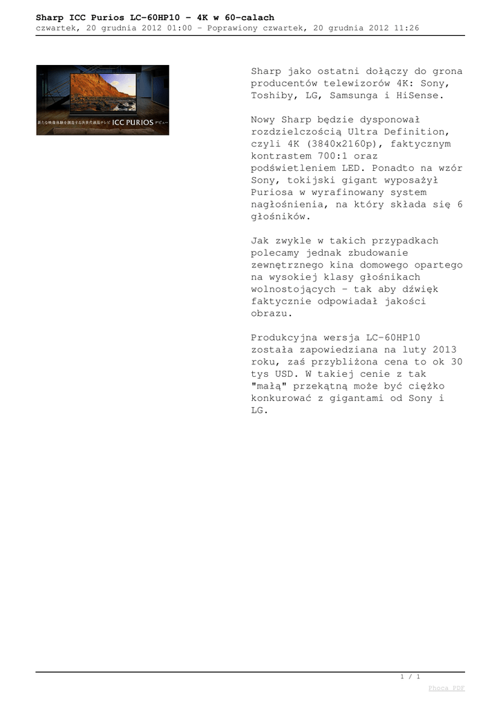 Sharp ICC Purios LC-60HP10 - 4K w 60-calach czwartek, 20 grudnia 2012 01:00 - Poprawiony czwartek, 20 grudnia 2012 11:26 Sharp jako ostatni dołączy do grona producentów telewizorów 4K: Sony, Toshiby, LG, Samsunga i HiSense. Nowy Sharp będzie dysponował rozdzielczością Ultra Definition, czyli 4K (3840x2160p), faktycznym kontrastem 700:1 oraz podświetleniem LED. Ponadto na wzór Sony, tokijski gigant wyposażył Puriosa w wyrafinowany system nagłośnienia, na który składa się 6 głośników. Jak zwykle w takich przypadkach polecamy jednak zbudowanie zewnętrznego kina domowego opartego na wysokiej klasy głośnikach wolnostojących - tak aby dźwięk faktycznie odpowiadał jakości obrazu. Produkcyjna wersja LC-60HP10 została zapowiedziana na luty 2013 roku, zaś przybliżona cena to ok 30 tys USD. W takiej cenie z tak "małą" przekątną może być ciężko konkurować z gigantami od Sony i LG. 1 / 1 Phoca PDF