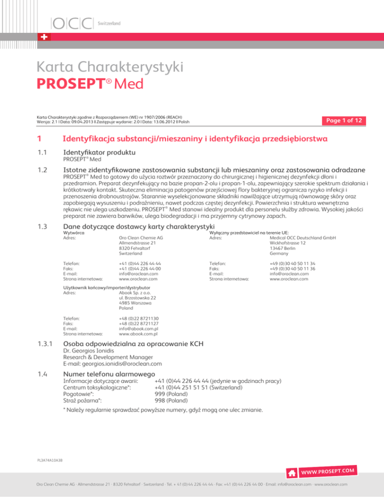 Karta Charakterystyki PROSEPT® Med Karta Charakterystyki zgodnie z Rozporządzeniem (WE) nr 1907/2006 (REACH) Wersja: 2.1 | Data: 09.04.2013 || Zastępuje wydanie: 2.0 | Data: 13.06.2012 || Polish Page 1 of 12 1 Identyfikacja substancji/mieszaniny i identyfikacja przedsiębiorstwa 1.1 Identyfikator produktu PROSEPT® Med 1.2 Istotne zidentyfikowane zastosowania substancji lub mieszaniny oraz zastosowania odradzane PROSEPT® Med to gotowy do użycia roztwór przeznaczony do chirurgicznej i higienicznej dezynfekcji dłoni i przedramion. Preparat dezynfekujący na bazie propan2olu i propan1olu, zapewniający szerokie spektrum działania i krótkotrwały kontakt. Skuteczna eliminacja patogenów przejściowej flory bakteryjnej ogranicza ryzyko infekcji i przenoszenia drobnoustrojów. Starannie wyselekcjonowane składniki nawilżające utrzymują równowagę skóry oraz zapobiegają wysuszeniu i podrażnieniu, nawet podczas częstej dezynfekcji. Powierzchnia i struktura wewnętrzna rękawic nie ulega uszkodzeniu. PROSEPT® Med stanowi idealny produkt dla personelu służby zdrowia. Wysokiej jakości preparat nie zawiera barwików, ulega biodegradacji i ma przyjemny cytrynowy zapach. 1.3 Dane dotyczące dostawcy karty charakterystyki Wytwórca Adres: Telefon: Faks: Email: Strona internetowa: Oro Clean Chemie AG Allmendstrasse 21 8320 Fehraltorf Switzerland Wyłączny przedstawiciel na terenie UE: Adres: Medical OCC Deutschland GmbH Wickhofstrasse 12 13467 Berlin Germany +41 (0)44 226 44 44 +41 (0)44 226 44 00 [email protected] www.oroclean.com Telefon: Faks: Email: Strona internetowa: +49 (0)30 40 50 11 34 +49 (0)30 40 50 11 36 [email protected] www.oroclean.com Użytkownik końcowy/importer/dystrybutor Adres: Abook Sp. z o.o. ul. Brzostowska 22 4985 Warszawa Poland Telefon: Faks: Email: Strona internetowa: 1.3.1 +48 (0)22 8721130 +48 (0)22 8721127 [email protected] www.abook.com.pl Osoba odpowiedzialna za opracowanie KCH Dr. Georgios Ionidis Research & Development Manager Email: [email protected] 1.4 Numer telefonu alarmowego Informacje dotyczące awarii: Centrum toksykologiczne*: Pogotowie*: Straż pożarna*: +41 (0)44 226 44 44 (jedynie w godzinach pracy) +41 (0)44 251 51 51 (Switzerland) 999 (Poland) 998 (Poland) * Należy regularnie sprawdzać powyższe numery, gdyż mogą one ulec zmianie. PL3A74A10A3B Server Error in '/' Application. Oro Clean Chemie AG · Allmendstrasse 21 · 8320 Fehraltorf · Switzerland · Tel. + 41 (0) 44 226 44 44 · Fax: +41 (0) 44 226 44 00 · Email: [email protected] · www.oroclean.com Karta Charakterystyki PROSEPT® Med Karta Charakterystyki zgodnie z Rozporządzeniem (WE) nr 1907/2006 (REACH) Wersja: 2.1 | Data: 09.04.2013 || Zastępuje wydanie: 2.0 | Data: 13.06.2012 || Polish 2 Identyfikacja zagrożeń 2.1 Klasyfikacja substancji lub mieszaniny 2.1.1 Klasyfikacja zgodnie z Dyrektywą 1999/45/WE Page 2 of 12 Xi: Substancja drażniąca R10 Produkt łatwopalny. R41 Ryzyko poważnego uszkodzenia oczu. R67 Pary mogą wywoływać uczucie senności i zawroty głowy. 2.2 Elementy oznakowania 2.2.1 Oznakowanie zgodnie z Dyrektywą 1999/45/WE Symbol: Xi: Substancja drażniąca Zwroty R: R10 Produkt łatwopalny. R41 Ryzyko poważnego uszkodzenia oczu. R67 Pary mogą wywoływać uczucie senności i zawroty głowy. Zwroty S: S2 Chronić przed dziećmi. S16 Nie przechowywać w pobliżu źródeł zapłonu – nie palić tytoniu. S25 Unikać zanieczyszczenia oczu. S26 Zanieczyszczone oczy przemyć natychmiast dużą ilością wody i zasięgnąć porady lekarza. 2.3 Inne zagrożenia Niniejsza mieszanina nie należy do kategorii PBT lub vPvB zgodnie z REACH, aneks XIII. 3 Skład / Informacja o składnikach 3.1 Substancje Niniejszy produkt jest mieszaniną (patrz część 3.2). PL3A74A10A3B Server Error in '/' Application. Oro Clean Chemie AG · Allmendstrasse 21 · 8320 Fehraltorf · Switzerland · Tel. + 41 (0) 44 226 44 44 · Fax: +41 (0) 44 226 44 00 · Email: [email protected] · www.oroclean.com Karta Charakterystyki PROSEPT® Med Karta Charakterystyki zgodnie z Rozporządzeniem (WE) nr 1907/2006 (REACH) Wersja: 2.1 | Data: 09.04.2013 || Zastępuje wydanie: 2.0 | Data: 13.06.2012 || Polish 3.2 Mieszaniny 3.2.1 Niebezpieczne składniki Klasyfikacja zgodnie z Dyrektywą 67/548/EWG Nazwa Numer CAS Numer EINECS Numer indeksu Propan2ol 67630 2006617 Propan1ol 71238 2007469 Page 3 of 12 Numer REACH Symbole zagrożeń: Zwroty R: Stężenie 603117000 05211547826441 0000 F, Xi R11, R36, R67 30% < 50% 603003000 05211547894037 0000 F, Xi R11, R41, R67 15% < 30% Kategorie zagrożeń Zwroty wskazujące rodzaj zagrożeni Klasyfikacja zgodnie z Rozporządzeniem (WE) nr 1272/2008 3.2.2 Nazwa Numer CAS Numer EINECS Numer indeksu Numer REACH Stężenie Propan2ol 67630 2006617 60311700 05211547826441 0 0000 Flam. Liq. 2, Eye Irrit. 2, H225, H319, STOT SE 3 H336 30% < 50% Propan1ol 71238 2007469 60300300 05211547894037 0 0000 Flam. Liq. 2, Eye Dam. H225, H318, 1, STOT SE 3 H336 15% < 30% Informacje dodatkowe Pełen tekst wymienionych zwrotów R i H podano w części 16 . 4 Środki pierwszej pomocy 4.1 Opis środków pierwszej pomocy 4.1.1 Zalecenia ogólne Zapewnić środki ochrony. Stosować odpowiednie środki ochrony osobistej. Natychmiast zdjąć zanieczyszczoną odzież. Usunąć osoby ze strefy zagrożenia. W przypadku utraty przytomności lub zagrożenia utratą przytomności natychmiast skorzystać z pomocy lekarza i udzielić pierwszej pomocy. Pierwsza pomoc powinna być udzielana przez przeszkoloną osobę. W przypadku korzystania z pomocy lekarskiej pokazać niniejszą kartę charakterystyki. 4.1.2 Narażenie przez drogi oddechowe Zapewnić środki zabezpieczające przed oparami lub aerozolami wyrobu. Przenieść osobę poszkodowaną ze strefy narażenia na świeże powietrza. Nie pozostawiać osoby bez opieki. Skorzystać z pomocy lekarskiej w przypadku trudności z oddychaniem lub kaszlu, lub wystąpienia innych objawów. Poluzować opięte ubranie, na przykład kołnierzyk, 