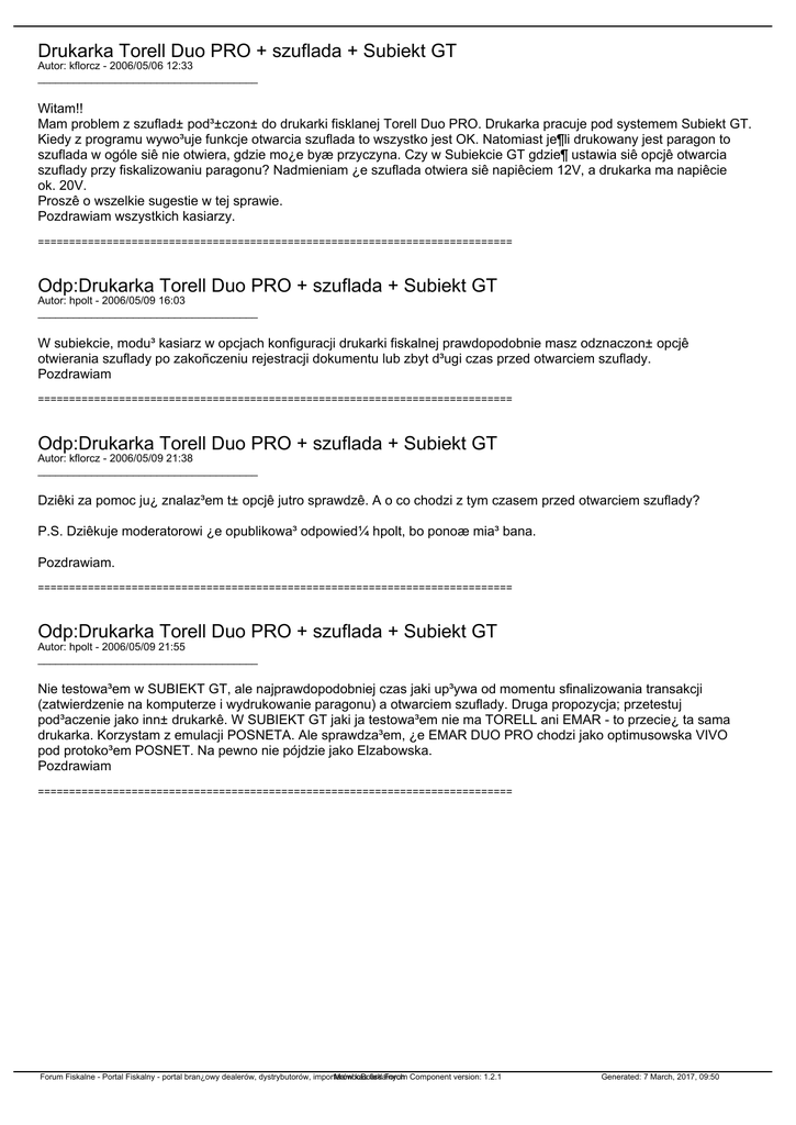 Drukarka Torell Duo PRO + szuflada + Subiekt GT Autor: kflorcz - 2006/05/06 12:33 _____________________________________ Witam!! Mam problem z szuflad± pod³±czon± do drukarki fisklanej Torell Duo PRO. Drukarka pracuje pod systemem Subiekt GT. Kiedy z programu wywo³uje funkcje otwarcia szuflada to wszystko jest OK. Natomiast je¶li drukowany jest paragon to szuflada w ogóle siê nie otwiera, gdzie mo¿e byæ przyczyna. Czy w Subiekcie GT gdzie¶ ustawia siê opcjê otwarcia szuflady przy fiskalizowaniu paragonu? Nadmieniam ¿e szuflada otwiera siê napiêciem 12V, a drukarka ma napiêcie ok. 20V. Proszê o wszelkie sugestie w tej sprawie. Pozdrawiam wszystkich kasiarzy. ============================================================================ Odp:Drukarka Torell Duo PRO + szuflada + Subiekt GT Autor: hpolt - 2006/05/09 16:03 _____________________________________ W subiekcie, modu³ kasiarz w opcjach konfiguracji drukarki fiskalnej prawdopodobnie masz odznaczon± opcjê otwierania szuflady po zakoñczeniu rejestracji dokumentu lub zbyt d³ugi czas przed otwarciem szuflady. Pozdrawiam ============================================================================ Odp:Drukarka Torell Duo PRO + szuflada + Subiekt GT Autor: kflorcz - 2006/05/09 21:38 _____________________________________ Dziêki za pomoc ju¿ znalaz³em t± opcjê jutro sprawdzê. A o co chodzi z tym czasem przed otwarciem szuflady? P.S. Dziêkuje moderatorowi ¿e opublikowa³ odpowied¼ hpolt, bo ponoæ mia³ bana. Pozdrawiam. ============================================================================ Odp:Drukarka Torell Duo PRO + szuflada + Subiekt GT Autor: hpolt - 2006/05/09 21:55 _____________________________________ Nie testowa³em w SUBIEKT GT, ale najprawdopodobniej czas jaki up³ywa od momentu sfinalizowania transakcji (zatwierdzenie na komputerze i wydrukowanie paragonu) a otwarciem szuflady. Druga propozycja; przetestuj pod³aczenie jako inn± drukarkê. W SUBIEKT GT jaki ja testowa³em nie ma TORELL ani EMAR - to przecie¿ ta sama drukarka. Korzystam z emulacji POSNETA. Ale sprawdza³em, ¿e EMAR DUO PRO chodzi jako optimusowska VIVO pod protoko³em POSNET. Na pewno nie pójdzie jako Elzabowska. Pozdrawiam ============================================================================ Forum Fiskalne - Portal Fiskalny - portal bran¿owy dealerów, dystrybutorów, importerów MamboBoard kas fiskalnych Forum Component version: 1.2.1 Generated: 7 March, 2017, 09:50