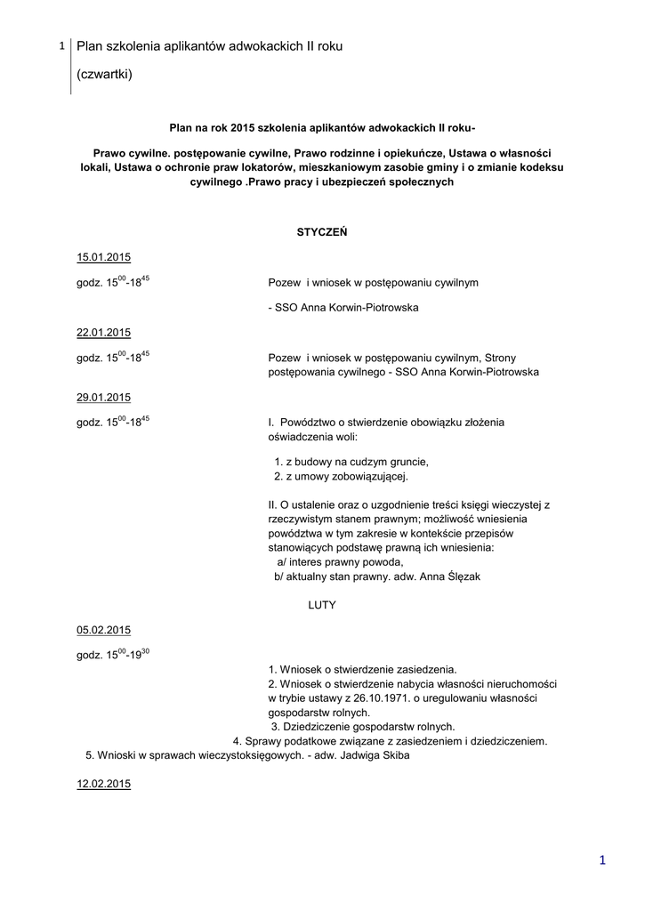 1 Plan szkolenia aplikantów adwokackich II roku (czwartki) Plan na rok 2015 szkolenia aplikantów adwokackich II rokuPrawo cywilne. postępowanie cywilne, Prawo rodzinne i opiekuńcze, Ustawa o własności lokali, Ustawa o ochronie praw lokatorów, mieszkaniowym zasobie gminy i o zmianie kodeksu cywilnego .Prawo pracy i ubezpieczeń społecznych STYCZEŃ 15.01.2015 00 45 godz. 15 -18 Pozew i wniosek w postępowaniu cywilnym - SSO Anna Korwin-Piotrowska 22.01.2015 00 45 Pozew i wniosek w postępowaniu cywilnym, Strony postępowania cywilnego - SSO Anna Korwin-Piotrowska 45 I. Powództwo o stwierdzenie obowiązku złożenia oświadczenia woli: godz. 15 -18 29.01.2015 00 godz. 15 -18 1. z budowy na cudzym gruncie, 2. z umowy zobowiązującej. II. O ustalenie oraz o uzgodnienie treści księgi wieczystej z rzeczywistym stanem prawnym; możliwość wniesienia powództwa w tym zakresie w kontekście przepisów stanowiących podstawę prawną ich wniesienia: a/ interes prawny powoda, b/ aktualny stan prawny. adw. Anna Ślęzak LUTY 05.02.2015 00 30 godz. 15 -19 1. Wniosek o stwierdzenie zasiedzenia. 2. Wniosek o stwierdzenie nabycia własności nieruchomości w trybie ustawy z 26.10.1971. o uregulowaniu własności gospodarstw rolnych. 3. Dziedziczenie gospodarstw rolnych. 4. Sprawy podatkowe związane z zasiedzeniem i dziedziczeniem. 5. Wnioski w sprawach wieczystoksięgowych. - adw. Jadwiga Skiba 12.02.2015 1 2 Plan szkolenia aplikantów adwokackich II roku (czwartki) 00 30 godz. 15 -19 I. Powództwa z zakresu prawa rzeczowego : 1. windykacyjne, 2. posesoryjne, 3. negatoryjne. II. Powództwo o dopuszczenie do współposiadania. III. Ochrona ograniczonych praw rzeczowych. - adw. Jadwiga Skiba 19.02.2015 00 30 godz. 15 -19 I. Wnioski z zakresu prawa osobowego 1. o ubezwłasnowolnienie, o zgodę na dokonanie czynności prawnej w imieniu ubezwłasnowolnionego. 2. o ustanowienie opieki, 3. o ustanowienie kurateli, 4. o uznanie za zmarłego i stwierdzenie zgonu. 5. Wnioski z ustawy o aktach stanu cywilnego. II. Wnioski z zakresu prawa rzeczowego: 1. o ustanowienie drogi koniecznej. 2. o wygaśnięcie służebności drogi koniecznej. 3. o rozgraniczenie. II. Powództwo o eksmisję, w tym o eksmisję małżonka ze wspólnego lokalu i zagadnienia z tym związane. III Powództwo o uchylenie uchwały wspólnoty mieszkaniowej - adw. Jadwiga Skiba 26.02.2015 00 45 godz. 15 -18 Wnioski spadkowe: o otwarcie i ogłoszenie testamentu, o stwierdzenie nabycia spadku (w tym z zapisem windykacyjnym), o zmianę lub uchylenie prawomocnego postanowienia o stwierdzenie nabycia spadku, Pozew o uznanie spadkobiercy niegodnym dziedziczenia 2 3 Plan szkolenia aplikantów adwokackich II roku (czwartki) Wniosek o zmianę prawomocnego postanowienia o stwierdzeniu nabycia spadku Wniosek o zabezpieczenie spadku w tym spis inwentarza - adw. Anna Ślęzak MARZEC 05.03.2015 00 15 Wnioski o: zniesienie współwłasności z żądaniem rozstrzygnięcia wzajemnych roszczeń współwłaścicieli z tytułu posiadania rzeczy, i dział spadku z wzajemnymi rozliczeniami współspadkobierców. - adw. Anna Ślęzak 45 1. Powództwo o ochronę dóbr osobistych godz. 15 -18 12.03.2015 00 godz. 15 -18 2. Powództwo o zapłatę odszkodowania, powództwo o zapłatę odszkodowania, zadośćuczynienia, renty z czynów niedozwolonych w przypadku szkód na osobie (wypadek komunikacyjny, zakażenia szpitalne, błąd w sztuce medycznej) SSN Tadeusz Domińczyk 19.03.2015 00 30 godz. 15 -19 Powództwa z zakresu prawa zobowiązaniowego 1. Powództwo o uznanie czynności prawnej za bezskuteczną, nieważną. 2. Powództwo o uznanie umowy za bezskuteczną w stosunku do wierzyciela - adw. Seweryn Plebanek 26.03.2015 00 45 godz. 15 -16 Powództwa z zakresu prawa zobowiązaniowego Powództwo o zapłatę odszkodowania w przypadku szkód na mieniu (odpowiedzialność władzy publicznej i innych podmiotów do tego zobowiązanych)-SSN Tadeusz Domińczyk 45 godz. 17-18 Powództwo konsumenta o uznanie ogólnych warunków umów za bezskuteczne - adw. Seweryn Plebanek 3 4 Plan szkolenia aplikantów adwokackich II roku (czwartki) KWIECIEŃ 02.04.2015 00 45 godz. 15 -16 Powództwo o naprawienie szkody wynikłej z niewykonania zobowiązania Powództwo przeciwko ubezpieczycielowi o odszkodowanie z tytułu szkody na nieruchomości - SSN Tadeusz Domińczyk 30 godz. 17-19 Powództwo o upoważnienie przez sąd do wykonania czynności na koszt dłużnika Powództwo o zmianę wysokości renty w związku ze zmianą stosunków Powództwo o odszkodowanie za bezumowne korzystanie z lokalu po wygaśnięciu umowy najmu - adw. Seweryn Plebanek 09.04.2015 00 30 godz. 15 -19 Prawo pracy i ubezpieczeń społecznych - adw. Magdalena Urbańska, adw. Henryk Stabla 16.04.2015 00 45 godz. 15 -18 Postępowanie przed sądem I instancji - SSO Anna Korwin-Piotrowska 23.04.2015 00 45 godz. 15 -18 Orzekanie w postępowaniu sądowym - SSO Anna Korwin-Piotrowska 30.04.2015 00 45 godz. 15 -18 Środki zaskarżenia w postępowaniu pierwszoinstacyjnym SSO Anna Korwin-Piotrowska MAJ 07.05.2015 00 30 godz. 15 -19 1. powództwa z zakresu prawa rodzinnego: 4 5 Plan szkolenia aplikantów adwokackich II roku (czwartki) - powództwo o zobowiązanie do przyczyniania się do zaspokajania potrzeb rodziny a powództwo alimentacyjne - powództwo o ustanowienie rozdzielności majątkowej - powództwo o rozwód wraz z wnioskami o zabezpieczenie roszczeń - powództwo o ustalenie ojcostwa 2. wnioski z zakresu prawa rodzinnego, opiekuńczego i kurateli - wniosek o rozstrzygnięcie o istotnych sprawach rodziny w braku porozumienia małżonków - wniosek o podział majątku wspólnego wraz z wnioskiem o ustalenie nierównych udziałów, rozliczenie nakładów i wydatków - wniosek o powierzenie, ograniczenie i pozbawienie władzy rodzicielskiej - wniosek o przysposobienie - adw. Seweryn Plebanek, adw. Jadwiga Skiba 14.05.2015 00 30 godz. 15 -19 1. Środki odwoławcze w postępowaniu cywilnym – zarys funkcjonalny i hi