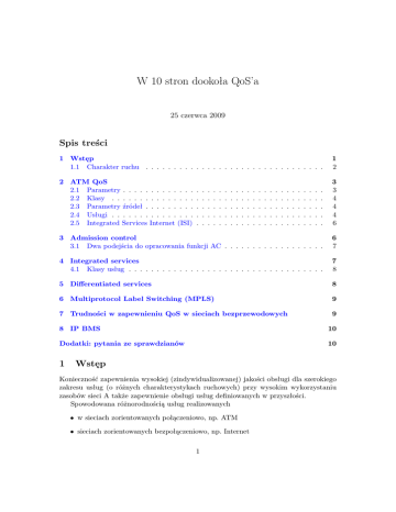 W 10 stron dookoła QoS’a 25 czerwca 2009 Spis treści 1 Wstęp 1.1 Charakter ruchu . . . . . . . . . . . . . . . . . . . . . . . . . . . . . . . . 1 2 2 ATM QoS 2.1 Parametry . . . . . . . . . . . . . 2.2 Klasy . . . . . . . . . . . . . . . 2.3 Parametry źródeł . . . . . . . . . 2.4 Usługi . . . . . . . . . . . . . . . 2.5 Integrated Services Internet (ISI) . . . . . 3 3 4 4 4 6 3 Admission control 3.1 Dwa podejścia do opracowania funkcji AC . . . . . . . . . . . . . . . . . . 6 7 4 Integrated services 4.1 Klasy usług . . . . . . . . . . . . . . . . . . . . . . . . . . . . . . . . . . . 7 8 5 Differentiated services 8 6 Multiprotocol Label Switching (MPLS) 9 7 Trudności w zapewnieniu QoS w sieciach bezprzewodowych 9 . . . . . . . . . . . . . . . . . . . . . . . . . . . . . . . . . . . . . . . . . . . . . . . . . . . . . . . . . . . . . . . . . . . . . . . . . . . . . . . . . . . . . . . . . . . . . . . . . . . . . . . . . . . . . . 8 IP BMS 10 Dodatki: pytania ze sprawdzianów 10 1 Wstęp Konieczność zapewnienia wysokiej (zindywidualizowanej) jakości obsługi dla szerokiego zakresu usług (o różnych charakterystykach ruchowych) przy wysokim wykorzystaniu zasobów sieci A także zapewnienie obsługi usług definiowanych w przyszłości. Spowodowana różnorodnością usług realizowanych • w sieciach zorientowanych połączeniowo, np. ATM • sieciach zorientowanych bezpołączeniowo, np. Internet 1 Obowiązujące obecnie przesyłanie pakietów na zasadzie best effort okazało się niewystarczające – konieczne zatem opracowanie nowych architektur sieci dla wielousługowej sieci szerokopasmowej B-ISDN • ATM • IP – Integrated Services – Differentiated Services 1.1 Charakter ruchu Ruch w sieci telekomunikacyjnej można podzielić wg kryterium wrażliwości, tj może być wrażliwy na: opóźnienie delay-sensitive, np. dla wideokonferencji, telefoni, streamingu VOD straty loss-sensitive, transfer danych Ruch w sieci pakietowej wykazuje zupełnie inne własności statystyczne niż wynikające z modeli Poissonowskich (np. ruch w sieci telefonicznej), m.in. ma wysoką autokorelację. Przy zwiększeniu ruchu fluktuacje obciążenia łączy występujące przy małym ruchu zachowują się. Taki model ruchu nazywa się ruchem samopodobnym. GoS Grade of Service • dotyczy jakości usługi na poziomie zgłoszeń • może być określony przez prawdopodobieństwo blokady dla zgłoszenia określonego typu usług QoS Quality of Service • odnosi się do warstwy komórek (pakietów). • określany przez szereg parametrów, które opisują wymagania dotyczące przenoszenia danych użytkowników • Wartości tych parametrów wyznaczane są na podstawie kontraktu między siecią a użytkownikiem Aktywność źródeł ruchu można rozpatrywać na trzech skalach czasu (poziomach) • komórek lub pakietów (Cell Level ), • zgęstek (Burst Level ), • zgłoszeń (Call Level ). 2 2 ATM QoS Pomiędzy stacją źródłową a docelową zostaje zestawione logiczne połączenie zwane kanałem wirtualnym VCC (Virtual Channel Connection). Kanały o tym samym węźle docelowym tworzą tzw. wirtualną ścieżkę VPC (Virtual Path Connection). W komutatorze ATM ma miejsce multipleksacja statystyczna poszczególnych kanałów. Kanały i ścieżki wirtualne są rozróżniane przez części nagłówka ATM - pole VPI (Virtual Path Identifier ) i pole VCI (Virtual Channel Identifier ). Użycie ścieżek wirtualnych znacznie upraszcza zarządzanie całą siecią. Wynika to z faktu, że liczba ścieżek wirtualnych jest mniejsza od liczby kanałów wirtualnych. Dzięki temu zestawienie połączenia w węźle pośrednim, przez który przebiega dana ścieżka, wpływa na przyspieszenie zestawiania nowego połączenia, wykorzystującego ścieżki wirtualne. Kanały wirtualne, które należą do jednej ścieżki wirtualnej muszą charakteryzować się jednakowym poziomem wymaganej jakości usługi QoS. 2.1 Parametry CER Cell Error Ratio, stopa błędnych pakietów. Stosunek liczby błędnie przekazywanych do liczby wszystkich przekazywanych pakietów w określonym odcinku czasu. CLR Cell Loss Ratio, stopa straconych pakietów. Stosunek liczby pakietów straconych do liczby wszystkich nadanych pakietów w określonym odcinku czasu. CTD Cell Transfer Delay, opóźnienie komórki w trakcie transmisji. Czas od chwili, gdy pierwszy bit pakietu zostaje wysłany z pierwszego punktu obserwacji (measurement point) do chwili, gdy ostatni bit pakietu dotrze do drugiego punktu obserwacji. Na opóźnienie transmisji składają się między innymi: FSD Fixed Switching Delay, opóźnienie komutacji QD Queueing Delay, kolejkowania PD Packetization Delay, pakietyzacji DD Depacketization Delay, depakietyzacji MCTD Mean Cell Transfer Delay, średni czas opóźnień transferu pakietów (średnia arytmetyczna) CDV Cell Delay Variation, Jitter, zmienność opóźnienia pakietu. Opóźnienie każdego pakietu składa się z dwóch składników: stałego wynikającego z czasu propagacji i przypadkowego wynikającego z buforowania pakietów. Wartość CDV definiuje się jako wariancję. Jitter może być usunięty w komutatorze kosztem większych buforów oraz większego opóźnienia pakietów. Pakiety mogą być przetrzymane w buforze usuwania jittera (jitter removal buffer ). Przy usuwaniu jittera komutator korzysta z parametru CDVT, a w praktyce niemożliwe jest całkowite usunięcie. CDVT Cell Delay Variation Tolerance, określa dopuszczalne odstępy czasu między kolejnymi pakietami. 3 2.2 Klasy 1. Stringent – oferuje surowe ograniczenia parametrów CLR i CTD oraz CDV, niezależnie od wartości bitu CLP nagłówka komórki; przeznaczona jest dla usług czasu rzeczywistego, np. transmisji głosu 2. Tolerant – oferowane gwarancje w tej klasie są niezależne od ustawienia bitu CLP nagłówka komórki (podobnie jak klasa 1), jednak gwarantuje tylko poziom strat komórek. Zatem CLR jest nieznacznie większe niż w klas