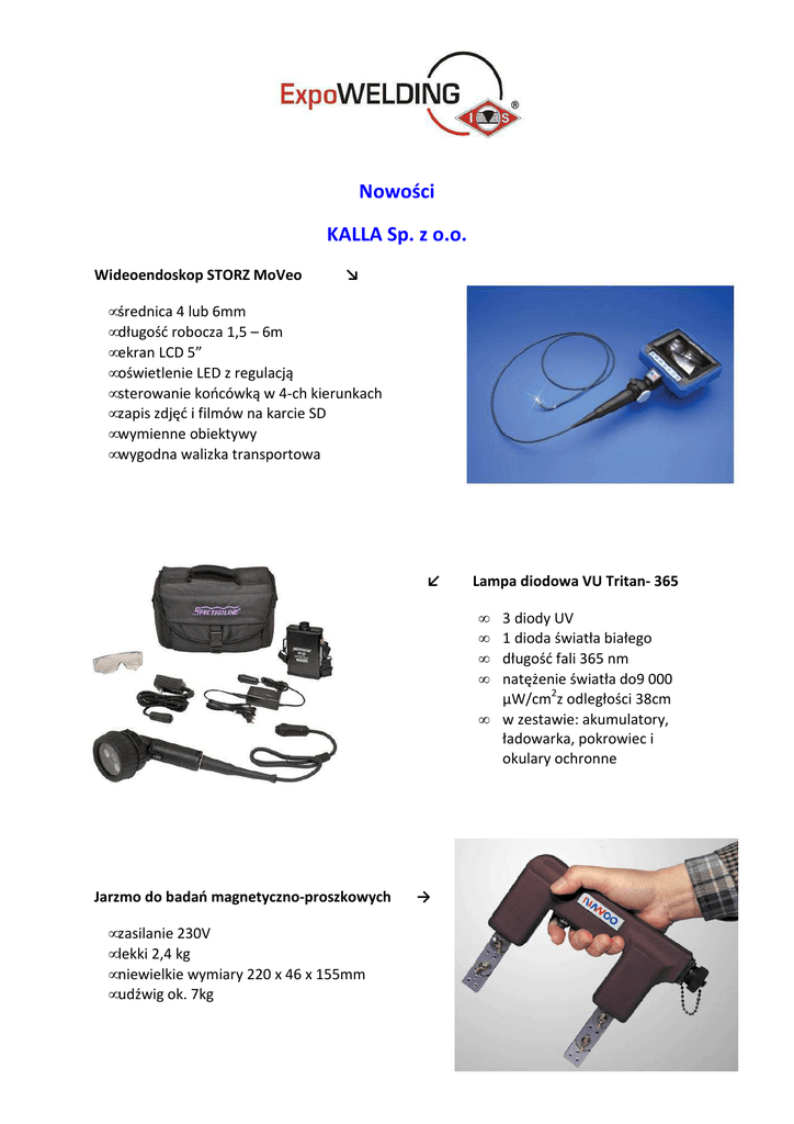 Nowości KALLA Sp. z o.o. Wideoendoskop STORZ MoVeo ↘ • średnica 4 lub 6mm • długość robocza 1,5 – 6m • ekran LCD 5” • oświetlenie LED z regulacją • sterowanie końcówką w 4-ch kierunkach • zapis zdjęć i filmów na karcie SD • wymienne obiektywy • wygodna walizka transportowa ↙ Lampa diodowa VU Tritan- 365 • • • • • Jarzmo do badań magnetyczno-proszkowych • zasilanie 230V • lekki 2,4 kg • niewielkie wymiary 220 x 46 x 155mm • udźwig ok. 7kg → 3 diody UV 1 dioda światła białego długość fali 365 nm natężenie światła do9 000 μW/cm2z odległości 38cm w zestawie: akumulatory, ładowarka, pokrowiec i okulary ochronne