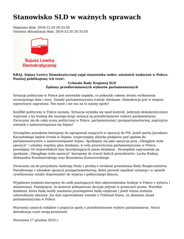 Stanowisko SLD w ważnych sprawach Napisano dnia: 2016-12-20 20:33:50 Ostatnia aktualizacja dnia: 2016-12-20 20:33:50 KRAJ. Sojusz Lewicy Demokratycznej zajął stanowiska wobec ostatnich wydarzeń w Polsce. Poniżej publikujemy ich treść: Uchwała Rady Krajowej SLD Żądamy przedterminowych wyborów parlamentarnych Sytuacja polityczna w Polsce jest niezwykle napięta, co pokazały całemu światu wydarzenia wczorajszego dnia i nocy. Zasady parlamentaryzmu zostały zbrukane. Demokracja jest w stopniu najwyższym zagrożona. Nie może i nie ma na to naszej zgody! Konflikt polityczny w Polsce narasta. Sytuacja wymyka się spod kontroli. Jedynym demokratycznym wyjściem z tej trudnej dla naszego kraju sytuacji są przedterminowe wybory parlamentarne. Zwracamy się do całej sceny politycznej w Polsce, parlamentarnej i pozaparlamentarnej, poprzyjcie wniosek o samorozwiązania się Sejmu! Szczególne przesłanie kierujemy do ugrupowań stojących w opozycji do PiS. Jeżeli partia Jarosława Kaczyńskiego będzie trwała w Sejmie, rozpocznijmy zbiórkę podpisów pod apelem do parlamentarzystów o samorozwiązanie Sejmu. Spotkajmy się jako opozycja przy „Okrągłym stole opozycji” i ustalmy wspólny plan działania, w celu przywrócenia parlamentaryzmu w Polsce, powołajmy 16 wojewódzkich biur koordynujących nasze działania. Szczególne zaproszenie na spotkanie „Okrągłego stołu opozycji” kierujemy do trzech byłych prezydentów: Lecha Wałęsy, Aleksandra Kwaśniewskiego oraz Bronisława Komorowskiego. Zwracamy się do prezydenta Andrzeja Dudy z prośbą o zwołanie posiedzenia Rady Bezpieczeństwa Narodowego z udziałem opozycji pozaparlamentarnej, które pozwoli uspokoić sytuację i w sposób cywilizowany ustalić doprowadzić do wyjścia z politycznego klinczu. Wyjątkowe posłanie kierujemy do osób piastujących dziś odpowiedzialne funkcje w Polsce z wyboru i mianowania. Pamiętajcie, że możecie podejmować decyzje jedynie w granicach prawa. Wszelkie działania, która będą nosiły znamiona przestępstwa będą osądzone i jeżeli winna zostanie udowodniona ukarane. Już dziś zapowiadamy wnioski o Trybunał Stanu, za złamanie zasad parlamentaryzmu w Polsce. Wzywamy naszych rodaków o poparcie apelu o przedterminowe wybory parlamentarne. Niech demokracja czyni swoją powinność. Warszawa 17 grudnia 2016 r. Uchwała Zarządu Krajowego SLD Ręce precz od generała - dziś funkcjonariusze mundurowi, jutro każdy kto pracował w Polsce Ludowej PiS zapowiedział degradację generała Wojciecha Jaruzelskiego, chociaż zgodnie z prawem taką decyzję może podjąć jedynie sąd. Minister Obrony Narodowej nie będzie w stanie odebrać gwiazdek generalskich w sposób legalny, posunie się więc do bezprawia w celu realizacji politycznej zemsty. W polskiej tradycji zawsze z szacunkiem podchodzono do zmarłych, tymczasem Prawo i Sprawiedliwość nie waha się dokonywać swoistej politycznej ekshumacji dla realizacji własnych celów. Sojusz Lewicy Demokratycznej odpowiada PiS – ręce precz od generała, nie zerwiecie mu tych gwiazdek! Kolejnym elementem politycznej zemsty będzie wprowadzenie odpowiedzialności zbiorowej, wobec funkcjonariuszy służb mundurowych, którzy przepracowali choć jeden dzień w okresie PRL. Policja, celnicy, straż pożarna, pogranicznicy, przedstawiciele służb specjalnych, wojsko, żandarmeria wojskowa, służba ochrony kolei, czy też służba więzienna – emerytury tych służb mundurowych mają zostać obniżone, co budzi zdecydowany sprzeciw SLD. Projektowane zmniejszenie – po raz wtóry - świadczeń funkcjonariuszom służb mundurowych, którzy w 1990 r. uzyskali pozytywną weryfikację, oceniamy jako działanie niezgodne z szeregiem przepisów Konstytucji RP, wynikających z niej zasad konstytucyjnych oraz aktów prawa międzynarodowego. Dziś żołnierze i funkcjonariusze służb mundurowych, jutro sędziowie, prokuratorzy, nauczyciele oraz dziennikarze. Pojutrze wszyscy, którzy pracowali w Polsce Ludowej ! Sojusz Lewicy Demokratycznej zwraca się do wszystkich osób, które pracowały w tamtych czasach, nie tylko pracowników służb mundurowych, lecz wszystkich ludzi aktywnych zawodowo przed 1990r. Sprzeciwiamy się kolejnej próbie dzielenia Polek i Polaków na tych co byli i nie byli aktywni zawodowo przed rozpoczęciem procesu transformacji ustrojowej. Bierzemy Państwa w obronę, będziemy nadal reprezentować Wasze interesy bez względu na to jakie poglądy posiadacie. Naszemu społeczeństwu potrzebne jest porozumienie, pojednanie i wybaczenie, a nie pogłębianie już istniejących, wyraźnych podziałów. POLSKA LUDOWA TO RÓWNIEŻ BYŁA POLSKA! Nie możemy się zgodzić na zakwestionowanie dorobku życia wielu pokoleń Polek i Polaków tylko dlatego, że Wasza aktywność zawodowa przypadła na wcześniejsze czasy. SLD deklaruje, że w momencie ponownego objęcia odpowiedzialności za kierowanie losami naszego kraju przez Sojusz, wszystkie te bezprawne działania zostaną unieważnione i przywrócony zostanie stan prawny sprzed ideologicznej wojny, którą rozpętał PiS. Warszawa, 17 grudnia 2016 r.