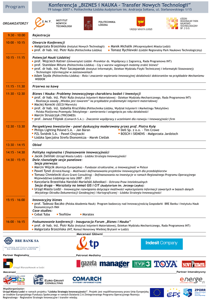 Konferencja „BIZNES i NAUKA - Transfer Nowych Technologii” Program 19 lutego 2007 r. Politechnika Łódzka Audytorium im. Andrzeja Sołtana, ul. Stefanowskiego 1/15 INSTYTUT NOWYCH TECHNOLOGII ORGANIZATORZY 9:30 - 10:00 10:00 - 10:15 10:15 - 11:15 POLITECHNIKA ŁÓDZKA Rejestracja Otwarcie Konferencji Małgorzata Brzezińska (Instytut Nowych Technologii) prof. dr hab. inż. Piotr Kula (Politechnika Łódzka) Marek Michalik (Wiceprezydent Miasta Łodzi) Tomasz Rychlewski (Łódzki Regionalny Park Naukowo Technologiczny) Potencjał Nauki Łódzkiej prof. Wojciech Katner (Uniwersytet Łódzki -Prorektor ds. Współpracy z Zagranicą, Rada Programowa INT) prof. Stanisław Mitura (Politechnika Łódzka) - Czy z warstw węglowych możemy zrobić biznes? prof. dr hab. inż. Piotr Szczepaniak (Instytut Informatyki, Dziekan Wydziału Fizyki Technicznej i Informatyki Stosowanej) - Technologie informacyjne w zastosowaniach Adam Szyda (Politechnika Łódzka) - Rola i znaczenie wspierania innowacyjnej działalności doktorantów na przykładzie Mechanizmu WIDDOK 11:15 - 11:30 Przerwa na kawę 11:30 - 12:30 Biznes i Nauka: Problemy innowacyjnego charakteru badań i inwestycji prof. dr hab. inż. Piotr Kula (Instytut Inżynierii Materiałowej - Dziekan Wydziału Mechanicznego, Rada Programowa INT) - Realizacja zasady „Wiedza jest towarem” na przykładzie problematyki inżynierii materiałowej Maciej Korecki (SECO/Warwick) prof. dr hab. inż. Izabella Krucińska (Politechnika Łódzka, Wydział Inżynierii i Marketingu Tekstyliów) - Polska Platforma Przemysłu Tekstylnego - zamierzenia i osiągnięcia po roku działalności Marcin Struszczyk (TRICOMED) prof. Janusz Filipiak (Comarch S.A.) - Znaczenie współpracy z uczelniami dla rozwoju i innowacyjności firm 12:30 - 13:30 Perspektywa Inwestorów - panel dyskusyjny moderowany przez prof. Piotra Kulę Philips Lighting Poland S.A. - Jan Baran Dell Sp. z o.o. - Tim Crowe PZL Świdnik S.A. - Paweł Chojnacki BOSCH i SIEMENS - Małgorzata Jardzioch Łódzka Specjalna Strefa Ekonomicza - Marek Cieślak 13:30 - 14:15 Obiad 14:15 - 14:30 Polityka regionalna i finansowanie innowacyjności Jacek Zieliński (Urząd Miasta Łodzi) - Łódzka Strategia Innowacyjności Dwie równoległe sesje panelowe: Sesja pierwsza: Marcin Wójcik (Komisja Europejska) - Fundusze strukturalne, a innowacyjność w Polsce Paweł Tynel (Ernst&Young) - Możliwości dofinansowania projektów innowacyjnych dla przedsiębiorstw Tomasz Chmielecki (Euro Grant Consulting) - Dofinansowania na inwestycje w ramach Regionalnego Programu Operacyjnego 14:30 - 15:15 Województwa Łódzkiego na lata 2007 - 2013 Kancelaria Brzezińska Narolski Mariański Adwokaci - Ochrona Praw Intelektualnych Sesja druga - Warsztaty na temat GIS i CIT (Audytorium im. Jerzego Leyko): Urząd Miasta Łodzi - Innowacyjne rozwiązania dotyczące możliwości wykorzystania informacji zawartych w bazach danych Miejskiego Ośrodka Dokumentacji Geodezyjnej i Kartograficznej - Łódzka Strategia Innowacyjności 15:15 - 16:00 Innowacyjny biznes prof. Tadeusz Baczko (Polska Akademia Nauk) Program badawczy nad Innowacyjnością Gospodarki BRE Banku i Instytutu Nauk Ekonomicznych PAN Case studies: Cebal Tuba 16:00 - 16:15 Teofilów Moratex Podsumowanie konferencji - Inauguracja Forum „Biznes i Nauka” prof. dr hab. inż. Piotr Kula (Instytut Inżynierii Materiałowej, Dziekan Wydziału Mechanicznego, Rada Programowa INT) Małgorzata Brzezińska (INT, Konsul Honorowy Wielkiej Brytanii w Łodzi) Mecenasi Główni Partner Regionalny Patronat Medialny Mecenasi Współorganizator: Urząd Miasta Łodzi w ramach projektu “Łódzka Strategia Innowacyjności”. Projekt jest współfinansowany przez Unię Europejską ze środków Europejskiego Funduszu Społecznego w ramach Działania 2.6 Zintegrowanego Programu Operacyjnego Rozwoju Regionalnego - Regionalne Strategie Innowacyjne i transfer wiedzy. Partner Interaktywny