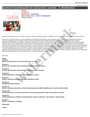 Informacje o produkcie Utworzono 07-03-2017 Językowe komunikowanie się nauczyciela z uczniem... (I. Bieńkowska) Cena : 31,50 zł er m ar k Dostępność : Dostępny Stan magazynowy : brak w magazynie Średnia ocena : Językowe komunikownie się nauczyciela z uczniem w aspekcie stosowania środk ow dydaktycznych na leksjach (na etapie edukacji wczesnoszkolnej) Książka jest interesującą pozycją z zakresu dydaktyki w edukacji wczesnoszkolnej. Autorka podjęła trudny, ważny i mało dyskutowany aktualnie w literaturze pedagogicznej oraz poddany analizie empirycznej problem jakości efektów kształcenia dziecka, biorąc pod uwagę rodzaje środków dydaktycznych stosowanych na lekcjach i związane z nimi polecenia, pytania nauczyciela do ucznia. Autorka prezentuje opracowanie części własnego materiału empirycznego. Wypływające wnioski z badań Autorki pozwalają na wysunięcie postulatów w podniesieniu efektywności wyników kształcenia dziecka przez nauczyciela w toku edukacji. Wnioski te są również ważne dla kształcenia akademickiego przyszłych nauczycieli, aby byli w pełni kompetentni w stymulacji zachowań twórczych i językowych dziecka. Autorka udowadnia, że na kształtowanie kompetencji komunikacyjnych dziecka istotny wpływ ma forma komunikowania się nauczyciela z nim w oparciu o wykorzystywane i powiązane z poleceniem, czy pytaniem do dziecka, zastosowanie środka dydaktycznego. Komunikowanie się należy odnieść nie tylko do relacji osób, które się porozumiewają, ale również do środków, jakie w tym celu stosują oraz efektów tak kształtowanych relacji interpersonalnych, co wykazała Autorka w swoich badaniach. Spis treści: Wstęp Rozdział I Język. Komunikowanie. Proces komunikowania się na lekcji at Rozdział II Badania nad rozwojem mowy i kompetencji językowej dziecka (zarys) Rozdział III Czynniki determinujące rozwój dziecka w młodszym wieku szkolnym w Rozdział IV Środki dydaktyczne a ekspresja twórcza i językowa u dzieci Rozdział V Pytania i polecenia w procesie interakcji werbalnej na lekcji Rozdział VI Metodologia badań własnych Rozdział VII Pytania i polecenia stosowane w trakcie wykorzystywania środków dydaktycznych analiza wyników badań Rozdział VIII Środki dydaktyczne w procesie kształcenia a proces komunikowania między nauczycielem a uczniem Rozdział IX Środki dydaktyczne w edukacji wczesnoszkolnej a pytania i polecenia z nimi związane próba syntezy Rozdział X Wnioski, uogólnienia i postulaty Bibliografia Aneksy Wygenerowano w programie www.oscGold.com w at er m ar k autor: Izabela Bieńkowska ISBN: 978-83-60163-71-9 format: B5 ilość stron: 304
