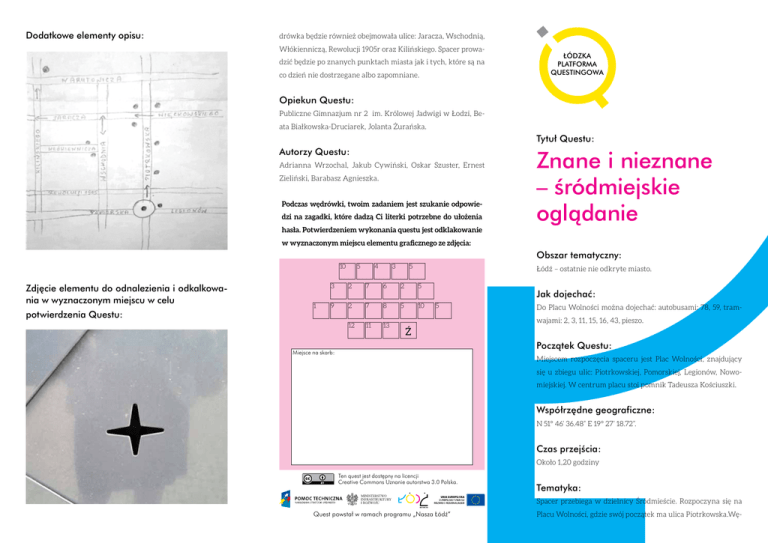 Dodatkowe elementy opisu: drówka będzie również obejmowała ulice: Jaracza, Wschodnią, Włókienniczą, Rewolucji 1905r oraz Kilińskiego. Spacer prowadzić będzie po znanych punktach miasta jak i tych, które są na co dzień nie dostrzegane albo zapomniane. ŁÓDZKA PLATFORMA QUESTINGOWA Opiekun Questu: Publiczne Gimnazjum nr 2 im. Królowej Jadwigi w Łodzi, Beata Białkowska-Druciarek, Jolanta Żurańska. Tytuł Questu: Autorzy Questu: Adrianna Wrzochal, Jakub Cywiński, Oskar Szuster, Ernest Zieliński, Barabasz Agnieszka. Podczas wędrówki, twoim zadaniem jest szukanie odpowiedzi na zagadki, które dadzą Ci literki potrzebne do ułożenia hasła. Potwierdzeniem wykonania questu jest odklakowanie Znane i nieznane – śródmiejskie oglądanie w wyznaczonym miejscu elementu graficznego ze zdjęcia: Obszar tematyczny: Zdjęcie elementu do odnalezienia i odkalkowania w wyznaczonym miejscu w celu potwierdzenia Questu: ËÆÅÄÆ ÄÃÈÇÃÆ ÂÊÃÈÉÆËÆ Ź ÍÌÎÁ Miejsce na skarb: Łódź – ostatnie nie odkryte miasto. Jak dojechać: Do Placu Wolności można dojechać: autobusami: 78, 59, tramwajami: 2, 3, 11, 15, 16, 43, pieszo. Początek Questu: Miejscem rozpoczęcia spaceru jest Plac Wolności, znajdujący się u zbiegu ulic: Piotrkowskiej, Pomorskiej, Legionów, Nowomiejskiej. W centrum placu stoi pomnik Tadeusza Kościuszki. Współrzędne geograficzne: N 51° 46’ 36.48” E 19° 27’ 18.72”. Czas przejścia: Około 1,20 godziny Ten quest jest dostępny na licencji Creative Commons Uznanie autorstwa 3.0 Polska. Tematyka: Spacer przebiega w dzielnicy Śródmieście. Rozpoczyna się na Quest powstał w ramach programu „Nasza Łódź” Placu Wolności, gdzie swój początek ma ulica Piotrkowska.Wę- Witaj gościu drogi na Placu Wolności Pomnik naczelnika Cię tutaj ugości. Tadeusz ÁÁÁÁÃÁÁÄÁÁ człowiek ten się zowie, ÁÁÉÁÁÁÁÁ” U zbiegu ulic Wschodniej i Jaracza Dziś nikt już nie zwraca uwagi na nie Zobaczycie , że trud wasz się opłaca. Tam stróż prawa przebywał , ruchem kierował, mandaty Jeszcze kilkanaście kroków w lewą stronę spisywał. O insurekcji chętnie Ci opowie. I będziecie mogli czoło swe spocone Zrosić wodą ze źródła przy ulicy Kamiennej I popatrzeć na oblicze k ÁÁÁÁËÁÌ w senne. Spójrz w oczy naczelnikowi Potem idź w lewo, na drugą stronę drogi Z kamiennej wróćcie Wschodnią Dojdziesz do starej studni miłości. Gdy zakochanych ÁÁÎÁ Na północ podążajcie z niej skropi ich miłość sięgnie Odnajdziecie dom Noblisty wieczności. Hołd mu należny oddajcie Tu przed laty powstało dzieło wspaniałe Woda w studni tej tryska O fabrykanckiej Łodzi „Ziemią obiecaną” zwane. Ze złotych rybek p ÁÅÁÆ Ostatni etap wędrówki pozostał drodzy moi W stronę zegara się kieruj, U zbiegu łódzkich ulic świątynia piękna stoi Następnie Piotrkowską maszeruj Podejdź teraz do stołu, zobacz jak ucztują Zawróćcie i na południe udajcie się spacerkiem Tam pod numerem trzecim jest hotel odnowiony i o łódzkim przemyśle mądrze debatują Aż dojdziecie do ulicy, przy której stoi cerkiew Małymi szkiełkami zmyślnie wyłożony. W słońcu lśnią jego ściany Ci zamożni ÁÁÊÁÁÁÁÁÁÁ z Poznańskim na czele Kilka kroków w lewo i już jesteście u celu Jak diamenty w pierścionku u dÁÇ y. To zacni panowie , Łodzi przyjaciele. W świątyni prawosławnej podziwianej przez wielu. Skieruj wzrok ku kamienicy zielonej, Spacer ulicą Jaracza teraz proponuję Wznosi się ku niebu niczym królewska korona. Niedawno przez łodzian pięknie odnowionej i za dotychczasową zabawę dziękuję Naprzeciwko niegdyś mieścił się sklep ÁÁÁÂÁÁ Scheiblera, Dziś okulary chętnie każdy tu wybiera. już niebawem cel waszej wyprawy ujrzycie najpierw jednak do Wschodniej ulicy dojdziecie Błękitna jej kopuła ÁÍÁÁÁÁ ozdobiona Hasło odczytajcie, z liter je złożycie teraz spójrzcie na zdjęcie, przypatrzcie się należycie. Spróbujcie odszukać znak na Dojdź do skrzyżowania z ulicą Więckowskiego, nim widoczny . Nad wejściem znajdziesz głowę bożka handlu Ołówkiem odkalkujcie gdy go MÈÁÁÁÁÁÁ o. Kiedyś w Domu Bankowym kupcy tu gościli i znaczące dla Łodzi interesy robili. odnajdziecie W ten oto sposób skarb w całości odkryty mieć będziecie. Spójrz na kamienicę po przeciwnej stronie Głowę do góry zadrzyj, niech trochę ochłonie Ujrzysz budkę wiszącą – „Gniazdo