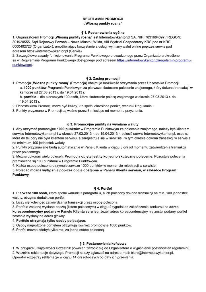 REGULAMIN PROMOCJI „Wiosną punkty rosną” § 1. Postanowienia ogólne 1. Organizatorem Promocji „Wiosną punkty rosną” jest Internetowykantor.pl SA, NIP: 7831684097 / REGON: 301920555, Sąd Rejonowy Poznań – Nowe Miasto i Wilda, VIII Wydział Gospodarczy KRS pod nr KRS 0000402723 (Organizator), umożliwiający korzystanie z usługi wymiany walut online poprzez serwis pod adresem https://internetowykantor.pl (Serwis) 2. Szczegółowe zasady funkcjonowania Programu Punktowego prowadzonego przez Organizatora określone są w Regulaminie Programu Punktowego dostępnego pod adresem https://internetowykantor.pl/regulamin-programupunktowego/. § 2. Zasięg promocji 1. Promocja „Wiosną punkty rosną” (Promocja) obejmuje możliwość otrzymania przez Uczestnika Promocji: a. 1000 punktów Programie Punktowym za pierwsze skuteczne polecenie znajomego, który dokona transakcji w kantorze od 27.03.2013 r. do 19.04.2013 r. b. portfela – dla pierwszych 100 osób, które skutecznie polecą znajomego w okresie 27.03.2013 r. do 19.04.2013 r. 2. Uczestnikiem Promocji może być każdy, kto spełni określone poniżej warunki Regulaminu. 3. Punkty przyznane w Promocji są ważne przez 3 miesiące od momentu przyznania. § 3. Promocyjne punkty na wymianę waluty 1. Aby otrzymać promocyjne 1000 punktów w Programie Punktowym za polecenie znajomego, należy być klientem serwisu Internetowykantor.pl i w okresie 27.03.2013 r. do 19.04.2013 r. polecić serwis Internetowykantor.pl, osobie, która do tej pory nie była klientem serwisu, a zarejestruje się w serwisie i w tym okresie dokona transakcji w serwisie na minimum 100 jednostek waluty. 2. Punkty przyznawane będą automatycznie w Panelu Klienta w ciągu 3 dni od momentu zatwierdzenia transakcji przez poleconego. 3. Można dokonać wielu poleceń. Promocją objęte jest tylko jedno skuteczne polecenie. Pozostałe polecenia premiowane są 100 punktami w Programie Punktowym. 4. Każda osoba polecona otrzymuje zawsze 1000 punktów w momencie rejestracji w serwisie. 5. Polecać można wyłącznie poprzez opcje dostępne w Panelu Klienta serwisu, w zakładce Program Punktowy. § 4. Portfel 1. Pierwsze 100 osób, które spełni warunki z paragrafu 3, a ich polecony dokona transakcji na min. 100 jednostek waluty, otrzyma dodatkowo portfel. 2. Liczy się kolejność zatwierdzania transakcji przez osobę poleconą. 3. Portfele zostaną wysłane pocztą (listem poleconym) w ciągu 2 tygodni od zakończenia konkursu na adres korespondencyjny podany w Panelu Klienta serwisu. Jeżeli adres korespondencyjny nie został podany, portfel zostanie wysłany na adres główny. 4. Portfele otrzymają tylko osoby polecające. 5. Osoby nagrodzone portfelem otrzymują również promocyjne 1000 punktów. 6. Portfel można zdobyć tylko raz, za jedną osobę poleconą. § 5. Postanowienia końcowe 1. W przypadku wątpliwości Uczestnik powinien zwrócić się do Organizatora o wyjaśnienie postanowień regulaminu. 2. Wszelkie reklamacje dotyczące Promocji należy zgłaszać na adres e-mail: [email protected]. Operator rozpatrzy reklamacje w ciągu 14 dni roboczych od daty ich przesłania.