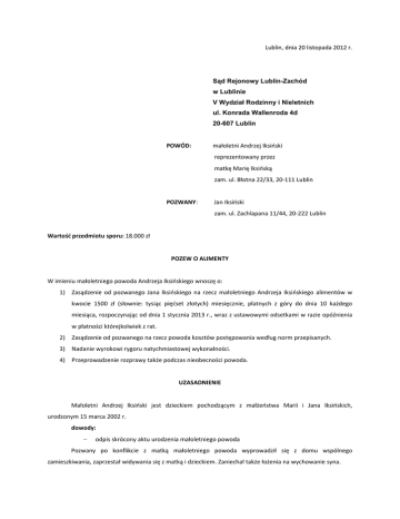 Lublin, dnia 20 listopada 2012 r. Sąd Rejonowy Lublin-Zachód w Lublinie V Wydział Rodzinny i Nieletnich ul. Konrada Wallenroda 4d 20-607 Lublin POWÓD: małoletni Andrzej Iksiński reprezentowany przez matkę Marię Iksińską zam. ul. Błotna 22/33, 20-111 Lublin POZWANY: Jan Iksiński zam. ul. Zachlapana 11/44, 20-222 Lublin Wartość przedmiotu sporu: 18.000 zł POZEW O ALIMENTY W imieniu małoletniego powoda Andrzeja Iksińskiego wnoszę o: 1) Zasądzenie od pozwanego Jana Iksińskiego na rzecz małoletniego Andrzeja Iksińskiego alimentów w kwocie 1500 zł (słownie: tysiąc pięćset złotych) miesięcznie, płatnych z góry do dnia 10 każdego miesiąca, rozpoczynając od dnia 1 stycznia 2013 r., wraz z ustawowymi odsetkami w razie opóźnienia w płatności którejkolwiek z rat. 2) Zasądzenie od pozwanego na rzecz powoda kosztów postępowania według norm przepisanych. 3) Nadanie wyrokowi rygoru natychmiastowej wykonalności. 4) Przeprowadzenie rozprawy także podczas nieobecności powoda. UZASADNIENIE Małoletni Andrzej Iksiński jest dzieckiem pochodzącym z małżeństwa Marii i Jana Iksińskich, urodzonym 15 marca 2002 r. dowody: − odpis skrócony aktu urodzenia małoletniego powoda Pozwany po konflikcie z matką małoletniego powoda wyprowadził się z domu wspólnego zamieszkiwania, zaprzestał widywania się z matką i dzieckiem. Zaniechał także łożenia na wychowanie syna. Matka powoda nie dysponuje informacjami, co w tej chwili robi pozwany, ale do wyprowadzenia się z domu był kierownikiem działu programistów w firmie komputerowej TechBit w Lublinie i w ostatnim czasie zarabiał ok. 6500 zł brutto. Obecnie cały ciężar utrzymania i wychowania syna spoczywa na matce powoda, która pracuje jako pielęgniarka w SPSK 4 w Lublinie. Razem z dyżurami zarabia do 2500 zł brutto. dowód: − zaświadczenie o zarobkach matki małoletniego − przesłuchanie stron Małoletni powód uczęszcza do szkoły podstawowej i jego potrzeby są duże w zakresie wyżywienia, odzieży, pomocy szkolnych itp. Powód jest dodatkowo alergikiem, co powoduje, że konieczne jest ponoszenie kosztów leczenia. dowód: zaświadczenie lekarskie o stanie zdrowia małoletniego powoda Skoro pozwany zaprzestał osobistego udziału w staraniach związanych z wychowaniem powoda, powinien brać udział w kosztach jego utrzymania w kwocie dochodzonej pozwem. Mając na uwadze powyższe żądanie pozwu jest w pełni uzasadnione i zasługuje na uwzględnienie. ........................................................................................ (podpis przedstawiciela powoda) Załączniki: 1. Odpis pozwu wraz z załącznikami. 2. Odpis skrócony aktu urodzenia dziecka. 3. Zaświadczenie o zarobkach matki małoletniego 4. Zaświadczenie lekarskie o stanie zdrowia małoletniego powoda INFORMACJE DOT. POZWU O ALIMENTY Pozew o alimenty jest wolny od kosztów sądowych. Pozew o alimenty może być wniesiony w miejscu zamieszkania pozwanego albo w miejscu zamieszkania dziecka. Sąd nie jest związany żądaniem pozwu – może zasądzić nawet ponad żądanie kwoty w pozwie. W uzasadnieniu należy przytoczyć wszelkie okoliczności istotne w sprawie. Koniecznie trzeba wskazać na ojcostwo pozwanego, poinformować, gdzie i kiedy dziecko się urodziło – wskazać na odpisy skrócone aktu urodzenia dziecka. Należy opisać sytuację finansową matki wychowującej małoletnie dziecko, koszty utrzymania dziecka (wydatki miesięczne na utrzymanie, wyżywienie itp.), a także opisać sytuację pozwanego ojca (osiągane dochody, majątek, miejsce zatrudnienia). Wartość przedmiotu sporu oblicza się jako roczną wartość żądanych alimentów.