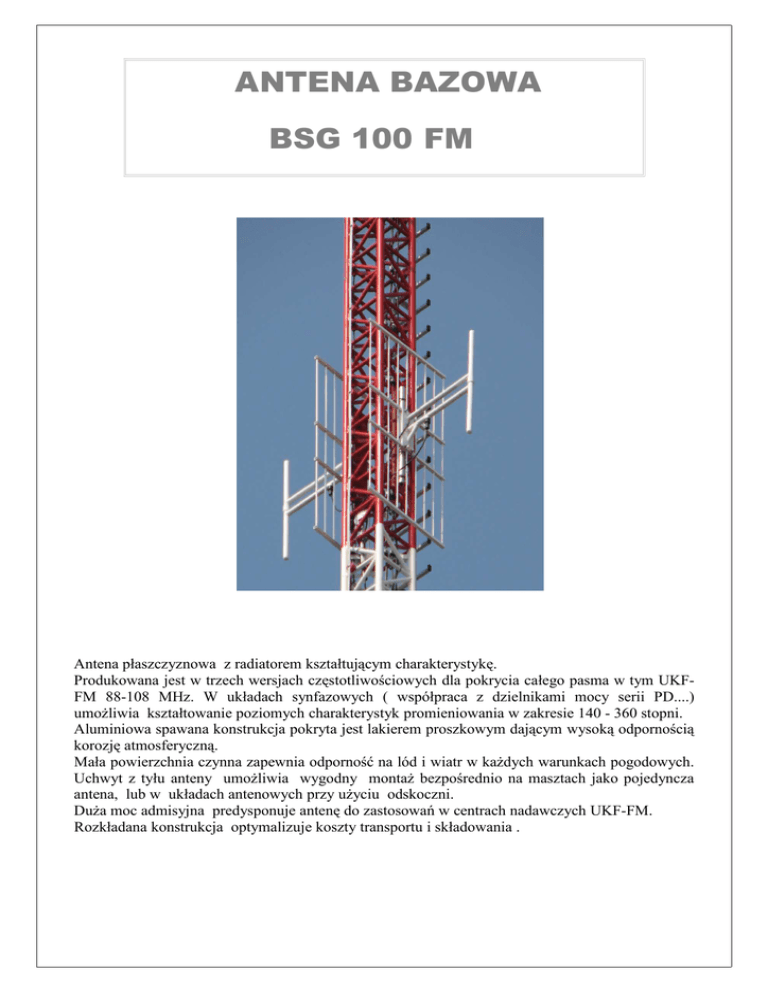ANTENA BAZOWA BSG 100 FM Antena płaszczyznowa z radiatorem kształtującym charakterystykę. Produkowana jest w trzech wersjach częstotliwościowych dla pokrycia całego pasma w tym UKFFM 88-108 MHz. W układach synfazowych ( współpraca z dzielnikami mocy serii PD....) umożliwia kształtowanie poziomych charakterystyk promieniowania w zakresie 140 - 360 stopni. Aluminiowa spawana konstrukcja pokryta jest lakierem proszkowym dającym wysoką odpornością korozję atmosferyczną. Mała powierzchnia czynna zapewnia odporność na lód i wiatr w każdych warunkach pogodowych. Uchwyt z tyłu anteny umożliwia wygodny montaż bezpośrednio na masztach jako pojedyncza antena, lub w układach antenowych przy użyciu odskoczni. Duża moc admisyjna predysponuje antenę do zastosowań w centrach nadawczych UKF-FM. Rozkładana konstrukcja optymalizuje koszty transportu i składowania . Właściwości elektryczne Zysk energetyczny 6 dBi Charakterystyka promieniowania Kierunkowa Impedancja 50 Ω Typ anteny panel Moc doprowadzona ciągła 500 W, lub 3,5 kW (gniazdo 7/16) Współczynnik fali SWR w pa śmi e p r a c y a n te n y <1,25 @ 88-108 MHz, 1,15 w środku pasma Zakres częstotliwości pracy 76-112 MHz Pasmo pracy 36 MHz @ SWR <1,5 Cechy mechaniczne Rodzaj złącza N, 7/16 Materiał Aluminium, konfiguracja spawana Polaryzacja Pion, poziom Średnica masztu mocującego FI 150 - 480 mm Masa 12 kg Zabezpieczenie antyodgromowe antena zwarta dla prądu stałego Wymiary radiatora 2175 x 1100 mm Okres gwarancji 48 miesięcy Opakowanie karton, folia Maksymalna prędkość wiatru 200 km/h Warunki klimatyczne Z a k r e s te mp e r a t ur pr a c y -40°C ÷ +70°C Wi l g o t no ś ć w z g l ęd na < 100% w temp. +40°C VSWR 70.00 - 170.00 MHz (cal on, cw on) M1: 1,361 @ 80,10 MHz M2: 1,139 @ 94,00 MHz M3: 1,257 @ 100,20 MHz M4: 1,488 @ 110,30 MHz 2,75 2,50 VSWR 2,25 2,00 1,75 1,50 Limit : 1,5 1,25 M1 M2 M3 M4 1,00 70 80 Resolution: 130 Model: MS 90 100 110 120 130 140 Frequency (70,0 - 170,0 MHz) 150 CAL:ON(COAX) Serial #: 00000000 Przebieg charakterystyki SWR 160 170 CW: ON Smoothing: 0 Konfiguracja anten Pionowa charakterystyka promieniowania Pozioma charakterystyka promieniowania wymiary ogólne anteny BSG 100 FM