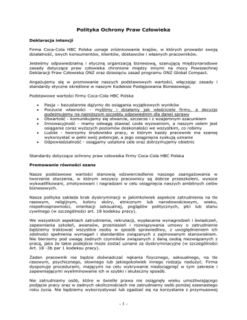 Polityka Ochrony Praw Człowieka Deklaracja intencji Firma Coca-Cola HBC Polska uznaje zróżnicowanie krajów, w których prowadzi swoją działalność, swych konsumentów, klientów, dostawców i własnych pracowników. Jesteśmy odpowiedzialną i etyczną organizacją biznesową, szanującą międzynarodowe zasady dotyczące praw człowieka chronione między innymi na mocy Powszechnej Deklaracji Praw Człowieka ONZ oraz dziesięciu zasad programu ONZ Global Compact. Angażujemy się w promowanie naszych podstawowych wartości, włączając zasady i standardy etyczne określone w naszym Kodeksie Postępowania Biznesowego. Podstawowe wartości firmy Coca-Cola HBC Polska • • • • • • Pasja – bezustannie dążymy do osiągania wyjątkowych wyników Poczucie własności - myślimy i działamy jak właściciele firmy, a decyzje podejmujemy na najniższym szczeblu odpowiednim dla danej sprawy Otwartość - komunikujemy się otwarcie, szczerze i z wzajemnym szacunkiem Innowacyjność - mamy odwagę stawiać czoła wyzwaniom, a naszym celem jest osiąganie coraz wyższych poziomów doskonałości we wszystkim, co robimy Ludzie - tworzymy środowisko pracy, w którym każdy pracownik ma szansę wykorzystać w pełni swój potencjał, a jego osiągnięcia zyskują uznanie Odpowiedzialność - osiągamy ustalone cele oraz dotrzymujemy obietnic Standardy dotyczące ochrony praw człowieka firmy Coca-Cola HBC Polska Promowanie równości szans Nasze podstawowe wartości stanowią odzwierciedlenie naszego zaangażowania w tworzenie otoczenia, w którym wszyscy pracownicy są dobrze przeszkoleni, wysoce wykwalifikowani, zmotywowani i nagradzani w celu osiągnięcia naszych ambitnych celów biznesowych. Nasza polityka zakłada brak dyskryminacji w jakimkolwiek aspekcie zatrudnienia na tle rasowym, religijnym, koloru skóry, etnicznym lub narodowościowym, wieku, niepełnosprawności, orientacji seksualnej, poglądów politycznych, płci lub stanu cywilnego (w szczególności art. 18 kodeksu pracy). We wszystkich aspektach zatrudnienia, rekrutacji, wypłacania wynagrodzeń i świadczeń, zapewniania szkoleń, awansów, przeniesień i rozwiązywania umowy o zatrudnienie będziemy traktować wszystkie osoby w sposób sprawiedliwy, z uwzględnieniem ich zdolności spełnienia wymagań i standardów związanych z zajmowanym stanowiskiem. Nie bierzemy pod uwagę żadnych czynników związanych z daną osobą niezwiązanych z pracą, jako że takie podejście może zostać uznane za dyskryminacyjne (w szczególności Art. 18 -3b par 1 kodeksu pracy). Żaden pracownik nie będzie doświadczać nękania fizycznego, seksualnego, na tle rasowym, psychicznego, słownego lub jakiegokolwiek innego rodzaju nadużyć. Firma dysponuje procedurami, mającymi na celu wykrywanie niedociągnięć w tym zakresie i zapewniającymi wyeliminowanie ich w szybki i skuteczny sposób. Nie zatrudniamy osób, które w świetle prawa nie osiągnęły wieku umożliwiającego podjęcie pracy oraz w żadnych okolicznościach nie zatrudniamy osób poniżej szesnastego roku życia. Nie będziemy wykorzystywać lub zgadzać się na korzystanie z przymusowej -1- siły roboczej w ramach jakichkolwiek działań. Będziemy wykorzystywać nasze wpływy w celu zapewnienia, by zasady te były przestrzegane w ramach naszego łańcucha dostaw poprzez zachęcanie do tego naszych dostawców i klientów. Tworzenie przyjaznego środowiska pracy Firma Coca-Cola HBC Polska traktuje nadrzędnie zdrowie, bezpieczeństwo i dobro swych pracowników. Polityka firmy Coca-Cola HBC Polska zakłada całkowitą zgodność z lokalnymi regulacjami dotyczącymi zdrowia i bezpieczeństwa w odniesieniu do wszystkich podejmowanych przez nią działań, włączając stosowanie wszelkich uzasadnionych i praktycznych środków zapewniających bezpieczne środowisko pracy w ramach działalności firmy. Jesteśmy zaangażowani w opracowywanie najwyższych standardów dotyczących zdrowia i bezpieczeństwa w pracy. W tym celu wdrożyliśmy standardy OHSAS 18000 („BHP (OHSAS) Procedure”, źródło: Intranet). Standardy dotyczące ochrony praw człowieka firmy Coca-Cola HBC Polska Godność ludzka w miejscu pracy Firma Coca-Cola HBC Polska promuje indywidualny udział w pracy zespołu. Podkreśla to jedna z podstawowych zasad firmy: Odpowiedzialność: „Indywidualna i absolutna odpowiedzialność wobec współpracowników,” promująca otwartość i pracę zespołową, zachęcająca pracowników do uwolnienia się od konwenansów i sprzyjająca budowaniu zaufania do ludzi. Wszyscy nasi pracownicy mają prawo oczekiwać pełnego respektowania ich godności i praw w ich miejscu pracy. Uznajemy ich zróżnicowanie kulturowe i indywidualne, starając się tworzyć silną kulturę zespołową. Zachowanie równowagi między życiem zawodowym a prywatnym Uznajemy i promujemy zachowywanie zdrowej równowagi pomiędzy życiem zawodowym a prywatnym naszych pracowników i respektujemy ich zobowiązania poza środowiskiem pracy. Uważamy, że każdy ma prawo do wypoczynku i czasu wolnego, w tym do stosownego ograniczenia liczby godzin roboczych i do okresowych płatnych urlopów. Zaangażowanie pracowników Nasza wewnętrzna strategia komunikacji ma zapewnić, by pracownicy na każdym poziomie zatrudnienia całkowicie skupiali się na planach, działaniach i zachowaniach mających na celu spełnienie oczekiwań konsumentów i klientów. Uważamy, że im wyższy jest poziom zaangażowania pracowników w działania firmy, tym bardziej są oni pozytywnie nastawieni, skuteczni i skupieni na osiągnięciu ambitnych celów biznesowych. W tym celu staramy się wspierać prowadzenie dwukierunkowej komunikacji w ramach firmy Coca-Cola HBC Polska i stale opracowywać niezbędne procesy. Firma Coca-Cola HBC Polska respektuje wyjątkowość swoich pracowników jako odrębnych jednostek, wspierając synergie płynące z pracy zespołowej, zarówno w ramach działalności krajowej,