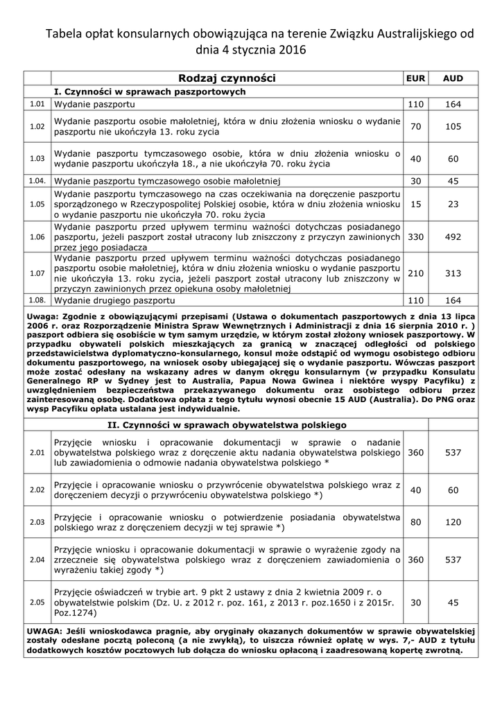 (Tabela opłat konsularnych od dnia 4 stycznia 2016)