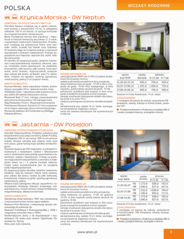 WCZASY RODZINNE POLSKA Krynica Morska - OW Neptun OŒRODEK WYPOCZYNKOWY NEPTUN Oœrodek Neptun znajduje siê w gêsto zalesionym terenie o powierzchni 12 ha, w odleg³oœci zaledwie 100 m od morza, co sprzyja korzystaniu z k¹pieli morskich i s³onecznych. Bazê noclegow¹ tworz¹ dwa pawilony - Alga i Koral w których mieszcz¹ siê pokoje 2 i 3-osob. z ³azienkami, balkonami i telewizorami. W pokojach znajduj¹ siê pojedyncze ³ó¿ka oraz wersalki, stolik, krzes³a lub foteliki oraz lodówka. W budynku Alga na II piêtrze pokoje o wy¿szym standardzie z ³ó¿kami ma³¿eñskimi. Pokoje wyposa¿one s¹ w tapczan, tapczan bis, stolik, foteliki lub krzes³a. W oœrodku do dyspozycji goœci: jadalnia, kawiarnia z sal¹ dyskotekow¹, œwietlica, si³ownia, sauna, kompleks boisk sportowych: do siatkówki, koszykówki, pi³ki rêcznej, pi³ki no¿nej, korty tenisowe, tenis sto³owy, wypo¿yczalnia rowerów, plac zabaw dla dzieci, amfiteatr, sala TV, biblioteka, miejsce na ognisko, parking ogrodzony, niestrze¿ony, p³atny (7 z³ / pojazd / doba). WARTO ZOBACZYÆ: Krynica Morska, stara zabudowa miasta, pochodz¹ca z pocz¹tku XX w., latarnia morska, molo. Wielb³¹dzi Garb - najwy¿sza sta³a wydma w Europie, blisko 50 metrów nad poziom morza. Rezerwat Buki (7 km), którego przeznaczeniem jest ochrona drzewostanu 150-letniego buka. K¹ty Rybackie (15 km) - Rezerwat Kormoranów Pañstwowe Muzeum Sztuthof (21 km) usytuowane w miejscu dawnego obozu koncentracyjnego. Wycieczki statkiem do Fromborka czy Elbl¹ga. Gdañsk (60 km). WA¯NE INFORMACJE: ubezpieczenie NNW (do 5.000 z³) p³atne dodatkowo 20 z³ osoba / turnus, op³ata uzdrowiskowa p³atna w dniu przyjazdu, doba hotelowa trwa od godz. 17:00 w dniu przyjazdu do godz. 10:00 dnia nastêpnego, w dniu wyjazdu, pokój nale¿y opuœciæ do godz. 10:00, pierwszym posi³kiem jest kolacja w dniu przyjazdu a ostatnim œniadanie w dniu wyjazdu, istnieje mo¿liwoœæ dokupienia obiadu dla dziecka do lat 4 w cenie 15 z³, miejsce parkingowe na terenie oœrodka bezp³atne, akceptowane psy, op³ata 15 z³ / doba, wymagane szczepienia, kaganiec i smycz, cena nie zawiera œwiadczeñ nie wymienionych w ofercie. sezon kod WJP osoba doros³a dziecko 8-12 lat 4-7 lat 21.05-02.07.16 999 z³ 799 zù 599 zù 02.07-27.08.16 1 259 z³ 1 099 zù 759 zù 27.08-24.09.16 999 z³ 799 zù 599 zù Dziecko 0-3 bez œwiadczeñ, 15 z³ / doba CENA ZAWIERA: 7 noclegów od soboty do soboty, wy¿ywienie FB œniadania, obiady, kolacje w formie bufetu, podatek VAT. .....Przejazd autokarem z Krakowa za dop³at¹ 280 z³ / osoba, przejazd dzienny, szczegó³y w biurze. Jastarnia - OW Posejdon OŒRODEK WYPOCZYNKOWY POSEJDON Oœrodek Wypoczynkowy Posejdon po³o¿ony jest bezpoœrednio przy pla¿y od strony Zatoki Puckiej, w odleg³oœci 250 m od morza i 500 m od centrum miasta. Atutem oœrodka jest w³asne molo oraz mini pla¿a, gdzie funkcjonuje szkó³ka windsurfingowa. Oœrodek dysponuje 240 miejscami, w pokojach 2osobowych z ³azienkami, radiem i telewizorem oraz 3-osobowych (dwa pokoje przechodnie) z ³azienkami, radiem i telewizorem. Pokoje na parterze maj¹ wejœcie bezpoœrednio z zewn¹trz a wiêkszoœæ pokoi na I i II piêtrze posiada balkony. Czêœæ pokoi przystosowana jest do przyjêcia osób niepe³nosprawnych. Do dyspozycji goœci oœrodka: jadalnia, kawiarnia, œwietlica, sala do æwiczeñ, bilard, tenis sto³owy, plac zabaw dla dzieci, boiska do pi³ki siatkowej, koszykowej, miejsce na grilla, parking ogrodzony, niestrze¿ony, p³atny. W³asna baza zabiegowa oferuje: aquavibron, hydromasa¿e, inhalacje, interdyn, krioterapiê, masa¿ klasyczny, masa¿ wirowy, masa¿ limfatyczny, magnetoterapiê, ok³ady borowinowe. WARTO ZOBACZYÆ: Zabytkow¹ chatê ryback¹ z 1881 roku zbudowan¹ z wyrzuconych przez morze czæsci statków. Muzeum Pod Strzech¹, z ekspozycj¹ sprzêtu stosowanego do po³owów ryb. Skansen Fortyfikacji II Rzeczypospolitej z 1939 r. i fragmenty umocnieñ Helu z 1936 r. Modernistyczne domy z lat dwudziestych i trzydziestych XX wieku przy ulicach Ogrodowej, Rybackiej i ks. Sychty. Molo, port, kutry rybackie. sezon kod WKN WA¯NE INFORMACJE: ubezpieczenie NNW (do 5.000 z³) p³atne dodatkowo 20 z³ osoba / turnus, op³ata uzdrowiskowa p³atna w dniu przyjazdu, doba hotelowa od godziny 17:00 do godziny 10:00, w dniu wyjazdu pokój nale¿y opuœciæ do godziny 10:00, pierwszym posi³kiem jest kolacja w dniu przyjazdu a ostatnim œniadanie w dniu wyjazdu, istnieje mo¿liwoœæ dokupienia obiadu dla dziecka do lat 4 w cenie 15 z³, miejsce parkingowe na terenie oœrodka gratis, akceptowane psy, op³ata 15 z³ / doba, wymagane szczepienia, kaganiec i smycz, cena nie zawiera œwiadczeñ nie wymienionych w ofercie. www.arion.pl dziecko osoba doros³a 8-12 lat 4-7 lat FB 21.05-02.07 HB 1 173 z³ 1 046 z³ 938 z³ 837 z³ 703 z³ 627 z³ FB HB FB 27.08-24.09 HB 1 322 z³ 1 196 z³ 1 173 z³ 1 046 z³ 1 058 z³ 956 z³ 938 z³ 837 z³ 794 z³ 717 z³ 703 z³ 627 z³ 02.07-27.08 Dziecko 0-3 bez œwiadczeñ, 15 z³ / doba CENA ZAWIERA: 7 noclegów od soboty do soboty, wy¿ywienie w formie bufetu - FB: œniadania, obiady, kolacje, podatek VAT. .....Przejazd autokarem z Krakowa za dop³at¹ 280 zl / osoba, przejazd dzienny, szczegó³y w biurze. 9