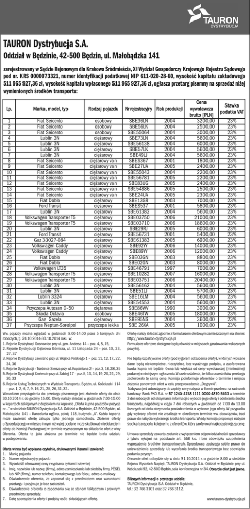 TAURON Dystrybucja S.A. Oddział w Będzinie, 42-500 Będzin, ul. Małobądzka 141 zarejestrowany w Sądzie Rejonowym dla Krakowa Śródmieścia, XI Wydział Gospodarczy Krajowego Rejestru Sądowego pod nr. KRS 0000073321, numer identyfikacji podatkowej NIP 611-020-28-60, wysokość kapitału zakładowego 511 965 927,36 zł, wysokość kapitału wpłaconego 511 965 927,36 zł, ogłasza przetarg pisemny na sprzedaż niżej wymienionych środków transportu: Lp. Marka, model, typ Rodzaj pojazdu 1 2 3 4 5 6 7 8 9 10 11 12 13 14 15 16 17 18 19 20 21 22 23 24 25 26 27 28 29 30 31 32 33 34 35 36 37 Fiat Seicento Fiat Seicento Fiat Seicento Lublin 3N Lublin 3N Lublin 3N Lublin 3N Fiat Seicento Fiat Seicento Fiat Seicento Fiat Seicento Fiat Seicento Fiat Seicento Fiat Seicento Fiat Doblo Ford Transit Lublin 3N Volkswagen Transporter T5 Volkswagen Transporter T5 Lublin 3N Ford Transit Gaz 33027-084 Volkswagen Caddy Volkswagen Caddy Fiat Doblo Fiat Doblo Volkswagen LT35 Volkswagen Transporter T5 Volkswagen Transporter T5 Lublin 3N Lublin 3N Lublin 3324 Lublin 3N Przyczepa Autosan D-50 Skoda Octavia Gaz Gazela Przyczepa Neptun-Sorelpol osobowy osobowy osobowy ciężarowy ciężarowy ciężarowy ciężarowy ciężarowy van ciężarowy van ciężarowy van ciężarowy van ciężarowy van ciężarowy van ciężarowy van ciężarowy ciężarowy ciężarowy ciężarowy ciężarowy ciężarowy ciężarowy ciężarowy ciężarowy ciężarowy ciężarowy ciężarowy ciężarowy ciężarowy ciężarowy ciężarowy ciężarowy ciężarowy ciężarowy ciężarowa osobowy ciężarowy przyczepa lekka Ww. pojazdy można oglądać w godzinach 8.00-14.00 przez 5 kolejnych dni roboczych, tj. 24.10.2014-30.10.2014 roku w: 1. Rejonie Dystrybucji Sosnowiec przy ul. gen. Andersa 14 – poz. 4, 8, 15, 2. Rejonie Dystrybucji Dąbrowa Górnicza, ul. 11 Listopada 24 – poz. 10, 23, 27, 37 3. Rejonie Dystrybucji Jaworzno przy ul. Wojska Polskiego 1 – poz. 11, 12, 17, 22, 34, 36 4. Rejonie Dystrybucji – Trzebinia-Siersza przy ul. Kopalniana 2 – poz. 3, 18, 28, 35 5. Rejonie Dystrybucji Zawiercie przy ul. Żabiej 17 – poz. 5, 13, 14, 19, 20, 24, 29, 30, 33 6. Rejonie Usług Technicznych w Wydziale Transportu, Będzin, ul. Kościuszki 114 – poz. 1, 2, 6, 7, 9, 16, 21, 25, 26, 31, 32. Warunkiem przystąpienia do przetargu pisemnego jest złożenie oferty do dnia 30.10.2014 r. do godziny 15.00. Oferty należy składać w godzinach 7.00-15.00 w kopertach zaklejonych z dopiskiem na kopercie „Oferta kupna pojazdów pozycja nr…” w siedzibie TAURON Dystrybucja S.A. Oddział w Będzinie, 42-500 Będzin, ul. Małobądzka 141 – Kancelaria ogólna, pokój 118, budynek „A”. Każda koperta może zawierać ofertę zakupu tylko jednego samochodu. Złożenie oferty u Sprzedającego w miejscu innym niż wyżej podane może skutkować niedotarciem oferty do Komisji Przetargowej w terminie wyznaczonym na składanie ofert z winy Oferenta. Oferta ta jako złożona po terminie nie będzie brała udziału w postępowaniu. Oferta winna być wypisana czytelnie, drukowanymi literami i zawierać: 1. Markę pojazdu 2. Numer rejestracyjny pojazdu 3. Wysokość oferowanej ceny (wypisana cyframi i słownie) 4. Imię, nazwisko lub nazwę (firmy), adres zamieszkania lub siedziby firmy, PESEL lub NIP (firmy), numer telefonu kontaktowego lub faksu, adres e-mailowy 5. Oświadczenie oferenta, że zapoznał się z przedmiotem oraz warunkami przetargu i przyjmuje je bez zastrzeżeń. 6. Oświadczenie oferenta o zapoznaniu się ze stanem faktycznym i prawnym przedmiotu sprzedaży. 7. Datę sporządzenia oferty i podpisy osób składających ofertę. Nr rejestracyjny Rok produkcji SBE36LN SBE56LK SBE55064 SBE73LN SBE56138 SBE57LK SBE49LJ SBES367 SBE27UA SBE55043 SBE56781 SBE83UG SBE54886 SBE24UA SBE13GR SBES537 SBE61382 SBE03750 SBE03710 SBE29RJ SBE56731 SBE61383 SBE92YY SBE89YY SBE03GN SBE02GN SBE46791 SBE10282 SBE03751 SBE56162 SBE51LJ SBE16LM SBE54553 SBE86WV SBE46TW SBE95NS SBE 26XA 2004 2004 2004 2004 2004 2004 2004 2001 2005 2004 2005 2005 2005 2005 2003 2001 2004 2006 2006 2005 2001 2005 2006 2006 2003 2003 1997 2007 2006 2004 2004 2004 2004 1990 2005 2004 2005 Cena Stawka wywoławcza podatku VAT brutto [PLN] 3200,00 23% 2500,00 23% 3000,00 23% 5600,00 23% 6000,00 23% 5600,00 23% 5600,00 23% 1800,00 23% 2400,00 23% 2200,00 23% 2200,00 23% 2400,00 23% 2500,00 23% 2300,00 23% 7000,00 23% 5800,00 23% 5600,00 23% 21000,00 23% 18600,00 23% 6000,00 23% 5400,00 23% 6900,00 23% 14000,00 23% 12000,00 23% 8800,00 23% 8000,00 23% 7000,00 23% 16000,00 23% 20400,00 23% 5600,00 23% 5700,00 23% 5600,00 23% 5600,00 23% 3000,00 23% 18000,00 23% 3600,00 23% 1000,00 23% Ofertę należy składać zgodnie z formularzem ofertowym zamieszczonym na stronie: http://www.tauron-dystrybucja.pl Formularze ofertowe dostępne będą również w miejscach garażowania wskazanych powyżej. Nie będą rozpatrywane oferty (pod rygorem odrzucenia oferty), w których wpisane dane będą niekompletne, nieczytelne, bez wyraźnego podpisu, a zaoferowana kwota kupna nie będzie równa lub większa od ceny wywoławczej (minimalnej) podanej w niniejszym ogłoszeniu. W razie ustalenia, że kilku uczestników przetargu zaoferowało tę samą cenę, Komisja poinformuje oferentów o terminie i miejscu złożenia ponownych ofert w celu przeprowadzenia „Dogrywki”. Nabywca jest zobowiązany do zapłaty ceny nabycia w formie przelewu na rachunek bankowy: Bank PKO S.A. nr 57 1240 4748 1111 0000 4870 5493 w terminie 3 dni roboczych od otrzymania informacji o wyborze jego oferty i odebrania środka transportu, najpóźniej w ciągu 7 dni roboczych w godzinach od 7.00 do 13.00 liczonych od dnia otrzymania powiadomienia o wyborze jego oferty. W przypadku gdy wybrany oferent nie zrealizuje w określonym terminie ww. obowiązków, traci prawo do nabycia wybranego środka transportu. Wtedy komisja proponuje nabycie środka transportu kolejnemu z oferentów, który zaoferował najkorzystniejsz