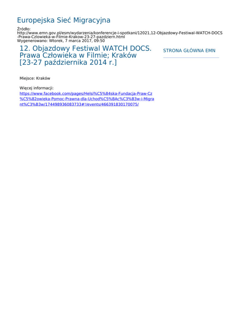 Europejska Sieć Migracyjna Źródło: http://www.emn.gov.pl/esm/wydarzenia/konferencje-i-spotkani/12021,12-Objazdowy-Festiwal-WATCH-DOCS -Prawa-Czlowieka-w-Filmie-Krakow-23-27-pazdziern.html Wygenerowano: Wtorek, 7 marca 2017, 09:50 12. Objazdowy Festiwal WATCH DOCS. Prawa Człowieka w Filmie; Kraków [23-27 października 2014 r.] Miejsce: Kraków Więcej informacji: https://www.facebook.com/pages/Helsi%C5%84ska-Fundacja-Praw-Cz %C5%82owieka-Pomoc-Prawna-dla-Uchod%C5%BAc%C3%B3w-i-Migra nt%C3%B3w/174498936083733#!/events/466391830170075/ STRONA GŁÓWNA EMN