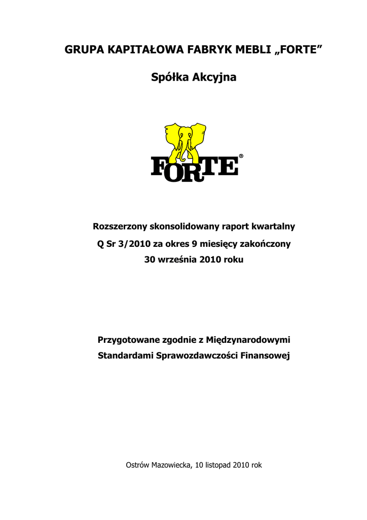 GRUPA KAPITAŁOWA FABRYK MEBLI „FORTE” Spółka Akcyjna Rozszerzony skonsolidowany raport kwartalny Q Sr 3/2010 za okres 9 miesięcy zakończony 30 września 2010 roku Przygotowane zgodnie z Międzynarodowymi Standardami Sprawozdawczości Finansowej Ostrów Mazowiecka, 10 listopad 2010 rok GRUPA KAPITAŁOWA FABRYK MEBLI „FORTE” S.A. Skrócone skonsolidowane sprawozdanie finansowe za okres 9 miesięcy zakończony 30 września 2010 wraz z informacją dodatkową ( w tysiącach złotych) WYBRANE DANE FINANSOWE PLN Dane dotyczące skróconego skonsolidowanego sprawozdania finansowego EURO 3 kwartały 2010 roku 3 kwartały 2009 roku 3 kwartały 2010 roku 3 kwartały 2009 roku 332 575 361 585 83 088 82 191 Zysk (strata) z działalności operacyjnej 21 802 32 325 5 447 7 348 Zysk (strata) przed opodatkowaniem 31 227 36 877 7 801 8 382 Zysk (strata) okresu przypadający Akcjonariuszom Jednostki Dominującej 24 159 29 434 6 036 6 691 Całkowite dochody za okres 23 485 31 230 5 867 7 099 Przepływy pieniężne netto z działalności operacyjnej 18 198 41 139 4 546 9 351 Przepływy pieniężne netto z działalności inwestycyjnej (8 652) (6 834) (2 162) (1 553) Przepływy pieniężne netto z działalności finansowej (35 128) (37 268) (8 776) (8 471) Zwiększenie netto stanu środków pieniężnych i ich ekwiwalentów (25 582) (2 963) (6 391) (674) 23 751 084 23 751 084 23 751 084 23 751 084 Przychody netto ze sprzedaży produktów, towarów, materiałów i usług Liczba akcji (w szt.) Zysk (strata) na jedną akcję zwykłą (w zł/ EUR) 1,02 1,24 0,25 0,28 Stan na 2010-09-30 Stan na 2009-12-31 Stan na 2010-09-30 Stan na 2009-12-31 Suma aktywów 437 244 447 748 109 667 108 989 Zobowiązania razem 134 506 144 675 33 736 35 216 Zobowiązania długoterminowe 31 307 67 980 7 852 16 547 Zobowiązania krótkoterminowe 103 199 76 695 25 884 18 669 Kapitał własny udziałowców Jednostki Dominującej 299 828 300 204 75 201 73 074 23 751 23 751 5 957 5 781 12,62 12,64 3,17 3,08 Kapitał zakładowy Wartość księgowa na jedną akcję (w zł/EUR) Komisja Nadzoru Finansowego 2 GRUPA KAPITAŁOWA FABRYK MEBLI „FORTE” S.A. Skrócone skonsolidowane sprawozdanie finansowe za okres 9 miesięcy zakończony 30 września 2010 wraz z informacją dodatkową ( w tysiącach złotych) WYBRANE DANE FINANSOWE PLN EURO Dane dotyczące skróconego sprawozdania finansowego 3 kwartały 2010 roku 3 kwartały 2009 roku 3 kwartały 2010 roku 3 kwartały 2009 roku Przychody netto ze sprzedaży produktów, towarów, materiałów i usług 307 268 334 724 76 765 76 086 Zysk (strata) z działalności operacyjnej 21 633 33 181 5 405 7 542 Zysk (strata) przed opodatkowaniem 34 599 42 925 8 644 9 757 Zysk (strata) okresu 28 540 35 871 7 130 8 154 Całkowite dochody za okres 27 199 39 306 6 795 8 935 Przepływy pieniężne netto z działalności operacyjnej 13 201 39 202 3 298 8 911 Przepływy pieniężne netto z działalności inwestycyjnej (4 247) (3 609) (1 061) (820) Przepływy pieniężne netto z działalności finansowej (34 821) (36 915) (8 699) (8 391) Zwiększenie netto stanu środków pieniężnych i ich ekwiwalentów (25 867) (1 322) (6 462) (301) 23 751 084 23 751 084 23 751 084 23 751 084 Zadeklarowana lub wypłacona dywidenda na jedną akcję (w zł/EUR) 1,00 0,10 0,25 0,02 Zysk (strata) na jedną akcję zwykłą (w zł/ EUR) 1,20 1,51 0,30 0,34 Liczba akcji (w szt.) Stan na Stan na 2010-09-30 2009-12-31 Stan na Stan na 2010-09-30 2009-12-31 Suma aktywów 438 120 444 027 109 887 108 083 Zobowiązania razem 124 533 133 888 31 235 32 590 Zobowiązania długoterminowe 24 412 60 725 6 123 14 781 Zobowiązania krótkoterminowe 100 121 73 163 25 112 17 809 Kapitał własny 313 587 310 139 78 652 75 493 23 751 23 751 5 957 5 781 13,20 13,06 3,31 3,18 Kapitał zakładowy Wartość księgowa na jedną akcję (w zł/EUR) Poszczególne pozycje sprawozdań finansowych zostały przeliczone według kursów podanych w punkcie 19 Informacji Dodatkowej do Skonsolidowanego raportu kwartalnego Q Sr 3/2010. Komisja Nadzoru Finansowego 3 GRUPA KAPITAŁOWA FABRYK MEBLI „FORTE” S.A. Skrócone skonsolidowane sprawozdanie finansowe za okres 9 miesięcy zakończony 30 września 2010 wraz z informacją dodatkową ( w tysiącach złotych) SKONSOLIDOWANY RACHUNEK ZYSKÓW I STRAT 3 kwartały narastająco od 01.01. do 30.09.2010 3 kwartał od 01.07. do 30.09.2010 3 kwartały narastająco od 01.01. do 30.09.2009 3 kwartał od 01.07. do 30.09.2009 329 239 116 320 358 916 118 212 Przychody ze sprzedaży usług Przychody ze sprzedaży 3 336 332 575 1 028 117 348 2 669 361 585 886 119 098 Działalność kontynuowana Przychody ze sprzedaży towarów, produktów i materiałów Koszt własny sprzedaży (215 032) (79 718) (218 379) (72 513) Zysk (strata) brutto ze sprzedaży 117 543 37 630 143 206 46 585 Pozostałe przychody operacyjne Koszty sprzedaży Koszty ogólnego zarządu Pozostałe koszty operacyjne Zysk (strata) z pochodnych instrumentów finansowych 2 152 (63 892) (23 850) (12 472) 2 321 (76) (22 770) (7 209) (5 100) 2 390 1 512 (67 394) (32 500) (8 552) (3 947) 571 (22 526) (11 154) (5 634) 4 270 Zysk (strata) z działalności operacyjnej 21 802 4 865 32 325 12 112 Przychody finansowe Koszty finansowe 10 505 (1 080) 4 803 (374) 7 248 (2 696) 3 458 (663) Zysk (strata) przed opodatkowaniem 31 227 9 294 36 877 14 907 Podatek dochodowy (6 957) (2 225) (7 371) (3 069) Zysk (strata) okresu z działalności kontynuowanej 24 270 7 069 29 506 11 838 - - - - Zysk (strata) okresu 24 270 7 069 29 506 11 838 Przypadający: Akcjonariuszom Jednostki Dominującej 24 159 7 023 29 434 11 781 111 46 72 57 – podstawowy 1,02 0,30 1,24 0,50 – rozwodniony - - - - Działalność zaniechana Zysk (strata) okresu z działalności zaniechanej Udziałowcom mniejszościowym Zysk (strata) na jedną akcję przypadający Akcjonariuszom Jednostki Dominującej w trakcie okresu ( w zł): Komisja Nadzoru Finansowego 4 GRUPA KAPITAŁOWA FABRYK MEBLI „FORTE” S.A. Skróc