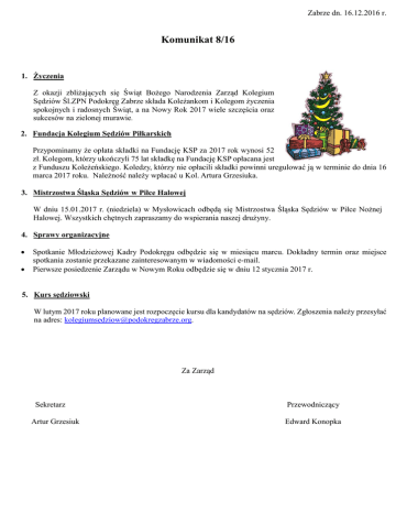 Zabrze dn. 16.12.2016 r. Komunikat 8/16 1. Życzenia Z okazji zbliżających się Świąt Bożego Narodzenia Zarząd Kolegium Sędziów Śl.ZPN Podokręg Zabrze składa Koleżankom i Kolegom życzenia spokojnych i radosnych Świąt, a na Nowy Rok 2017 wiele szczęścia oraz sukcesów na zielonej murawie. 2. Fundacja Kolegium Sędziów Piłkarskich Przypominamy że opłata składki na Fundację KSP za 2017 rok wynosi 52 zł. Kolegom, którzy ukończyli 75 lat składkę na Fundację KSP opłacana jest z Funduszu Koleżeńskiego. Koledzy, którzy nie opłacili składki powinni uregulować ją w terminie do dnia 16 marca 2017 roku. Należność należy wpłacać u Kol. Artura Grzesiuka. 3. Mistrzostwa Śląska Sędziów w Piłce Halowej W dniu 15.01.2017 r. (niedziela) w Mysłowicach odbędą się Mistrzostwa Śląska Sędziów w Piłce Nożnej Halowej. Wszystkich chętnych zapraszamy do wspierania naszej drużyny. 4. Sprawy organizacyjne • • Spotkanie Młodzieżowej Kadry Podokręgu odbędzie się w miesiącu marcu. Dokładny termin oraz miejsce spotkania zostanie przekazane zainteresowanym w wiadomości e-mail. Pierwsze posiedzenie Zarządu w Nowym Roku odbędzie się w dniu 12 stycznia 2017 r. 5. Kurs sędziowski W lutym 2017 roku planowane jest rozpoczęcie kursu dla kandydatów na sędziów. Zgłoszenia należy przesyłać na adres: [email protected]. Za Zarząd Sekretarz Artur Grzesiuk Przewodniczący Edward Konopka