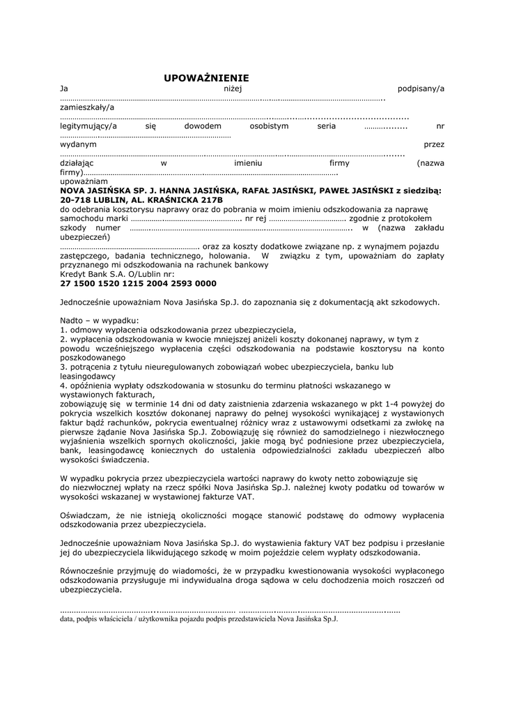 UPOWAŻNIENIE Ja niżej podpisany/a …………………………………………………………………………………….….….………………………………………….. zamieszkały/a ………………………………………………………………………………………...……....…...................................... legitymujący/a się dowodem osobistym seria ………......... nr ……………….……………………………………………………… wydanym przez …………………………………………………………….…………………………….…..………………………………………........ działając w imieniu firmy (nazwa firmy)………………………………………………….………………………………………………………. upoważniam NOVA JASIŃSKA SP. J. HANNA JASIŃSKA, RAFAŁ JASIŃSKI, PAWEŁ JASIŃSKI z siedzibą: 20-718 LUBLIN, AL. KRAŚNICKA 217B do odebrania kosztorysu naprawy oraz do pobrania w moim imieniu odszkodowania za naprawę samochodu marki …………….………………………………. nr rej ………………………………. zgodnie z protokołem szkody numer ……….……………………………………………….………………………………….. w (nazwa zakładu ubezpieczeń) …………………………………………………………. oraz za koszty dodatkowe związane np. z wynajmem pojazdu zastępczego, badania technicznego, holowania. W związku z tym, upoważniam do zapłaty przyznanego mi odszkodowania na rachunek bankowy Kredyt Bank S.A. O/Lublin nr: 27 1500 1520 1215 2004 2593 0000 Jednocześnie upoważniam Nova Jasińska Sp.J. do zapoznania się z dokumentacją akt szkodowych. Nadto – w wypadku: 1. odmowy wypłacenia odszkodowania przez ubezpieczyciela, 2. wypłacenia odszkodowania w kwocie mniejszej aniżeli koszty dokonanej naprawy, w tym z powodu wcześniejszego wypłacenia części odszkodowania na podstawie kosztorysu na konto poszkodowanego 3. potrącenia z tytułu nieuregulowanych zobowiązań wobec ubezpieczyciela, banku lub leasingodawcy 4. opóźnienia wypłaty odszkodowania w stosunku do terminu płatności wskazanego w wystawionych fakturach, zobowiązuję się w terminie 14 dni od daty zaistnienia zdarzenia wskazanego w pkt 1-4 powyżej do pokrycia wszelkich kosztów dokonanej naprawy do pełnej wysokości wynikającej z wystawionych faktur bądź rachunków, pokrycia ewentualnej różnicy wraz z ustawowymi odsetkami za zwłokę na pierwsze żądanie Nova Jasińska Sp.J. Zobowiązuję się również do samodzielnego i niezwłocznego wyjaśnienia wszelkich spornych okoliczności, jakie mogą być podniesione przez ubezpieczyciela, bank, leasingodawcę koniecznych do ustalenia odpowiedzialności zakładu ubezpieczeń albo wysokości świadczenia. W wypadku pokrycia przez ubezpieczyciela wartości naprawy do kwoty netto zobowiązuje się do niezwłocznej wpłaty na rzecz spółki Nova Jasińska Sp.J. należnej kwoty podatku od towarów w wysokości wskazanej w wystawionej fakturze VAT. Oświadczam, że nie istnieją okoliczności mogące stanowić podstawę do odmowy wypłacenia odszkodowania przez ubezpieczyciela. Jednocześnie upoważniam Nova Jasińska Sp.J. do wystawienia faktury VAT bez podpisu i przesłanie jej do ubezpieczyciela likwidującego szkodę w moim pojeździe celem wypłaty odszkodowania. Równocześnie przyjmuję do wiadomości, że w przypadku kwestionowania wysokości wypłaconego odszkodowania przysługuje mi indywidualna droga sądowa w celu dochodzenia moich roszczeń od ubezpieczyciela. …………………………………...…………………………… …………….……….……………………………….…… data, podpis właściciela / użytkownika pojazdu podpis przedstawiciela Nova Jasińska Sp.J.
