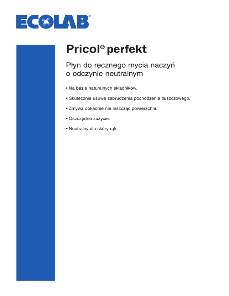 Pricol® perfekt Płyn do ręcznego mycia naczyń o odczynie neutralnym • Na bazie naturalnych składników. • Skutecznie usuwa zabrudzenia pochodzenia tłuszczowego. • Zmywa dokadnie nie niszcząc powierzchni. • Oszczędne zużycie. • Neutralny dla skóry rąk. Pricol® perfekt Płyn do ręcznego mycia naczyń o odczynie neutralnym Przeznaczenie: Do zmywania wszystkich wodoodpornych przedmiotów i powierzchni, takich jak: szklanki, naczynia, przedmioty ze szkła, sztućce, okna, flizy, płytki podłogowe, wanny, umywalki, powierzchnie z tworzyw sztucznych, kaloryfery, urządzenia kuchenne, drzwi, schody, itp. Sposób użycia: Mycie naczyń: 8 ml na 10 l wody. Zmywanie powierzchni: 20 ml na 10 l wody. Właściwości: Pricol perfekt zawiera aktywne myjące substancje na bazie oleju kokosowego, naturalny alkohol i substancje pomocnicze. Jest preparatem o odczynie neutralnym, a przez to łagodnym dla skóry rąk. Pricol perfekt myje i doskonale rozpuszcza tłuszcz nie niszcząc przy tym mytego materiału. Po wyschnięciu przedmioty oraz powierzchnie błyszczą i są przejrzyste. Dodatkowe mycie lub wycieranie jest zbędne. Skład chemiczny: Anionowe, niejonowe i amfoteryczne związki powierzchniowo czynne na bazie oleju kokosowego, naturalny alkohol, barwniki. Przy użyciu środka w postaci koncentratu lub w roztworze roboczym odczyn pH jest neutralny. Uwaga: Przed użyciem produktu należy się upewnić, że pracownicy przeczytali i zrozumieli treść etykiet i przepisów bhp. Należy przestrzegać wskazówek bezpieczeństwa zawartych na etykiecie produktu oraz udzielanych przez konsultantów firmy Ecolab. Dane ekologiczne: Opakowanie: Znakomicie ulega biodegradacji. W znacznym stopniu przekracza wymagania ustawy dotyczącej rozpadu biologicznego środków czyszczących oraz piorących. Kanister: 10 l. Symbol: PF10K. Kanister: 30 l. Symbol: PF30K. CSPRICOLP/P/190802/PL Produkt posiada atest PZH Ecolab Sp. z o.o. 30-504 Kraków; ul. Kalwaryjska 69 tel.: 012/26 16 100; fax: 012/26 16 101 www.ecolab.com