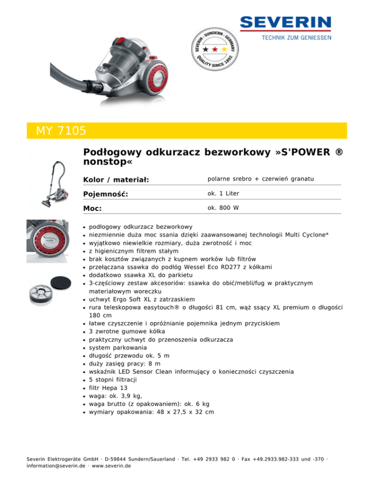 MY 7105 Podłogowy odkurzacz bezworkowy »S'POWER ® nonstop« Kolor / materiał: polarne srebro + czerwień granatu Pojemność: ok. 1 Liter Moc: ok. 800 W ● ● ● ● ● ● ● ● ● ● ● ● ● ● ● ● ● ● ● ● ● ● podłogowy odkurzacz bezworkowy niezmiennie duża moc ssania dzięki zaawansowanej technologii Multi Cyclone* wyjątkowo niewielkie rozmiary, duża zwrotność i moc z higienicznym filtrem stałym brak kosztów związanych z kupnem worków lub filtrów przełączana ssawka do podłóg Wessel Eco RD277 z kółkami dodatkowo ssawka XL do parkietu 3-częściowy zestaw akcesoriów: ssawka do obić/mebli/fug w praktycznym materiałowym woreczku uchwyt Ergo Soft XL z zatrzaskiem rura teleskopowa easytouch® o długości 81 cm, wąż ssący XL premium o długości 180 cm łatwe czyszczenie i opróżnianie pojemnika jednym przyciskiem 3 zwrotne gumowe kółka praktyczny uchwyt do przenoszenia odkurzacza system parkowania długość przewodu ok. 5 m duży zasięg pracy: 8 m wskaźnik LED Sensor Clean informujący o konieczności czyszczenia 5 stopni filtracji filtr Hepa 13 waga: ok. 3,9 kg, waga brutto (z opakowaniem): ok. 6 kg wymiary opakowania: 48 x 27,5 x 32 cm Severin Elektrogeräte GmbH · D-59844 Sundern/Sauerland · Tel. +49 2933 982 0 · Fax +49.2933.982-333 und -370 · [email protected] · www.severin.de