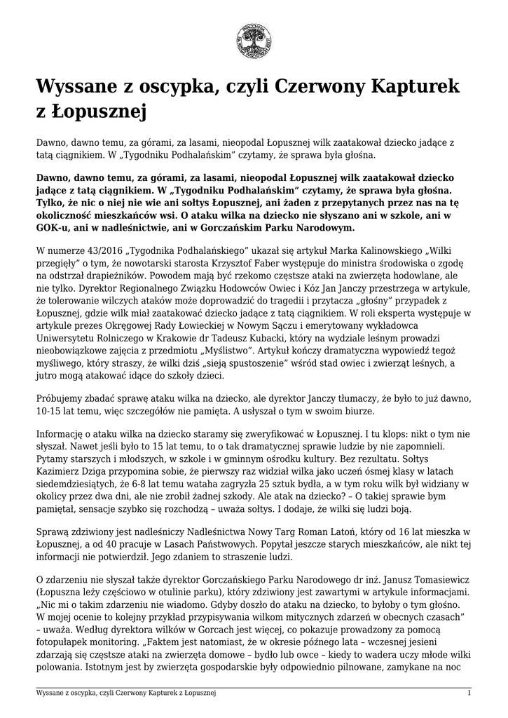Wyssane z oscypka, czyli Czerwony Kapturek z Łopusznej Dawno, dawno temu, za górami, za lasami, nieopodal Łopusznej wilk zaatakował dziecko jadące z tatą ciągnikiem. W „Tygodniku Podhalańskim” czytamy, że sprawa była głośna. Dawno, dawno temu, za górami, za lasami, nieopodal Łopusznej wilk zaatakował dziecko jadące z tatą ciągnikiem. W „Tygodniku Podhalańskim” czytamy, że sprawa była głośna. Tylko, że nic o niej nie wie ani sołtys Łopusznej, ani żaden z przepytanych przez nas na tę okoliczność mieszkańców wsi. O ataku wilka na dziecko nie słyszano ani w szkole, ani w GOK-u, ani w nadleśnictwie, ani w Gorczańskim Parku Narodowym. W numerze 43/2016 „Tygodnika Podhalańskiego” ukazał się artykuł Marka Kalinowskiego „Wilki przegięły” o tym, że nowotarski starosta Krzysztof Faber występuje do ministra środowiska o zgodę na odstrzał drapieżników. Powodem mają być rzekomo częstsze ataki na zwierzęta hodowlane, ale nie tylko. Dyrektor Regionalnego Związku Hodowców Owiec i Kóz Jan Janczy przestrzega w artykule, że tolerowanie wilczych ataków może doprowadzić do tragedii i przytacza „głośny” przypadek z Łopusznej, gdzie wilk miał zaatakować dziecko jadące z tatą ciągnikiem. W roli eksperta występuje w artykule prezes Okręgowej Rady Łowieckiej w Nowym Sączu i emerytowany wykładowca Uniwersytetu Rolniczego w Krakowie dr Tadeusz Kubacki, który na wydziale leśnym prowadzi nieobowiązkowe zajęcia z przedmiotu „Myślistwo”. Artykuł kończy dramatyczna wypowiedź tegoż myśliwego, który straszy, że wilki dziś „sieją spustoszenie” wśród stad owiec i zwierząt leśnych, a jutro mogą atakować idące do szkoły dzieci. Próbujemy zbadać sprawę ataku wilka na dziecko, ale dyrektor Janczy tłumaczy, że było to już dawno, 10-15 lat temu, więc szczegółów nie pamięta. A usłyszał o tym w swoim biurze. Informację o ataku wilka na dziecko staramy się zweryfikować w Łopusznej. I tu klops: nikt o tym nie słyszał. Nawet jeśli było to 15 lat temu, to o tak dramatycznej sprawie ludzie by nie zapomnieli. Pytamy starszych i młodszych, w szkole i w gminnym ośrodku kultury. Bez rezultatu. Sołtys Kazimierz Dziga przypomina sobie, że pierwszy raz widział wilka jako uczeń ósmej klasy w latach siedemdziesiątych, że 6-8 lat temu wataha zagryzła 25 sztuk bydła, a w tym roku wilk był widziany w okolicy przez dwa dni, ale nie zrobił żadnej szkody. Ale atak na dziecko? – O takiej sprawie bym pamiętał, sensacje szybko się rozchodzą – uważa sołtys. I dodaje, że wilki się ludzi boją. Sprawą zdziwiony jest nadleśniczy Nadleśnictwa Nowy Targ Roman Latoń, który od 16 lat mieszka w Łopusznej, a od 40 pracuje w Lasach Państwowych. Popytał jeszcze starych mieszkańców, ale nikt tej informacji nie potwierdził. Jego zdaniem to straszenie ludzi. O zdarzeniu nie słyszał także dyrektor Gorczańskiego Parku Narodowego dr inż. Janusz Tomasiewicz (Łopuszna leży częściowo w otulinie parku), który zdziwiony jest zawartymi w artykule informacjami. „Nic mi o takim zdarzeniu nie wiadomo. Gdyby doszło do ataku na dziecko, to byłoby o tym głośno. W mojej ocenie to kolejny przykład przypisywania wilkom mitycznych zdarzeń w obecnych czasach” – uważa. Według dyrektora wilków w Gorcach jest więcej, co pokazuje prowadzony za pomocą fotopułapek monitoring. „Faktem jest natomiast, że w okresie późnego lata – wczesnej jesieni zdarzają się częstsze ataki na zwierzęta domowe – bydło lub owce – kiedy to wadera uczy młode wilki polowania. Istotnym jest by zwierzęta gospodarskie były odpowiednio pilnowane, zamykane na noc Wyssane z oscypka, czyli Czerwony Kapturek z Łopusznej 1 jeśli są wypasane na łąkach i pastwiskach otaczających miejscowości. W mijającym sezonie funkcjonował u nas wypas na Hali Długiej pod Turbaczem. Z tego co wiem, baca wypasający stado owiec nie odnotował pobić przez wilki wśród swojej trzody, pomimo, że w pobliżu się niejednokrotnie pojawiały; tutaj efekty przyniósł dozór i stosowane zabezpieczenia” – podkreśla. Wieści o ataku wilka na człowieka nie dotarły również do pracowników Regionalnej Dyrekcji Ochrony Środowiska w Krakowie, która zajmuje się m.in. wypłatą pieniędzy za wilcze szkody. Tyle faktów, a teraz komentarz: Dziennikarz nie jest wszechwiedzący i może się zdarzyć, że zostanie przez swojego rozmówcę wprowadzony w błąd: celowo lub przez przypadek. Ale rzetelność w tym zawodzie zaufania publicznego wymaga, by informacje przed publikacją sprawdzać. Mało tego, w tekście wypowiadają się tylko zwolennicy polowań na wilki. A co z fundamentalną dla obiektywizmu „drugą nogą?” Czy jedynym „znawcą tematu” z tytułem naukowym musiał być akurat zasłużony dla Polskiego Związku Łowieckiego przewodniczący Okręgowej Rady Łowieckiej i zwolennik strzelania do wilków? Na stronie internetowej „Tygodnika Podhalańskiego” znaleźć można zdjęcie redaktora Kalinowskiego w kamuflażu, z bronią i myśliwskim psem. Podpis pod fotografią nie daje złudzeń, co do hobby dziennikarza, który: „Swoje fantazje realizuje, redagując rubrykę „wyssane z oscypka”. Posiadacz jamnika Norka i foksterierki Heśki. Wielokrotnie dawał wyraz swojej miłości do szeroko pojętej przyrody, co nie przeszkadza mu jednocześnie uganiać się po lesie ze strzelbą”. Czyżby zamiłowanie do łowiectwa miało wpływ na wymowę artykułu o wilkach? Jeśli ktoś w tej sprawie przegiął, to nie wilki, a raczej redaktor Marek Kalinowski i jego informatorzy. Słynny mieszkaniec Łopusznej, ks. Józef Tischner, tak napisał w „Historii filozofii po góralsku”: „Góralska teoria poznania mówi, że są trzy prawdy: święta prowda, tyż prowda i g___o prowda”. Jak można zakwalifikować opowieść o ataku wilka na dziecko w Łopusznej? Ale żarty się skończyły, bo straszenie
