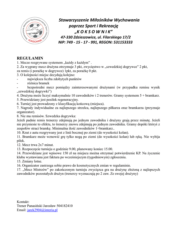 Stowarzyszenie Miłośników Wychowania poprzez Sport i Rekreację „K O K S O W N I K” 47-330 Zdzieszowice, ul. Filarskiego 17/2 NIP: 749 - 15 - 17 - 991, REGON: 531153333 REGULAMIN 1. Mecze rozgrywane systemem „każdy z każdym” . 2. Za wygrany mecz drużyna otrzymuje 3 pkt, zwycięstwo w „szwedzkiej dogrywce” 2 pkt, za remis (i porażkę w dogrywce) 1pkt, za porażkę 0 pkt. 3. O kolejności miejsc decydują kolejno: największa liczba zdobytych punktów różnica bramek bezpośredni mecz pomiędzy zainteresowanymi drużynami (w przypadku remisu wynik „szwedzkiej dogrywki”) 4. Drużyna może liczyć maksymalnie 10 zawodników i 2 trenerów. Gramy systemem 5 + bramkarz. 5. Przewidziany jest posiłek regeneracyjny. 6. Turniej jest prowadzony z klasyfikacją końcową (miejsca). 7. Nagrody indywidualne za najlepszego strzelca, najlepszego piłkarza oraz bramkarza (przyznaje organizator). 8. Nie ma remisów. Szwedzka dogrywka: Jeżeli padnie remis trenerzy zdejmują po jednym zawodniku i drużyny grają przez minutę. Jeżeli nie przyniesie to efektu, to trenerzy znowu zdejmują po jednym zawodniku. Gramy dopóki któryś z zespołów straci bramkę. Minimalna ilość zawodników 1+bramkarz.. 10. Rzut z autu rozgrywany jest z linii bocznej po ziemi (do wysokości kolan). 11. Bramkarz może wznowić grę tylko nogą po ziemi (do wysokości kolan) lub ręką. Nie wybija piłek. 12. Mecz trwa 2x7 minut. 13. Rozpoczęcie turnieju o godzinie 9.00, planowany koniec 15.00. 14. Przewidziane jest wpisowe 150 zł na miejscu można otrzymać potwierdzenie KP. Na życzenie klubu wystawiana jest faktura po wcześniejszym (tygodniowym) zgłoszeniu. 15. Zmiany lotne. 16. Organizator zastrzega sobie prawo do kosmetycznych zmian w regulaminie. 17. „Mecz Mistrzów” po zakończonym turnieju zwycięzca gra na drużynę złożoną z najlepszych zawodników pozostałych drużyn (trenerzy wyznaczają po 2 zaw. Ze swojej drużyny) Kontakt: Trener Panasiński Jarosław 504182410 Email: [email protected]