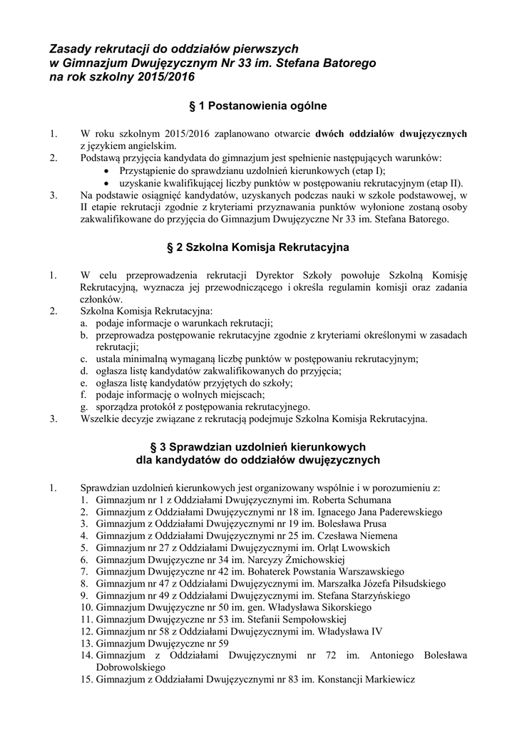 Zasady rekrutacji do oddziałów pierwszych w Gimnazjum Dwujęzycznym Nr 33 im. Stefana Batorego na rok szkolny 2015/2016 § 1 Postanowienia ogólne 1. 2. 3. W roku szkolnym 2015/2016 zaplanowano otwarcie dwóch oddziałów dwujęzycznych z językiem angielskim. Podstawą przyjęcia kandydata do gimnazjum jest spełnienie następujących warunków: • Przystąpienie do sprawdzianu uzdolnień kierunkowych (etap I); • uzyskanie kwalifikującej liczby punktów w postępowaniu rekrutacyjnym (etap II). Na podstawie osiągnięć kandydatów, uzyskanych podczas nauki w szkole podstawowej, w II etapie rekrutacji zgodnie z kryteriami przyznawania punktów wyłonione zostaną osoby zakwalifikowane do przyjęcia do Gimnazjum Dwujęzyczne Nr 33 im. Stefana Batorego. § 2 Szkolna Komisja Rekrutacyjna 1. 2. 3. W celu przeprowadzenia rekrutacji Dyrektor Szkoły powołuje Szkolną Komisję Rekrutacyjną, wyznacza jej przewodniczącego i określa regulamin komisji oraz zadania członków. Szkolna Komisja Rekrutacyjna: a. podaje informacje o warunkach rekrutacji; b. przeprowadza postępowanie rekrutacyjne zgodnie z kryteriami określonymi w zasadach rekrutacji; c. ustala minimalną wymaganą liczbę punktów w postępowaniu rekrutacyjnym; d. ogłasza listę kandydatów zakwalifikowanych do przyjęcia; e. ogłasza listę kandydatów przyjętych do szkoły; f. podaje informację o wolnych miejscach; g. sporządza protokół z postępowania rekrutacyjnego. Wszelkie decyzje związane z rekrutacją podejmuje Szkolna Komisja Rekrutacyjna. § 3 Sprawdzian uzdolnień kierunkowych dla kandydatów do oddziałów dwujęzycznych 1. Sprawdzian uzdolnień kierunkowych jest organizowany wspólnie i w porozumieniu z: 1. Gimnazjum nr 1 z Oddziałami Dwujęzycznymi im. Roberta Schumana 2. Gimnazjum z Oddziałami Dwujęzycznymi nr 18 im. Ignacego Jana Paderewskiego 3. Gimnazjum z Oddziałami Dwujęzycznymi nr 19 im. Bolesława Prusa 4. Gimnazjum z Oddziałami Dwujęzycznymi nr 25 im. Czesława Niemena 5. Gimnazjum nr 27 z Oddziałami Dwujęzycznymi im. Orląt Lwowskich 6. Gimnazjum Dwujęzyczne nr 34 im. Narcyzy Żmichowskiej 7. Gimnazjum Dwujęzyczne nr 42 im. Bohaterek Powstania Warszawskiego 8. Gimnazjum nr 47 z Oddziałami Dwujęzycznymi im. Marszałka Józefa Piłsudskiego 9. Gimnazjum nr 49 z Oddziałami Dwujęzycznymi im. Stefana Starzyńskiego 10. Gimnazjum Dwujęzyczne nr 50 im. gen. Władysława Sikorskiego 11. Gimnazjum Dwujęzyczne nr 53 im. Stefanii Sempołowskiej 12. Gimnazjum nr 58 z Oddziałami Dwujęzycznymi im. Władysława IV 13. Gimnazjum Dwujęzyczne nr 59 14. Gimnazjum z Oddziałami Dwujęzycznymi nr 72 im. Antoniego Bolesława Dobrowolskiego 15. Gimnazjum z Oddziałami Dwujęzycznymi nr 83 im. Konstancji Markiewicz 2. 3. 4. 16. Gimnazjum z Oddziałami Dwujęzycznymi nr 93 im. Księżnej Izabeli Czartoryskiej 17. Gimnazjum nr 103 z Oddziałami Integracyjnymi i Oddziałami Dwujęzycznymi 18. im. Ks. Jana Twardowskiego 19. Gimnazjum nr 104 20. Gimnazjum nr 113 z Oddziałami Dwujęzycznymi im. Zawiszaków Proporca "Victoria" 21. Gimnazjum nr 122 z Oddziałami Dwujęzycznymi im. gen. Charlesa de Gaulle’a 22. Gimnazjum nr 123 z Oddziałami Dwujęzycznymi i Oddziałami Integracyjnymi im. Jana Pawła II 23. Gimnazjum nr 124 im. Polskich Noblistów 24. Gimnazjum z Oddziałami Dwujęzycznymi nr 133 im. Księdza Stefana Kardynała Wyszyńskiego 25. Gimnazjum nr 142 z Oddziałami Dwujęzycznymi im. Roberta Schumana 26. Gimnazjum nr 164 z Oddziałami Integracyjnymi i Oddziałami Dwujęzycznymi im. Polskich Olimpijczyków 27. Gimnazjum nr 165 Kandydat przystępuje do sprawdzianu uzdolnień kierunkowych w tej z ww. szkół, w której znajduje się pierwszy, najbardziej preferowany przez niego oddział dwujęzyczny. Sprawdzian uzdolnień kierunkowych dla kandydatów odbędzie się 14 maja 2015 o godz. 8:15 Uzyskany przez kandydata wynik sprawdzianu uzdolnień kierunkowych jest przekazywany do wszystkich szkół z ww. listy. § 3 Wymagane dokumenty 1. 2. 3. 4. 5. Od 13 kwietnia do 8 maja 2015: • wniosek o przyjęcie do szkoły (wygenerowany w internetowym systemie rekrutacji); Od 26 czerwca do 1 lipca 2015: • kopia świadectwa ukończenia szkoły podstawowej; • kopia zaświadczenia o szczegółowych wynikach sprawdzianu przeprowadzonego w ostatnim roku nauki w szkole podstawowej; • kopie zaświadczeń o innych osiągnięciach edukacyjnych. Niezłożenie w odpowiednim terminie któregokolwiek z wymaganych dokumentów spowoduje niedopuszczenie kandydata do dalszego postępowania rekrutacyjnego. Od 6 lipca do 7 lipca 2015 – tylko osoby zakwalifikowane do przyjęcia składają: • oryginał świadectwa ukończenia szkoły podstawowej; • oryginał zaświadczenia o szczegółowych wynikach sprawdzianu przeprowadzonego w ostatnim roku nauki w szkole podstawowej; • deklarację woli uczęszczania do Gimnazjum Dwujęzyczne Nr 33 im. Stefana Batorego; • ankietę ucznia; • kartę zdrowia ucznia ze szkoły podstawowej; • 3 fotografie. Złożenie deklaracji woli uczęszczania do Gimnazjum Dwujęzycznego Nr 33 im. Stefana Batorego oraz ankiety ucznia jest potwierdzeniem wyboru Gimnazjum Dwujęzycznego Nr 33 im. Stefana Batorego i jest podstawą do umieszczenia na liście przyjętych do gimnazjum. Niedostarczenie dokumentów w terminie skutkuje wykreśleniem kandydata z listy przyjętych. § 4 Kryteria przyznawania punktów w drugim etapie rekrutacji do oddziałów dwujęzycznych 1. 2. 3. 4. Laureaci konkursów przedmiotowych o zasięgu wojewódzkim lub ponadwojewódzkim, organizowanych przez Kuratora Oświaty, przeprowadzonych zgodnie z przepisami Rozporządzenia MENiS z 29 stycznia 2002, których program obejmuje w całości lub poszerza treści podstawy programowej co najmniej jednego przedmiotu, są przyjmowani niezależnie od pozostałych kryteriów (otrzymują maksymalną liczbę punktów rekrutacyjnych). Maksymalna liczba punktów możliwych do uzyskania wynosi 140, w tym: • 50 punktów za wynik spr