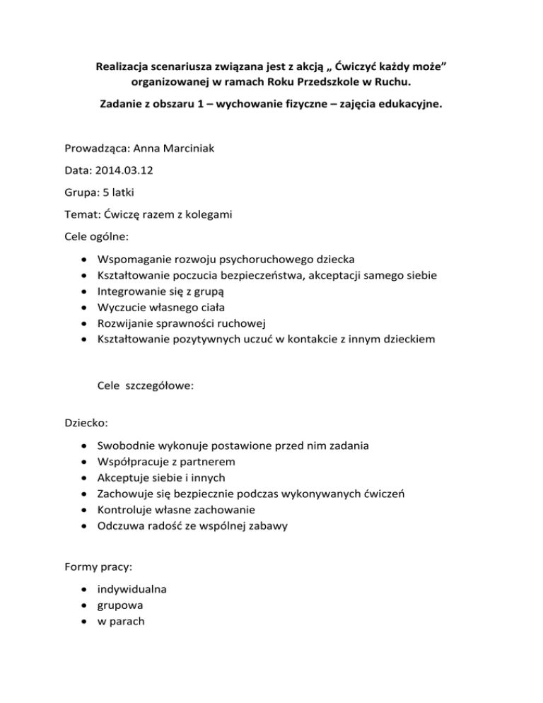 Realizacja scenariusza związana jest z akcją „ Ćwiczyć każdy może” organizowanej w ramach Roku Przedszkole w Ruchu. Zadanie z obszaru 1 – wychowanie fizyczne – zajęcia edukacyjne. Prowadząca: Anna Marciniak Data: 2014.03.12 Grupa: 5 latki Temat: Ćwiczę razem z kolegami Cele ogólne: Wspomaganie rozwoju psychoruchowego dziecka Kształtowanie poczucia bezpieczeństwa, akceptacji samego siebie Integrowanie się z grupą Wyczucie własnego ciała Rozwijanie sprawności ruchowej Kształtowanie pozytywnych uczuć w kontakcie z innym dzieckiem Cele szczegółowe: Dziecko: Swobodnie wykonuje postawione przed nim zadania Współpracuje z partnerem Akceptuje siebie i innych Zachowuje się bezpiecznie podczas wykonywanych ćwiczeń Kontroluje własne zachowanie Odczuwa radość ze wspólnej zabawy Formy pracy: indywidualna grupowa w parach Metody: - słowna - czynna - elementy Metody ruchu rozwijającego W. Sherbourne Środki dydaktyczne: Magnetofon,, płyta CD z nagraniami muzyki skocznej, relaksacyjnej, poważnej, szarfy w czterech kolorach Przebieg: Cześć wstępna: 1. Siad w kręgu , poinformowanie dzieci o przebiegu zajęć, zawarcie umów 2. Powitanie : dzieci witają się różnymi częściami ciała Część główna: 1. Ćwiczenia prowadzące do wyczucia własnego ciała i przestrzeni: Marsz na palcach, na piętach, na sztywnych nogach, jak bocian Zabawa „Balonik” Ćwiczenie pozwalające zdobyć pewność siebie i poczucie bezpieczeństwa w otoczeniu Mostek – jedno dziecko robi mostek, drugie obchodzi je na czworakach, zmiana ról. Rozwijanie wzajemnych kontaktów, „Waga” – dzieci stoją naprzeciw siebie, trzymają się za ręce, wykonują na przemian przysiady, zamiana ról. „Huśtawka” – dzieci siedzą w siadzie skrzyżnym, twarzą odwróconą do siebie, trzymając się za dłonie, jedno dziecko huśta drugie. Pozycja siedząca, ćwiczący siedzi opierając się o partnera, próbując pokonać jego opór, zmiana ról, podobne zadanie w pozycji stojącej 2. Ćwiczenia twórcze Swobodny taniec przy muzyce z wykorzystaniem szarf Relaks, dzieci leżą na podłodze z zamkniętymi oczami, słuchają muzyki relaksacyjnej, powoli podnoszą i opuszczają ręce i nogi Zakończenie 1. Siad w kręgu – podsumowanie zajęć, pochwalenie najbardziej aktywnych dzieci, zwrócenia uwagi na zachowania niezgodne z umową 2. Pożegnanie – tupiemy, klaszczemy, taniec w kołach z szarfami