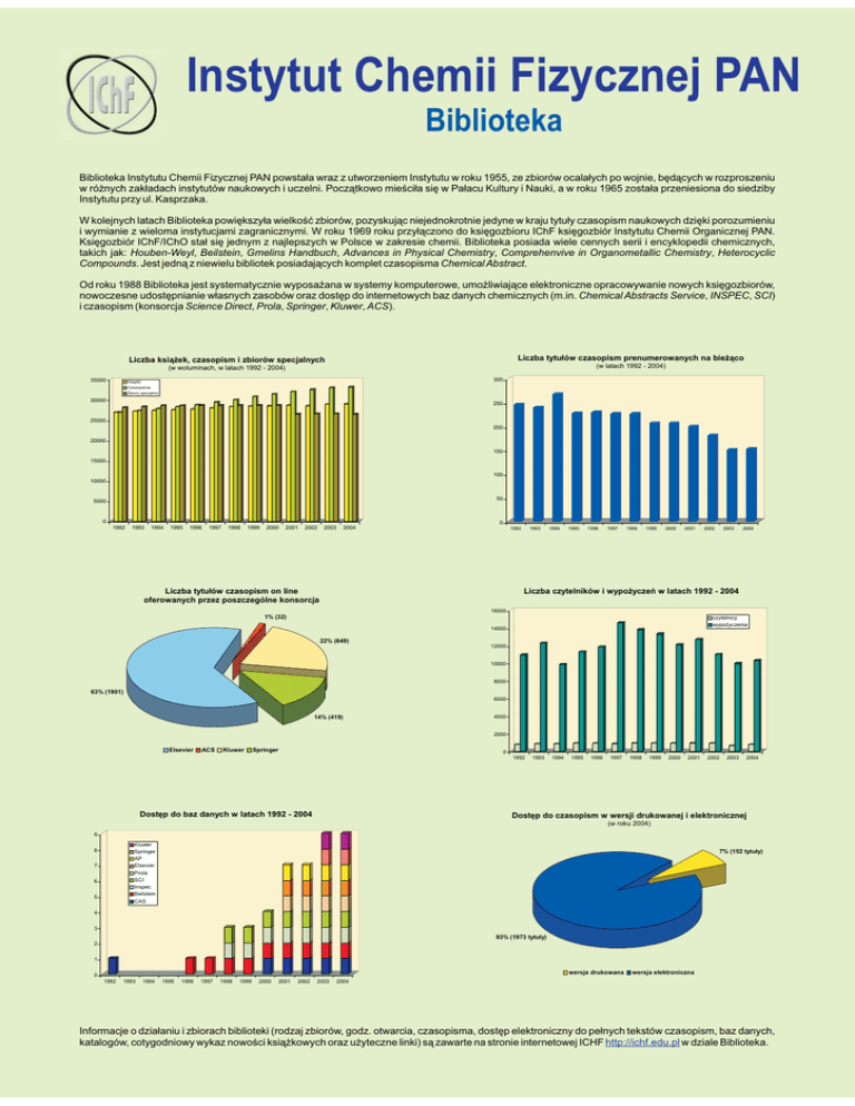 Instytut Chemii Fizycznej PAN Biblioteka Biblioteka Instytutu Chemii Fizycznej PAN powsta³a wraz z utworzeniem Instytutu w roku 1955, ze zbiorów ocala³ych po wojnie, bêd¹cych w rozproszeniu w ró¿nych zak³adach instytutów naukowych i uczelni. Pocz¹tkowo mieœci³a siê w Pa³acu Kultury i Nauki, a w roku 1965 zosta³a przeniesiona do siedziby Instytutu przy ul. Kasprzaka. W kolejnych latach Biblioteka powiêkszy³a wielkoœæ zbiorów, pozyskuj¹c niejednokrotnie jedyne w kraju tytu³y czasopism naukowych dziêki porozumieniu i wymianie z wieloma instytucjami zagranicznymi. W roku 1969 roku przy³¹czono do ksiêgozbioru IChF ksiêgozbiór Instytutu Chemii Organicznej PAN. Ksiêgozbiór IChF/IChO sta³ siê jednym z najlepszych w Polsce w zakresie chemii. Biblioteka posiada wiele cennych serii i encyklopedii chemicznych, takich jak: Houben-Weyl, Beilstein, Gmelins Handbuch, Advances in Physical Chemistry, Comprehenvive in Organometallic Chemistry, Heterocyclic Compounds. Jest jedn¹ z niewielu bibliotek posiadaj¹cych komplet czasopisma Chemical Abstract. Od roku 1988 Biblioteka jest systematycznie wyposa¿ana w systemy komputerowe, umo¿liwiaj¹ce elektroniczne opracowywanie nowych ksiêgozbiorów, nowoczesne udostêpnianie w³asnych zasobów oraz dostêp do internetowych baz danych chemicznych (m.in. Chemical Abstracts Service, INSPEC, SCI) i czasopism (konsorcja Science Direct, Prola, Springer, Kluwer, ACS). Liczba tytu³ów czasopism prenumerowanych na bie¿¹co Liczba ksi¹¿ek, czasopism i zbiorów specjalnych (w latach 1992 - 2004) (w woluminach, w latach 1992 - 2004) 35000 300 Ksi¹¿ki Czasopisma Zbiory specjalne 30000 250 25000 200 20000 150 15000 100 10000 50 5000 0 0 1992 1993 1994 1995 1996 1997 1998 1999 2000 2001 2002 2003 2004 1992 Liczba tytu³ów czasopism on line oferowanych przez poszczególne konsorcja 1993 1994 1995 1996 1997 1998 1999 2000 2001 2002 2003 2004 Liczba czytelników i wypo¿yczeñ w latach 1992 - 2004 16000 1% (32) czytelnicy wypo¿yczenia 14000 22% (649) 12000 10000 8000 63% (1901) 6000 14% (419) 4000 2000 Elsevier ACS Kluwer Springer 0 1992 Dostêp do baz danych w latach 1992 - 2004 1993 1994 1995 1996 1997 1998 1999 2000 2001 2002 2003 2004 Dostêp do czasopism w wersji drukowanej i elektronicznej (w roku 2004) 9 Kluwer Springer AP Elsevier Prola SCI Inspec Beilstein CAS 8 7 6 5 7% (152 tytu³y) 4 3 93% (1973 tytu³y) 2 1 wersja drukowana 0 1992 1993 1994 1995 1996 1997 1998 1999 2000 2001 2002 2003 wersja elektroniczna 2004 Informacje o dzia³aniu i zbiorach biblioteki (rodzaj zbiorów, godz. otwarcia, czasopisma, dostêp elektroniczny do pe³nych tekstów czasopism, baz danych, katalogów, cotygodniowy wykaz nowoœci ksi¹¿kowych oraz u¿yteczne linki) s¹ zawarte na stronie internetowej ICHF http://ichf.edu.pl w dziale Biblioteka.
