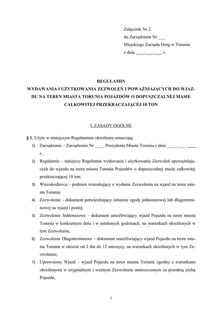 Załącznik Nr 2 do Zarządzenia Nr ___ Miejskiego Zarządu Dróg w Toruniu z dnia ____.____.____ r. REGULAMIN WYDAWANIA I UŻYTKOWANIA ZEZWOLEŃ UPOWAŻNIAJĄCYCH DO WJAZDU NA TEREN MIASTA TORUNIA POJAZDÓW O DOPUSZCZALNEJ MASIE CAŁKOWITEJ PRZEKRACZAJĄCEJ 18 TON I. ZASADY OGÓLNE § 1. Użyte w niniejszym Regulaminie określenia oznaczają: 1) Zarządzenie – Zarządzenie Nr ____ Prezydenta Miasta Torunia z dnia ____.____. ____ r., 2) Regulamin – niniejszy Regulamin wydawania i użytkowania Zezwoleń upoważniających do wjazdu na teren miasta Torunia Pojazdów o dopuszczalnej masie całkowitej przekraczającej 18 ton; 3) Wnioskodawca – podmiot wnioskujący o wydanie Zezwolenia na wjazd na teren miasta Torunia; 4) Zezwolenie – dokument potwierdzający istnienie zgody jednorazowej lub długoterminowej na wjazd i postój; 5) Zezwolenie Jednorazowe – dokument umożliwiający wjazd Pojazdu na teren miasta Torunia w konkretnym dniu i w ustalonych godzinach, na warunkach określonych w tym Zezwoleniu; 6) Zezwolenie Długoterminowe – dokument umożliwiający wjazd Pojazdu na teren miasta Torunia w okresie od 2 dni do 12 miesięcy, na warunkach określonych w tym Zezwoleniu; 7) Uprawniony Wjazd – wjazd Pojazdu na teren miasta Torunia zgodny z warunkami określonymi w oryginalnym i ważnym Zezwoleniu umieszczonym za przednią szybą Pojazdu, 1 8) Nieuprawniony Wjazd – wjazd Pojazdu na teren miasta Torunia: − bez ważnego Zezwolenia; − niezgodny z warunkami określonymi w Zezwoleniu; − z Zezwoleniem umieszczonym w sposób uniemożliwiający odczytanie wszystkich danych na nim zawartych. 9) „Pojazd” – pojazd samochodowy w rozumieniu art. 2. ustawy z dnia 20 czerwca 1997 r. Prawo o ruchu drogowym (Dz.U. z 2005 r. Nr 108 poz. 908 z późn.), którego dopuszczalna masa całkowita przekracza 18 ton; 10) „Posiadacz Zezwolenia” – podmiot, któremu zostało wydane Zezwolenie; 11) „Organ” – Prezydent Miasta Torunia lub upoważniona przez niego do wydawania Ze- zwoleń jednostka organizacyjna. § 2. 1. Wjazd Pojazdu na teren miasta Torunia, na którym obowiązuje zakaz, o którym mowa w § 1 ust. 1 Zarządzenia, możliwy jest na podstawie Zezwolenia. 2. Wjazd na teren miasta Torunia bez Zezwolenia, o którym mowa w ust. 1 dopuszcza się dla pojazdów wymienionych w § 1 ust. 2 Zarządzenia. § 3. 1. Zezwolenia w imieniu Organu wydaje Dyrektor Miejskiego Zarządu Dróg w Toruniu. 2. Wzór Zezwolenia, o którym mowa w ust. 1 stanowi załącznik nr 2 do Regulaminu. 3. Miejski Zarząd Dróg w Toruniu wydaje Zezwolenia w terminie do 14 dni roboczych licząc od daty złożenia odpowiednio uzasadnionego i udokumentowanego wniosku. 4. Zezwolenie należy odebrać w miejscu złożenia wniosku. Na prośbę Wnioskodawcy, zawartą we wniosku, Zezwolenie może być przesłane listem poleconym. 5. Osoba odbierająca Zezwolenie zobowiązana jest okazać imienne upoważnienie oraz dokument potwierdzający tożsamość. Ich brak skutkować będzie nie wydaniem Zezwolenia. § 4. 1. Zezwolenie ma zastosowanie jedynie w przypadku, kiedy pod znakiem zakazu znajduje się tabliczka o treści: „Nie dotyczy pojazdów z zezwoleniem MZD.” 2. Zezwolenie nie uprawnia do wjazdu w strefę ograniczeń lokalnych. 3. Zezwolenie upoważnia do wjazdu tylko jednego Pojazdu na teren miasta Torunia, na warunkach określonych w tym Zezwoleniu. 4. Niestosowanie się do warunków określonych w Zezwoleniu zostanie uznane za Nieuprawniony Wjazd. 5. Zezwolenie należy umieścić za przednią szybą Pojazdu w jej lewym dolnym rogu, w taki sposób, aby możliwe było odczytanie wszystkich danych na nim zawartych. 2 § 5. Zezwolenie nie zwalnia z obowiązku stosowania się do przepisów Ustawy Prawo o Ruchu Drogowym oraz do obowiązującej na terenie miasta Torunia organizacji ruchu, poza uprawnieniami wynikającymi z wydanego Zezwolenia. II. ZASADY WYDAWANIA I UŻYTKOWANIA ZEZWOLEŃ § 6. 1. Zezwolenia wydawane są na podstawie wniosku złożonego w siedzibie Miejskiego Zarządu Dróg przy ul. Grudziądzkiej 159 w Toruniu od poniedziałku do piątku w godzinach od 700 do 1500. 2. Wzór wniosku, o którym mowa w ust. 1 stanowi załącznik nr 1 do Regulaminu. 3. Do wniosku o wydanie Zezwolenia należy załączyć: a) ksero dowodu rejestracyjnego Pojazdu, b) dokument potwierdzający prawo do dysponowania Pojazdem (np. umowa użyczenia, umowa leasingu, umowa podwykonawstwa itp.), c) dokument uzasadniający potrzebę i celowość wjazdu na teren miasta Torunia (wpis do ewidencji działalności gospodarczej lub odpis z KRS, umowa lub zlecenie na wykonanie określonych robót lub usług itp.). 4. Wnioskodawca jest obowiązany okazać uprzednio wydane mu i nadal obowiązujące Zezwolenia długoterminowe. § 7. 1. Zezwolenie wydaje się na konkretny Pojazd identyfikowany na podstawie jego marki i numeru rejestracyjnego. 2. Zezwolenie może być wydane bez wskazania danych Pojazdu („na okaziciela”) w przypadku, gdy: – wnioskodawca udokumentuje, że posiada więcej niż 30 Pojazdów, – wnioskodawca nie posiada własnego transportu i korzysta z usług przewoźników zewnętrznych. 3. Organ wydaje Zezwolenia w celu: a) nieprzerwanego funkcjonowania: – instytucji zajmujących się ratowaniem życia i zdrowia ludzkiego, a w szczególności jednostek ratowniczych, szpitali, przychodni i schronisk, – służb odpowiedzialnych za bezpieczeństwo państwa i funkcjonowanie jednostek administracji państwowej, – b) instytucji i podmiotów świadczących usługi komunalne. zapewnienia: 3 c) – dostaw prasy codziennej do instytucji zajmujących się jej kolportażem, – dostaw artykułów spożywczych, – dostaw paliw i gazów, wykonywania robót inwestycyjnych, prowadzonych na terenie miasta Torunia, przez co rozumie się transport materiałów takich jak np. beton, piasek, żwir, kruszywa, d) realizacji inwestycji infrastrukturalnych na terenie Torunia (budowa i remonty dróg, mostów, linii kolejowych, lotniska,