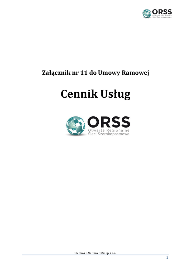 Załącznik nr 11 do Umowy Ramowej Cennik Usług UMOWA RAMOWA ORSS Sp. z o.o. 1 Opłaty i warunki wspólne dla wszystkich usług: 1. 2. Opłaty za Nadzór OI: OPŁATA LP. NAZWA JEDNOSTKA 1. Nadzór OI (ryczałt : dojazd oraz 1,5h nadzoru OI) Opłata jednorazowa 500 2. Nadzór OI za każdą następną godzinę nadzoru PLN/osoba/godzina 100 [PLN] Opusty uzależnione od okresu na jaki zostaje zawarta Umowa Szczegółowa: 3. LP. TERMIN OBOWIĄZYWANIA UMOWY OPUST DO OPŁATY ABONAMENTOWEJ 1. Umowa na czas oznaczony do 23 miesięcy Brak opustu 2. Umowa na czas oznaczony 24 – 35 miesięcy -10% 3. Umowa na czas oznaczony 36 – 59 miesięcy -15% 4. Umowa na czas oznaczony minimum 60 -25% Opłaty związane z zakresem dostarczeniem Usługi w różnych wariantach SLA: LP. POZIOM SLA WSPÓŁCZYNNIK KORYGUJĄCY 1 SLA Standard 12h) Brak dopłaty 2. SLA Silver (10h) Dopłata 20% 3. SLA Gold (8h) Dopłata 30% 4. SLA Platinium (6h) Dopłata 50% 4. 5. 6. 7. Kara za nawiązanie do sieci SSPW bez nadzoru służb technicznych OI wynosi 5000 PLN Wszystkie opłaty w niniejszym cenniku wyrażone są kwotami netto. Opusty nie są naliczane w stosunku do opłat jednorazowych oraz cennika Usług Kolokacyjnych. OI dopuszcza możliwość świadczenia usług „niestandardowych”, które nie są objęte niniejszym cennikiem z zastrzeżeniem iż nie będą to spakietyzowane usługi występujące w niniejszym cenniku jako standardowe. Cena takich usług będzie ustalana w procesie negocjacji pomiędzy OI oraz OSD zainteresowanym tymi usługami. Po ustaleniu warunków w toku negocjacji, OI włączy do cennika usługę której dotyczyły negocjacje wraz z ceną która w ramach tych negocjacji została ustalona. 8. Wyrażone w procentach opusty uzależnione od okresu na jaki zostaje zawarta Umowa Szczegółowa oraz dopłaty wynikającej z poziomu SLA zapisanego w Umowie Szczegółowej są sumowane. UMOWA RAMOWA ORSS Sp. z o.o. 2 Dzierżawa Ciemnych Włókien: 1. Dzierżawa Ciemnych Włókien: UMOWA TERMINOWA DO 23 MIESIĘCY – SLA STANDARD TYP RELACJI OPŁATA ABONAMENTOWA ZA1 KM/MIESIĄC [PLN] 1J Relacja Szkieletowa 100,00 2J Relacja Szkieletowa 120,00 1J Relacja Dystrybucyjna 80,00 2J Relacja Dystrybucyjna 100,00 Relacja Szkieletowa - odnosi się do Usługi Dzierżawy Ciemnych Włókien Światłowodowych i dotyczy dzierżawy włókna światłowodowego (1J) lub pary włókien światłowodowych (2J) na odcinku sieci łączącym najkrótszą drogą dwa sąsiadujące Węzły Szkieletowe. Relacja Dystrybucyjna - odnosi się do Usługi Dzierżawy Ciemnych Włókien Światłowodowych i dotyczy dzierżawy włókna światłowodowego (1J) lub pary włókien światłowodowych (2J) przy czym żaden z punktów tej relacji nie może leżeć na odcinku sieci łączącym najkrótszą drogą dwa sąsiadujące Węzły Szkieletowe. Jeśli dzierżawiona relacja przebiega przez obszary różnych kategorii co uniemożliwia jej wycenę jako całości, musi zostać podzielona na relacje jednorodne zgodnie z powyższym podziałem, a opłata abonamentowa zostanie wyznaczona jako suma opłat za poszczególne relacje. 2. Usługa Telekomunikacyjny Kabel Pośredniczący – w ramach niniejszej Usługi OI umożliwi OSD wykonywanie połączeń optycznych z innymi OSD dostępnymi w studni OI . Koszt Uługi określa poniższa tabela. UMOWA RAMOWA ORSS Sp. z o.o. 3 LP. 3. 4. 5. 6. 7. Opłata [PLN] OPCJA 1 Opłata abonamentowa za wykonanie połączenia z innym OSD w studni należącej OI 300 2 Kara za wykonanie połączenia z innym OSD, bez wiedzy OI 7000 Opusty uzależnione od wielkości wolumenowej dzierżawy: LP. SUMARYCZNY WOLUMEN DZIERŻAWY OPUST DO OPŁATY ABONAMENTOWEJ 1. Poniżej 50km Brak opustu 2. 50km - 149,99km -10% 3. 150km - 249,99km -15% 4. 250 km i więcej -25% Opusty naliczane są na podstawie sumarycznego wolumenu dzierżawy wynikającego ze wszystkich umów zawartych pomiędzy OI i OSD. Współczynnik rabatowy aktualizowany na każdy okres rozliczeniowy. Na sumę relacji w danym okresie rozliczeniowym składają się te relacje które na podstawie umowy pomiędzy IO oraz OSD dzierżawione są przez pełny okres rozliczeniowy. Opusty uzależnione od wielkości wolumenowej dzierżawy nie są naliczane w stosunku do opłat jednorazowych. Opusty uzależnione od wielkości wolumenowej dzierżawy włókien naliczane są od kwoty powstałej po uwzględnieniu opustu uzależnione od okresu na jaki zostaje zawarta Umowa Szczegółowa oraz dopłaty wynikającej z poziomu SLA zapisanego w Umowie Szczegółowej. Opłata jednorazowa pobierana jest z tytułu każdego punktu odbioru usługi i wynosi 500zł za punkt odbioru. Opłata jednorazowa może zostać rozszerzona o koszty OI według kosztorysu związane z: a) wystawieniem usługi poza istniejącymi węzłami SSPW, co wymaga: dobudowania nowego zasobnika kablowego bądź studni kablowej; dobudowania nowej studni kablowej; dobudowania nowej mufy kablowej; wspawania przyłącza OSD do istniejącej mufy kablowej; Nowo wybudowane zasoby przechodzą na rzecz ORSS i podlegają ogólnym zasadom dostępu określonym w Umowie Ramowej. UMOWA RAMOWA ORSS Sp. z o.o. 4 Dzierżawa Kanalizacji Kablowej: 1. Opłaty związane z Dzierżawą Kanalizacji Kablowej: OPŁATA ABONAMENTOWA ZA 1KM/MIESIĄC RODZAJ KANALIZACJI [PLN] 1300 Rura RHDPE 40mm na sieci dystrybucyjnej (*) Miejsce w rurze RHDPE 40mm na mikrokanalizację do 8-12mm na sieci dystrybucyjnej Rura RHDPE 40mm na sieci szkieletowej (*) Miejsce w rurze RHDPE 40mm na mikrokanalizację do 8-12mm na sieci szkieletowej Instalacja mufy lub zapasu do 30mb w studni/zasobniku OI Rezerwacja zasobów na okres do 60 dni roboczych 2. 900 2200 1200 300PLN /szt. 600PLN/relacja w ramach danej gałęzi funkcjonalnej węzeł szkieletowy – węzeł dystrybucyjny Opłata jednorazowa pobierana jest z tytułu każdego punktu odbioru usługi i wynosi 500zł za punkt odbioru. Opłata jednorazowa może zostać rozszerzona o koszty OI według kosztorysu związane z: a) wystawienie