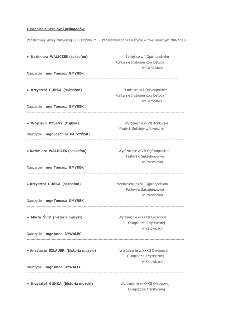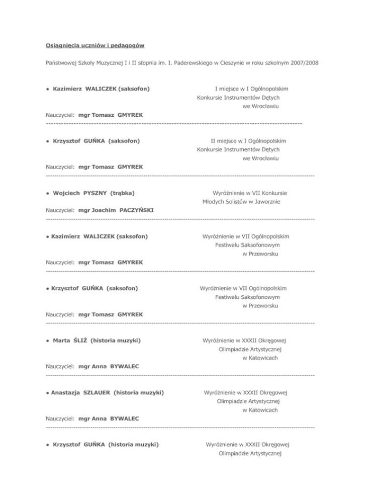 Osiągnięcia uczniów i pedagogów Państwowej Szkoły Muzycznej I i II stopnia im. I. Paderewskiego w Cieszynie w roku szkolnym 2007/2008 ● Kazimierz WALICZEK (saksofon) I miejsce w I Ogólnopolskim Konkursie Instrumentów Dętych we Wrocławiu Nauczyciel: mgr Tomasz GMYREK -----------------------------------------------------------------------------------------------------● Krzysztof GUŃKA (saksofon) II miejsce w I Ogólnopolskim Konkursie Instrumentów Dętych we Wrocławiu Nauczyciel: mgr Tomasz GMYREK ------------------------------------------------------------------------------------------------------------------------------● Wojciech PYSZNY (trąbka) Wyróżnienie w VII Konkursie Młodych Solistów w Jaworznie Nauczyciel: mgr Joachim PACZYŃSKI ------------------------------------------------------------------------------------------------------------------------------● Kazimierz WALICZEK (saksofon) Wyróżnienie w VII Ogólnopolskim Festiwalu Saksofonowym w Przeworsku Nauczyciel: mgr Tomasz GMYREK ------------------------------------------------------------------------------------------------------------------------------● Krzysztof GUŃKA (saksofon) Wyróżnienie w VII Ogólnopolskim Festiwalu Saksofonowym w Przeworsku Nauczyciel: mgr Tomasz GMYREK ------------------------------------------------------------------------------------------------------------------------------● Marta ŚLIŻ (historia muzyki) Wyróżnienie w XXXII Okręgowej Olimpiadzie Artystycznej w Katowicach Nauczyciel: mgr Anna BYWALEC ------------------------------------------------------------------------------------------------------------------------------● Anastazja SZLAUER (historia muzyki) Wyróżnienie w XXXII Okręgowej Olimpiadzie Artystycznej w Katowicach Nauczyciel: mgr Anna BYWALEC ------------------------------------------------------------------------------------------------------------------------------● Krzysztof GUŃKA (historia muzyki) Wyróżnienie w XXXII Okręgowej Olimpiadzie Artystycznej w Katowicach Nauczyciel: mgr Anna BYWALEC ------------------------------------------------------------------------------------------------------------------------------● Agnieszka BIAŁEK (kształcenie słuchu) I miejsce w Olimpiadzie Słuchowej we Wrocławiu Nauczyciel: mgr Witold RASZKA ------------------------------------------------------------------------------------------------------------------------------● Szymon STANIEK (gitara) Wyróżnienie w X Dolnośląskim Konkursie Gitarowym w Kłodzku Nauczyciel: Małgorzata GROBORZ -------------------------------------------------------------------------------------------------------------------------------● Wojciech PAWLUS (organy) IV miejsce w Ogólnopolskich Przesłuchaniach Uczniów Klas Organów we Wrocławiu Nauczyciel: dr Tomasz ORLOW -------------------------------------------------------------------------------------------------------------------------------● Marta ŚLIŻ (historia muzyki) Wyróżnienie w XXXII Ogólnopolskiej Olimpiadzie Artystycznej w Warszawie Nauczyciel: mgr Anna BYWALEC – FOJCIK -------------------------------------------------------------------------------------------------------------------------------● Marta RABIĘCNY (flet) I miejsce oraz Nagrodę dla najmłodszego Uczestnika w XVII Konfrontacjach Instrumentów Dętych w Oławie Nauczyciel: mgr Teresa ZIĘBA - JANASIK ---------------------------------------------------------------------------------------------------------------------------------● Maria RASZKA (flet) III miejsce w XVII Konfrontacjach Instrumentów Dętych w Oławie Nauczyciel: mgr Teresa ZIĘBA – JANASIK ---------------------------------------------------------------------------------------------------------------------------------● mgr Teresa ZIĘBA – JANASIK Dyplom uznania za wyróżniające osiągnięcia pedagogiczne w XVII Konfrontacjach Instrumentów Dętych w Oławie ---------------------------------------------------------------------------------------------------------------------------------● Daniel GLAJC (fortepian) Wyróżnienie w II Chrzanowskich Spotkaniach Młodych Instrumentalistów W Chrzanowie Nauczyciel: mgr Joanna LIPOWCZAN – STAWARZ ---------------------------------------------------------------------------------------------------------------------------------- ● Wojciech PYSZNY (trąbka) II miejsce w VII Międzynarodowym Festiwalu Instrumentów Dętych Blaszanych w Mielcu Nauczyciel: mgr Joachim PACZYŃSKI ---------------------------------------------------------------------------------------------------------------------------------● Justyna PYSZNY (puzon) III miejsce w VII Międzynarodowym Festiwalu Instrumentów Dętych Blaszanych w Mielcu Nauczyciel: mgr Andrzej PIEKORZ ---------------------------------------------------------------------------------------------------------------------------------● Kamil SZOPA (puzon) III miejsce w VII Międzynarodowym Festiwalu Instrumentów Dętych Blaszanych w Mielcu Nauczyciel: mgr Andrzej PIEKORZ ---------------------------------------------------------------------------------------------------------------------------------● mgr Andrzej PIEKORZ Wyróżnienie dla nauczyciela w VII międzynarodowym Festiwalu Instrumentów Dętych Blaszanych w Mielcu --------------------------------------------------------------------------------------------------------------------------------● mgr Małgorzata PRZYBYŁA Wyróżnienie dla akompaniatora w VII Międzynarodowym Festiwalu Instrumentów Dętych Blaszanych w Mielcu --------------------------------------------------------------------------------------------------------------------------------● Wiktor ŚWIERCZEK (fortepian) Wyróżnienie w III Ogólnopolskim Konkursie Młodych Instrumentalistów w Jaśle Nauczyciel: mgr Danuta GOCIEK -----------------------------------------------------------------------------------------------------------------------