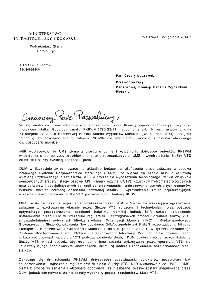 MINISTERSTWO INFRASTRUKTURY I ROZWOJU Warszawa, 29 grudnia 2014 r. Podsekretarz Stanu Dorota Pyć DTM1sk-076-31/14 NK:349365/IA Pan Cezary Łuczywek Przewodniczący Państwowej Komisji Badania Wypadków Morskich W odpowiedzi na pismo informujące o sporządzeniu przez Komisję raportu końcowego z wypadku morskiego statku Godafoss (znak: PKBWM-0780-22/14), zgodnie z art. 44 ust. ustawy z dnia 31 sierpnia 2012 r. o Państwowej Komisji Badani Wypadków Morskich (Dz. U. poz. 1068) uprzejmie informuję, że dokonano analizy zaleceń PKBWM dla administracji morskiej i ministra właściwego ds. gospodarki morskiej. MliR wystosowało do UMS pismo z prośbą o opinię i wyjaśnienia dotyczące wniosków PKBWM w odniesieniu do potrzeby zrewidowanie struktury organizacyjnej UMS i wyodrębnienia Służby VTS ze struktur służby dyżurnej kapitanatu portu. DUM w Szczecinie zwrócił uwagę na aktualnie będące na ukończeniu prace związane z budową Krajowego Systemu Bezpieczeństwa Morskiego (KSBM), co wiązać się będzie m.in. z całkowitą wymianą użytkowanego przez Służbę VTS w Szczecinie wyposażenia technicznego, w tym czujników sensorycznych (radary, stacje bazowe AIS, kamery wizyjne CCTV), czujników hydrometeorologicznych oraz serwerów i specjalistycznych aplikacji do przetwarzania i zobrazowania danych z tych sensorów. Wskazał również potrzebę dokonania powtórnej analizy i wprowadzenia zmian organizacyjnych w zakresie funkcjonowania Służby VTS po zakończeniu budowy KSBM. MliR uznało za zasadne wyjaśnienia przekazane przez DUM w Szczecinie wskazujące ograniczenia związane z użytkowanym obecnie przez Służbę VTS sprzętem i technologiami oraz potrzebą optymalnego gospodarowania zasobami ludzkimi, niemniej jednak MliR uznaje konieczność ustanowienia przez DUM w Szczecinie regulaminu i szczegółowych procedur działania Służby VTS, z uwzględnieniem wytycznych Międzynarodowej Organizacji Morskiej (IMO) i Międzynarodowego Stowarzyszenia Służb Oznakowania Nawigacyjnego (IALA), zgodnie z § 6 pkt 3 rozporządzenia Ministra Transportu, Budownictwa i Gospodarki Morskiej z dnia 4 grudnia 2012 r. w sprawie Narodowego Systemu Monitorowania Ruchu Statków i Przekazywania Informacji. Ww. regulamin powinien jasno wskazywać obowiązki operatora VTS podczas pełnienia służby. DUM powinien zorganizować działanie Służby VTS w taki sposób, aby ewentualne inne zadania wykonywane przez operatora VTS nie kolidowały z jego podstawowymi obowiązkami, jakimi są nadzór i zapewnienie bezpieczeństwa ruchu statków. Odnosząc się do zalecenia PKBWM dotyczącego zobowiązania dyrektorów pozostałych UM do opracowania i ogłoszenia regulaminów działania Służby VTS, MliR wystosowało do UMG i UMSI pisma z prośbą wyjaśnienia i otrzymało odpowiedź, że niezbędne kwestie zostały uregulowane przez DUM, jednak odnotowano, że nie zostały wydane w postaci regulaminów Służb VTS. Odnosząc się do wskazywanej przez PKBWM potrzeby określenia procedur postępowania operatorów Służby VTS, to procedury takie dla wszystkich UM zostały określone w systemach zarządzania jakością urzędów morskich. Szczegółowe instrukcje dotyczące realizacji procesu nadzoru nad bezpieczeństwem ruchu statków określają krok po kroku procedurę i sposób postępowania operatorów VTS zarówno w sytuacjach rutynowych, jak reagowania w sytuacjach zagrożeń. Należy jednak zaznaczyć, że zakończenie budowy KSBM wiązać się będzie z ujednoliceniem stosowanego na polskim wybrzeżu wyposażenia technicznego, jak również z wdrożeniem stosowania przez wszystkie UM jednej aplikacji służącej realizacji zadań związanych z zapewnieniem bezpieczeństwa ruchu morskiego. W związku z powyższym podczas Rady Koordynacyjnej DUM i SAR w dniu 3 grudnia 2014 podjęto decyzję o powołaniu Zespołu ds. opracowania ujednoliconych procedur działania Służby VTS, który podejmie prace mające na celu opracowanie, jednolitych standardów oraz procedur działania Operatorów VTS uwzględniając najlepsze praktyki oraz możliwości nowo wdrożonego systemu KSBM. Zespół ten zajmie się również opracowaniem jednolitych założeń dla regulaminów Służb VTS. Odnosząc się do zalecenia PKBWM dotyczącego wprowadzenia okresowych szkoleń pilotów morskich z zakresu przepisów dotyczących łączności radiotelefonicznej oraz stosowanych procedur w opinii MiiR nie wydaje się konieczne wprowadzanie dodatkowych wymagań szkoleniowych w tym zakresie. PKBWM w swoim raporcie wskazuje, że przyczyną zdarzenia była głównie błędna komunikacja pomiędzy pilotem a Służbą VTS, a nie brak znajomości przepisów i procedur stosowanych w łączności. Zaznaczyć należy, że analiza pojedynczego zdarzenia nie powinna mieć wpływu na ocenę prawidłowego lub błędnego funkcjonowania stacji pilotowych oraz pracy pozostałych pilotów morskich. Obecnie zgodnie z § 9 ust. 2 pkt 3 rozporządzenia Ministra Transportu Budownictwa i Gospodarki Morskiej z dnia 26 listopada 2013 r. w sprawie wymagań kwalifikacyjnych pilotów morskich w celu odnowienia dyplomu pilota morskiego (ważność dyplomu 5 lat) konieczne jest zdanie egzaminu na odnowienie dyplomu pilota morskiego. Na podstawie wymagań egzaminacyjnych do odnowienia dyplomu pilota morskiego oraz treści programowych w zakresie programu szkolenia na symulatorze określonych w rozporządzeniu Ministra Transportu Budownictwa i Gospodarki Morskiej z dnia 26 listopada 2013 r. w sprawie programów szkoleń i wymagań egzaminacyjnych dla pilotów morskich, pilot morski odnawiający dyplom musi zaliczyć kurs na symulatorze obejmujący zagadnienia procedur awaryjnych w pilotażu oraz współpracy pilota z kapitanem i obsadą mostka. Zgodnie z programem szkolenia w zakresie procedur awaryjnych w pilotażu oraz współpracy pilota z kapitanem i obsadą mostka osoba kończąca taki kurs powinna wykazać się umiejętnościami w zakresie: bezpieczne