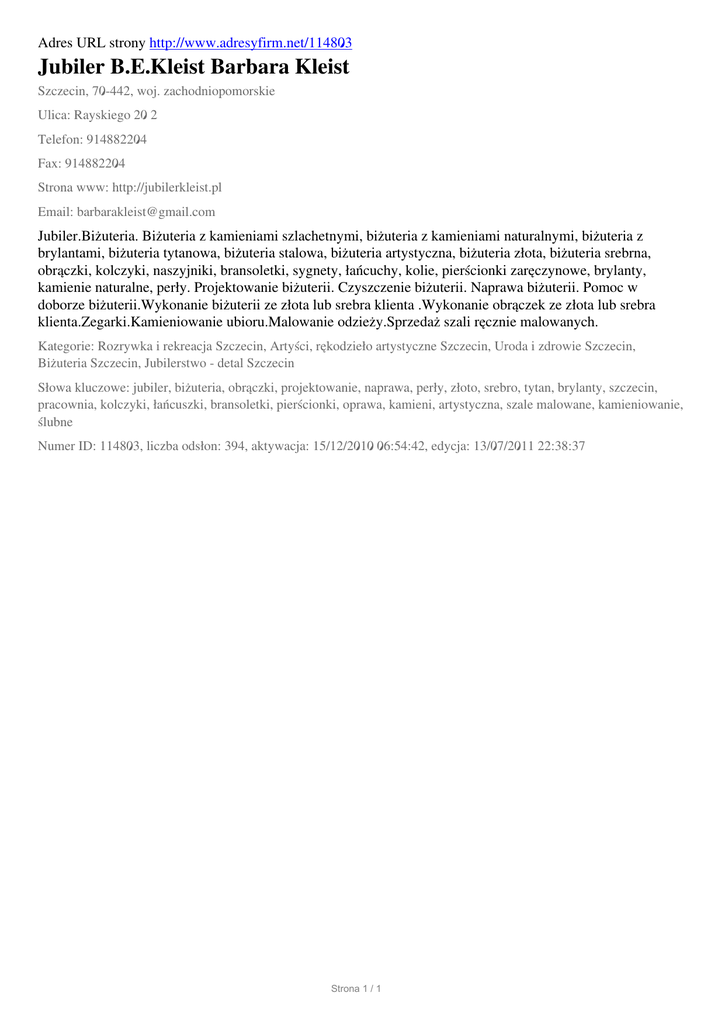 Jubiler BEKleist Barbara Kleist, Szczecin, Rayskiego 20 2