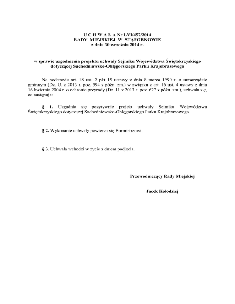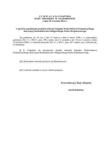 U C H W A Ł A Nr LVI/457/2014 RADY MIEJSKIEJ W STĄPORKOWIE z dnia 30 września 2014 r. w sprawie uzgodnienia projektu uchwały Sejmiku Województwa Świętokrzyskiego dotyczącej Suchedniowsko-Oblęgorskiego Parku Krajobrazowego Na podstawie art. 18 ust. 2 pkt 15 ustawy z dnia 8 marca 1990 r. o samorządzie gminnym (Dz. U. z 2013 r. poz. 594 z późn. zm.) w związku z art. 16 ust. 4 ustawy z dnia 16 kwietnia 2004 r. o ochronie przyrody (Dz. U. z 2013 r. poz. 627 z późn. zm.), uchwala się, co następuje: § 1. Uzgadnia się pozytywnie projekt uchwały Sejmiku Województwa Świętokrzyskiego dotyczącej Suchedniowsko-Oblęgorskiego Parku Krajobrazowego. § 2. Wykonanie uchwały powierza się Burmistrzowi. § 3. Uchwała wchodzi w życie z dniem podjęcia. Przewodniczący Rady Miejskiej Jacek Kołodziej Uzasadnienie Suchedniowsko - Oblęgorski Park Krajobrazowy został utworzony Rozporządzeniem Nr 71/2005 Wojewody Świętokrzyskiego z dnia 14 lipca 2005 r., zmienionym Rozporządzeniem Nr 1/2009 Wojewody Świętokrzyskiego z dnia 28 stycznia 2009 r., ze względu na wartości przyrodnicze, historyczne i kulturowe oraz walory krajobrazowe w celu zachowania, popularyzacji tych wartości w warunkach zrównoważonego rozwoju. Zgodnie z art. 16 ust. 3 i 4 ustawy z dnia 16 kwietnia 2004 roku o ochronie przyrody (jednolity tekst Dz. U. z 2013 r. poz. 627, z późn. zm.) utworzenie parku krajobrazowego lub powiększenie jego obszaru, a także ustalenie zakazów obowiązujących na jego terenie następuje w drodze uchwały sejmiku województwa. Likwidacja lub zmniejszenie obszaru parku krajobrazowego następuje w drodze uchwały sejmiku województwa, po uzgodnieniu z właściwymi miejscowo radami gmin. Projekt uchwały sejmiku województwa w sprawie utworzenia, zmiany granic lub likwidacji parku krajobrazowego wymaga uzgodnienia z właściwymi miejscowo radami gmin oraz właściwym regionalnym dyrektorem ochrony środowiska. W związku z uchwałą nr 1/2012 podjętą przez Regionalną Radę Ochrony Przyrody w Kielcach, Regionalna Dyrekcja Ochrony Środowiska w Kielcach w dniu 25 września 2012 r. wystąpiła do Przewodniczącego Sejmiku Województwa Świętokrzyskiego z pismem proponującym dokonanie zmian zakazów na terenach parków krajobrazowych w województwie świętokrzyskim. Kwestie zakazów obowiązujących dotychczas na tym obszarze Parku regulowało w/w Rozporządzenie. Kierując się konstytucyjną zasadą proporcjonalności, zawartą w art. 31 ust. 3 Konstytucji Rzeczypospolitej Polskiej z dnia 2 kwietnia 1997 r., która w odniesieniu do formułowania zakazów, jakie mają obowiązywać na terenie parku krajobrazowego, wymaga, aby zakazy miały swoje merytoryczne umocowanie i wynikały z potrzeb ochronnych danego obszaru, wynikających z treści samej ustawy o ochronie przyrody, a także celów ochrony danego obszaru chronionego, zdecydowano się wprowadzić odstępstwa od dotychczas obowiązujących zakazów. W proponowanym projekcie uchwały § 6 ust. 2 stanowi o tym, iż zakazy z § 6 ust. 1 nie dotyczą: - terenów objętych ustaleniami studium uwarunkowań i kierunków zagospodarowania przestrzennego gmin oraz miejscowych planów zagospodarowania przestrzennego, dla których przeprowadzona ocena oddziaływania na środowisko wykazała brak znacząco negatywnego wpływu na ochronę przyrody parku krajobrazowego; - terenów objętych ustaleniami projektów planów zagospodarowania przestrzennego lub projektów studiów uwarunkowań i kierunków zagospodarowania przestrzennego, dla których przeprowadzona strategiczna ocena oddziaływania na środowisko wykazała brak znacząco negatywnego wpływu na ochronę przyrody parku krajobrazowego; - realizacji przedsięwzięć mogących znacząco oddziaływać na środowisko, dla których procedura dotycząca oceny oddziaływania na środowisko wykazała brak znacząco negatywnego wpływu na ochronę przyrody parku krajobrazowego. W ten sposób łagodzi się ograniczenia wynikające z dotychczasowej treści Rozporządzenia. Zaproponowana forma złagodzenia zakazów pozwala podmiotom gospodarczym oraz osobom fizycznym na realizację przedsięwzięć, pod warunkiem zapewnienia ochrony wartości przyrodniczych, historycznych i kulturowych oraz walorów krajobrazowych w celu zachowania, popularyzacji tych wartości w warunkach zrównoważonego rozwoju na obszarze parku krajobrazowego. Złagodzone w ten sposób zakazy pozwalają dostosować ograniczenia do lokalnych potrzeb i uwarunkowań występujących na danym obszarze. Umożliwia to prowadzenie właściwej polityki gospodarczej i społecznej zapewniającej zrównoważony rozwój województwa świętokrzyskiego. W uchwale uszczegółowiono przebieg granicy Parku w dotychczas obowiązujących granicach na podstawie baz danych, o których mowa w art. 4 ust. 1a i 1b ustawy z dnia 17 maja 1989 r. – Prawo geodezyjne i kartograficzne (Dz. U. z 2010 r. Nr 193, poz. 1287 z późn. zm.). Zgodnie z § 7 ust. 3 Rozporządzenia Ministra Rozwoju Regionalnego i Budownictwa (Dz. U. z 2001 r. Nr 38, poz. 454, z 2013 r. poz. 1551), na obszarach wiejskich obręb powinien obejmować obszar wsi oraz przyległe do tej jednostki osadniczej i z nią związane obiekty fizjograficzne. W szczególnych przypadkach odrębnym obrębem może być część obszaru wsi w granicach sołectwa lub obszar wyodrębnionej organizacyjnie części Państwowego Gospodarstwa Leśnego Lasy Państwowe. Ze względu na dostępność granic obrębów ewidencyjnych w postaci wektorowej, w opisie granic zastąpiono granice sołectw odpowiadającymi im granicami obrębów ewidencyjnych. W związku z powyższym uszczegółowieniem przebiegu granic oraz wyliczeniem powierzchni obszaru Parku i jego Otuliny w Systemie Informacji Geograficznej, zmieniła się powierzchnia Parku z 21 407 ha na 19 895 ha i Otuliny z 25 681 ha na 27 514 ha. Uznaje się więc za zasadne podjęcie niniejszej uchwały.