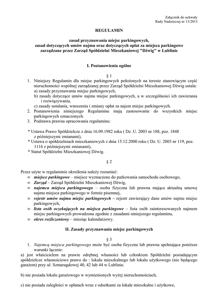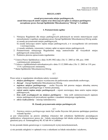 Załącznik do uchwały Rady Nadzorczej nr 13/2013 REGULAMIN zasad przyznawania miejsc parkingowych, zasad dotyczących umów najmu oraz dotyczących opłat za miejsca parkingowe zarządzane przez Zarząd Spółdzielni Mieszkaniowej "Dźwig" w Lublinie I. Postanowienia ogólne §1 1. Niniejszy Regulamin dla miejsc parkingowych położonych na terenie stanowiącym część nieruchomości wspólnej zarządzanej przez Zarząd Spółdzielni Mieszkaniowej Dźwig ustala: a) zasady przyznawania miejsc parkingowych, b) zasady dotyczące umów najmu miejsc parkingowych, a w szczególności ich zawierania i rozwiązywania, c) zasady ustalania, wnoszenia i zmiany opłat za najem miejsc parkingowych. 2. Postanowienia niniejszego Regulaminu mają zastosowanie do wszystkich miejsc parkingowych oznaczonych. 3. Podstawa prawna opracowania regulaminu: * Ustawa Prawo Spółdzielcze z dnia 16.09.1982 roku ( Dz. U. 2003 nr 188, poz. 1848 z późniejszymi zmianami), * Ustawa o spółdzielniach mieszkaniowych z dnia 15.12.2000 roku ( Dz. U. 2003 nr 119, poz. 1116 z późniejszymi zmianami), * Statut Spółdzielni Mieszkaniowej Dźwig. §2 Przez użyte w regulaminie określenia należy rozumieć: • miejsce parkingowe – miejsce wyznaczone do parkowania samochodu osobowego, • Zarząd – Zarząd Spółdzielni Mieszkaniowej Dźwig, • najemca miejsca parkingowego – osoba fizyczna lub prawna mająca aktualną umowę najmu miejsca parkingowego w formie pisemnej, • rejestr umów najmu miejsc parkingowych – rejestr zawierający dane umów najmu miejsc parkingowych, • lista osób oczekujących na miejsca parkingowe – lista osób zainteresowanych najmem miejsc parkingowych prowadzona zgodnie z zasadami niniejszego regulaminu, • okres rozliczeniowy – miesiąc kalendarzowy. II. Zasady przyznawania miejsc parkingowych §3 1. Najemcą miejsca parkingowego może być osoba fizyczna lub prawna spełniająca poniższe warunki łącznie: a) jest właścicielem na prawie odrębnej własności lub członkiem Spółdzielni posiadającym spółdzielcze własnościowe prawo do : lokalu mieszkalnego lub lokalu użytkowego (nie będącego garażem) przy ul. Szmaragdowej 40, 42 lub 44 w Lublinie. b) nie posiada lokalu garażowego w wymienionych wyżej nieruchomościach, c) nie posiada zaległości w opłatach wraz z odsetkami za lokale mieszkalne i użytkowe, 2. Na jeden lokal mieszkalny / użytkowy (nie będący garażem) Zarząd może wyznaczyć tylko jedno miejsce parkingowe. 3. Miejsce parkingowe może być przyznane tylko na samochód osobowy zarejestrowany na osobę, która może być najemcą zgodnie z § 3 pkt.1 lub na osobę zamieszkującą w lokalu najemcy i jednocześnie będącą małżonkiem najemcy lub osobą spokrewnioną z najemcą w linii prostej w stopniu pierwszym. 4. Osoby zainteresowane najmem miejsca parkingowego składają stosowne podanie do Zarządu. Osoby te zostaną wpisane przez Zarząd na „Listę osób oczekujących na najem miejsca parkingowego”, tylko i wyłącznie wtedy jeżeli spełniają pozostałe warunki § 3. 5. Gdy osobie wpisanej na „Listę osób oczekujących na najem miejsca parkingowego” nie przyznano na posiedzeniu Zarządu miejsca ze względu na nie spełnienie wymagań, kolejka na liście przepada, a ta osoba może ubiegać się o ponowne wpisanie na listę po spełnieniu warunków niniejszego regulaminu. III. Zasady dotyczące umów najmu miejsc postojowych §4 1. Umowy najmu miejsc parkingowych Zarząd spisuje na czas nieokreślony. 2. Umowa najmu może być rozwiązana w trybie natychmiastowym w przypadku nie zapłacenia opłat po dwukrotnym wezwaniu do zapłaty za najmowane miejsce parkingowe lub za lokal mieszkalny/użytkowy najemcy. 3. Umowa najmu może być rozwiązana przez obie strony z zachowaniem jednomiesięcznego wypowiedzenia na dzień kończący kolejny miesiąc kalendarzowy. 4. W przypadkach niespełnienia zapisów niniejszego regulaminu, a w szczególności zapisów § 7 , umowa może być rozwiązana ze skutkiem natychmiastowym. 5. Najemca przyjmuje, że nieodebranie rozwiązania/wypowiedzenia umowy najmu traktuje się jak dostarczone z dniem zwrotu listu poleconego. 6. W przypadku złożenia przez Najemcę oświadczenia o nie przyjęciu nowych warunków regulaminu, Umowa ulega rozwiązaniu w ostatnim dniu okresu rozliczeniowego, następującego po okresie rozliczeniowym, w którym Zarząd otrzymał w/w oświadczenie. IV. Zasady dotyczące opłat za miejsca parkingowe §5 1. Opłaty za najem miejsc parkingowych należy wnosić na podstawie umowy na podane przez Zarząd konto do 15-go dnia miesiąca kalendarzowego w formie przelewu z tytułem identyfikującym miejsce parkingowe oraz kwotę i okres opłaty. 2. Naliczenia opłat za miejsce parkingowe są wystawiane tylko dla osób prawnych będących najemcami. 3. Okresem rozliczeniowym dla wnoszenia opłat jest miesiąc kalendarzowy. 4. Za niepełny okres rozliczeniowy opłata wynosi za każdy dzień 1/30 opłaty za cały okres rozliczeniowy. 5. 6. 7. 8. Opłatę ustala Zarząd na zasadach rynkowych i akceptowana jest przez Radę Nadzorczą. Oplata może ulec zmianie tylko raz w roku. Ustalona opłata nie zawiera odśnieżania w okresie zimy. Opłata dodatkowa za odśnieżanie może być ustalona odrębnie przez Zarząd w razie potrzeby. V. Prawa i obowiązki Spółdzielni Mieszkaniowej Dźwig. §6 1. Zarząd prowadzi: a) Rejestr umów najmu miejsc parkingowych, b) Listę osób oczekujących na miejsce parkingowe. 2. Zarząd rozpatruje podania osób zainteresowanych najmem miejsc parkingowych na pierwszym posiedzeniu Zarządu po otrzymaniu stosownych danych księgowych lecz nie później niż 1 miesiąc od daty złożenia podania. 3. Zarząd dokonuje wpisu na „Listę osób oczekujących na najem miejsca parkingowego” po spełnieniu warunków niniejszego regulaminu, a w szczególności § 3. 4. Zarząd przydziela zwolnione miejsca parkingowe według kolejności listy osób oczekujących na mie