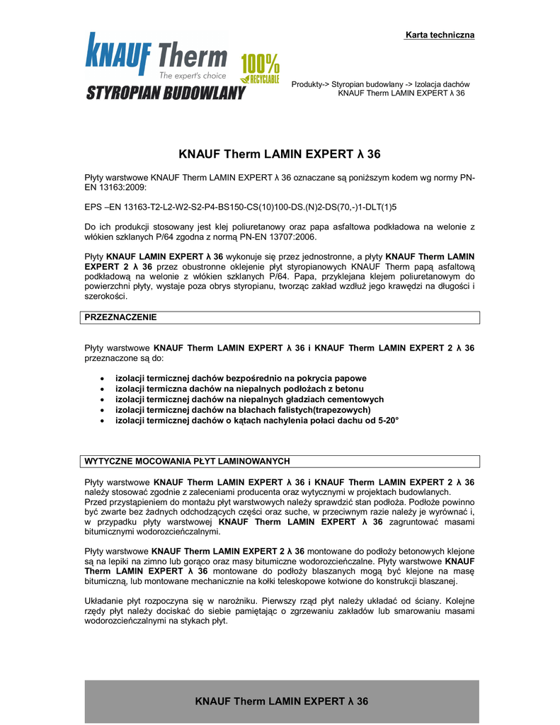 Karta techniczna Produkty-> Styropian budowlany -> Izolacja dachów KNAUF Therm LAMIN EXPERT λ 36 KNAUF Therm LAMIN EXPERT λ 36 Płyty warstwowe KNAUF Therm LAMIN EXPERT λ 36 oznaczane są poniższym kodem wg normy PNEN 13163:2009: EPS –EN 13163-T2-L2-W2-S2-P4-BS150-CS(10)100-DS.(N)2-DS(70,-)1-DLT(1)5 Do ich produkcji stosowany jest klej poliuretanowy oraz papa asfaltowa podkładowa na welonie z włókien szklanych P/64 zgodna z normą PN-EN 13707:2006. Płyty KNAUF LAMIN EXPERT λ 36 wykonuje się przez jednostronne, a płyty KNAUF Therm LAMIN EXPERT 2 λ 36 przez obustronne oklejenie płyt styropianowych KNAUF Therm papą asfaltową podkładową na welonie z włókien szklanych P/64. Papa, przyklejana klejem poliuretanowym do powierzchni płyty, wystaje poza obrys styropianu, tworząc zakład wzdłuż jego krawędzi na długości i szerokości. PRZEZNACZENIE Płyty warstwowe KNAUF Therm LAMIN EXPERT λ 36 i KNAUF Therm LAMIN EXPERT 2 λ 36 przeznaczone są do: izolacji termicznej dachów bezpośrednio na pokrycia papowe izolacji termiczna dachów na niepalnych podłożach z betonu izolacji termicznej dachów na niepalnych gładziach cementowych izolacji termicznej dachów na blachach falistych(trapezowych) izolacji termicznej dachów o kątach nachylenia połaci dachu od 5-20° WYTYCZNE MOCOWANIA PŁYT LAMINOWANYCH Płyty warstwowe KNAUF Therm LAMIN EXPERT λ 36 i KNAUF Therm LAMIN EXPERT 2 λ 36 należy stosować zgodnie z zaleceniami producenta oraz wytycznymi w projektach budowlanych. Przed przystąpieniem do montażu płyt warstwowych należy sprawdzić stan podłoża. Podłoże powinno być zwarte bez żadnych odchodzących części oraz suche, w przeciwnym razie należy je wyrównać i, w przypadku płyty warstwowej KNAUF Therm LAMIN EXPERT λ 36 zagruntować masami bitumicznymi wodorozcieńczalnymi. Płyty warstwowe KNAUF Therm LAMIN EXPERT 2 λ 36 montowane do podłoży betonowych klejone są na lepiki na zimno lub gorąco oraz masy bitumiczne wodorozcieńczalne. Płyty warstwowe KNAUF Therm LAMIN EXPERT λ 36 montowane do podłoży blaszanych mogą być klejone na masę bitumiczną, lub montowane mechanicznie na kołki teleskopowe kotwione do konstrukcji blaszanej. Układanie płyt rozpoczyna się w narożniku. Pierwszy rząd płyt należy układać od ściany. Kolejne rzędy płyt należy dociskać do siebie pamiętając o zgrzewaniu zakładów lub smarowaniu masami wodorozcieńczalnymi na stykach płyt. KNAUF Therm LAMIN EXPERT λ 36 Karta techniczna Produkty-> Styropian budowlany -> Izolacja dachów KNAUF Therm LAMIN EXPERT λ 36 UWAGA Nie stosować płyt warstwowych KNAUF Therm LAMIN EXPERT w bezpośrednim kontakcie z substancjami działającymi destrukcyjnie na polistyren np. rozpuszczalniki organiczne (aceton, nitro, benzen itp.) DANE TECHNICZNE λD Współczynnik przewodzenia ciepła [W/(mxK)] ≤ 0,036 Kształt krawędzi prostokątny / frezowany Wymiary 1000 x 1000mm max wym.: 4000 x 1000mm Poziom naprężenia ściskającego przy 10% odkształceniu względnym (kPa) CS(10)100 (≥ 100) Zdolności samogaśnięcia SAMOGASNĄCY Klasa reakcji na ogień E Poziom wytrzymałości na zginanie (kPa) BS 150( ≥ 170) PAKOWANIE, PRZECHOWYWANIE, TRANSPORT Płyty styropianowe KNAUF Therm LAMIN EXPERT λ 36 i KNAUF Therm LAMIN EXPERT 2 λ 36 dostarczane są, jako pojedyncze płyty pakowane zbiorczo zgodnie z zamówieniem klienta co do długości płyt. Płyty styropianowe KNAUF Therm LAMIN EXPERT λ 36 i KNAUF Therm LAMIN EXPERT 2 λ 36 należy przechowywać w sposób zabezpieczający je przed uszkodzeniami mechanicznymi i oddziaływaniem warunków atmosferycznych. Dostępne grubości płyt [mm] 40 50 60 80 100 120 140 150 KNAUF Therm LAMIN EXPERT λ 36 160 180 200 250
