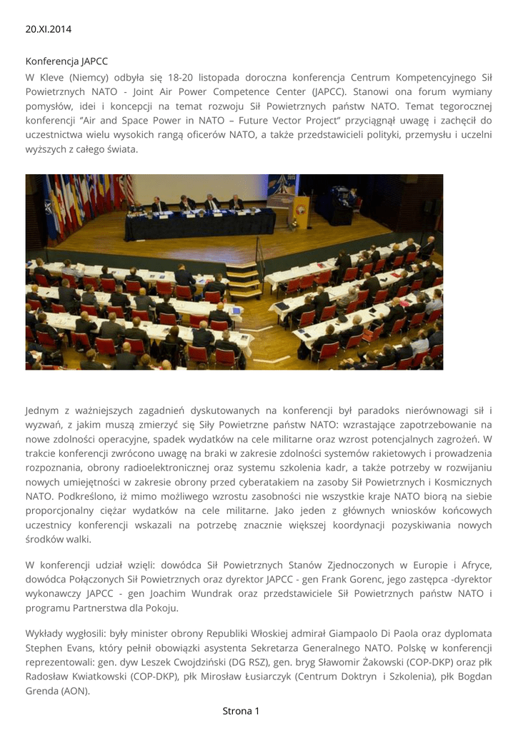 20.XI.2014 Konferencja JAPCC W Kleve (Niemcy) odbyła się 18-20 listopada doroczna konferencja Centrum Kompetencyjnego Sił Powietrznych NATO - Joint Air Power Competence Center (JAPCC). Stanowi ona forum wymiany pomysłów, idei i koncepcji na temat rozwoju Sił Powietrznych państw NATO. Temat tegorocznej konferencji ‘’Air and Space Power in NATO – Future Vector Project‘’ przyciągnął uwagę i zachęcił do uczestnictwa wielu wysokich rangą oficerów NATO, a także przedstawicieli polityki, przemysłu i uczelni wyższych z całego świata. Jednym z ważniejszych zagadnień dyskutowanych na konferencji był paradoks nierównowagi sił i wyzwań, z jakim muszą zmierzyć się Siły Powietrzne państw NATO: wzrastające zapotrzebowanie na nowe zdolności operacyjne, spadek wydatków na cele militarne oraz wzrost potencjalnych zagrożeń. W trakcie konferencji zwrócono uwagę na braki w zakresie zdolności systemów rakietowych i prowadzenia rozpoznania, obrony radioelektronicznej oraz systemu szkolenia kadr, a także potrzeby w rozwijaniu nowych umiejętności w zakresie obrony przed cyberatakiem na zasoby Sił Powietrznych i Kosmicznych NATO. Podkreślono, iż mimo możliwego wzrostu zasobności nie wszystkie kraje NATO biorą na siebie proporcjonalny ciężar wydatków na cele militarne. Jako jeden z głównych wniosków końcowych uczestnicy konferencji wskazali na potrzebę znacznie większej koordynacji pozyskiwania nowych środków walki. W konferencji udział wzięli: dowódca Sił Powietrznych Stanów Zjednoczonych w Europie i Afryce, dowódca Połączonych Sił Powietrznych oraz dyrektor JAPCC - gen Frank Gorenc, jego zastępca -dyrektor wykonawczy JAPCC - gen Joachim Wundrak oraz przedstawiciele Sił Powietrznych państw NATO i programu Partnerstwa dla Pokoju. Wykłady wygłosili: były minister obrony Republiki Włoskiej admirał Giampaolo Di Paola oraz dyplomata Stephen Evans, który pełnił obowiązki asystenta Sekretarza Generalnego NATO. Polskę w konferencji reprezentowali: gen. dyw Leszek Cwojdziński (DG RSZ), gen. bryg Sławomir Żakowski (COP-DKP) oraz płk Radosław Kwiatkowski (COP-DKP), płk Mirosław Łusiarczyk (Centrum Doktryn i Szkolenia), płk Bogdan Grenda (AON). Strona 1 Opracowali: mjr Dariusz Mądrzejewski i mjr Arkadiusz Kwasiżur (JAPCC) Strona 2