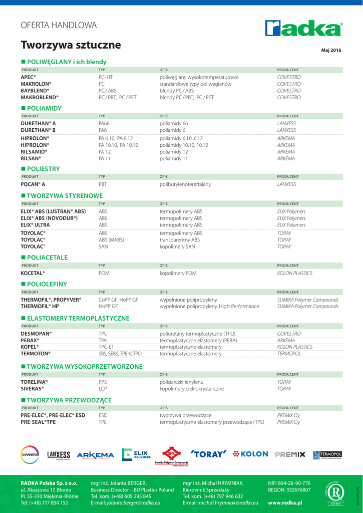 OFERTA HANDLOWA Tworzywa sztuczne Maj 2016 POLIWĘGLANY i ich blendy PRODUKT TYP OPIS PRODUCENT APEC® MAKROLON® BAYBLEND® MAKROBLEND® PC-HT PC PC / ABS PC / PBT; PC / PET poliwęglany wysokotemperaturowe standardowe typy poliwęglanów blendy PC / ABS blendy PC / PBT; PC / PET COVESTRO COVESTRO COVESTRO COVESTRO POLIAMIDY PRODUKT TYP OPIS PRODUCENT DURETHAN® A DURETHAN® B PA66 PA6 poliamidy 66 poliamidy 6 LANXESS LANXESS HIPROLON® HIPROLON® RILSAMID® RILSAN® PA 6.10, PA 6.12 PA 10.10, PA 10.12 PA 12 PA 11 poliamidy 6.10, 6.12 poliamidy 10.10, 10.12 poliamidy 12 poliamidy 11 ARKEMA ARKEMA ARKEMA ARKEMA PRODUKT TYP OPIS PRODUCENT POCAN® A PBT polibutylenotereftalany LANXESS POLIESTRY TWORZYWA STYRENOWE PRODUKT TYP OPIS PRODUCENT ELIX® ABS (LUSTRAN® ABS) ELIX® ABS (NOVODUR®) ELIX® ULTRA ABS ABS ABS termopolimery ABS termopolimery ABS termopolimery ABS ELIX Polymers ELIX Polymers ELIX Polymers TOYOLAC® TOYOLAC® TOYOLAC® ABS ABS (MABS) SAN termopolimery ABS transparentny ABS kopolimery SAN TORAY TORAY TORAY PRODUKT TYP OPIS PRODUCENT KOCETAL® POM kopolimery POM KOLON PLASTICS PRODUKT TYP OPIS PRODUCENT THERMOFIL®, PROPYVER® THERMOFIL® HP CoPP GF; HoPP GF HoPP GF wypełnione polipropyleny wypełnione polipropyleny, High-Performance SUMIKA Polymer Compounds SUMIKA Polymer Compounds POLIACETALE POLIOLEFINY ELASTOMERY TERMOPLASTYCZNE PRODUKT TYP OPIS PRODUCENT DESMOPAN® PEBAX® KOPEL® TERMOTON® TPU TPA TPC-ET SBS, SEBS, TPE-V, TPO poliuretany termoplastyczne (TPU) termoplastyczne elastomery (PEBA) termoplastyczne elastomery termoplastyczne elastomery COVESTRO ARKEMA KOLON PLASTICS TERMOPOL TWORZYWA WYSOKOPRZETWORZONE PRODUKT TYP OPIS PRODUCENT TORELINA® SIVERAS® PPS LCP polisiarczki fenylenu kopolimery ciekłokrystaliczne TORAY TORAY PRODUKT TYP OPIS PRODUCENT PRE-ELEC®, PRE-ELEC® ESD PRE-SEAL®TPE ESD TPE tworzywa przewodzące termoplastyczne elastomery przewodzące (TPE) PREMIX Oy PREMIX Oy RADKA Polska Sp. z o.o. ul. Akacjowa 17, Błonie PL 55-330 Miękinia-Błonie Tel: (+48) 717 854 152 mgr inż. Jolanta BERGER, Business Director – BU Plastics Poland Tel. kom. (+48) 605 295 845 E-mail: [email protected] mgr inż. Michał HRYMNIAK, Kierownik Sprzedaży Tel. kom. (+48) 797 946 632 E-mail: [email protected] NIP: 894-26-90-776 REGON: 932676807 www.radka.pl 2015-05-C-PL TWORZYWA PRZEWODZĄCE