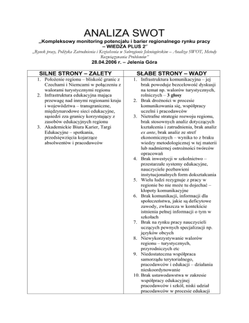 ANALIZA SWOT ,,Kompleksowy monitoring potencjału i barier regionalnego rynku pracy – WIEDZA PLUS 2’’ „Rynek pracy, Polityka Zatrudnienia i Kształcenia w Subregionie Jeleniogórskim – Analiza SWOT, Metody Rozwiązywania Problemów” 28.04.2006 r. – Jelenia Góra SILNE STRONY – ZALETY 1. Położenie regionu – bliskość granic z Czechami i Niemcami w połączeniu z walorami turystycznymi regionu 2. Infrastruktura edukacyjna mająca przewagę nad innymi regionami kraju i województwa – transgraniczne, międzynarodowe sieci edukacyjne, sąsiedzi zza granicy korzystający z zasobów edukacyjnych regionu 3. Akademickie Biura Karier, Targi Edukacyjne – spotkania, przedsięwzięcia kojarzące absolwentów i pracodawców SŁABE STRONY – WADY 1. Infrastruktura komunikacyjna – jej brak powoduje bezcelowość dyskusji na temat np. walorów turystycznych, rolniczych – 3 głosy 2. Brak drożności w procesie komunikowania się, współpracy uczelni i pracodawców 3. Nietrafne strategie rozwoju regionu, brak stosownych analiz dotyczących kształcenia i zatrudnienia, brak analiz ex ante, brak analiz ze stref ekonomicznych – wynika to z braku wiedzy metodologicznej w tej materii lub nadmiernej ostrożności twórców opracowań 4. Brak inwestycji w szkolnictwo – przestarzałe systemy edukacyjne, nauczyciele pozbawieni instytucjonalnych form dokształcania 5. Wielu ludzi rezygnuje z pracy w regionie bo nie może tu dojechać – kłopoty komunikacyjne 6. Brak komunikacji, informacji dla społeczeństwa, jakie są deficytowe zawody, zwłaszcza w kontekście istnienia pełnej informacji o tym w szkołach 7. Brak na rynku pracy nauczycieli uczących pewnych specjalizacji np. języków obcych 8. Niewykorzystywanie walorów regionu – turystycznych, przyrodniczych etc 9. Niedostateczna współpraca samorządu terytorialnego, pracodawców i edukacji – działania nieskoordynowanie 10. Brak ustawodawstwa w zakresie współpracy edukacyjnej pracodawców i szkól, niski udział pracodawców w procesie edukacji 11. Mało elastyczny system infrastruktury turystyczno – hotelarskiej , instytucje rynku pracy nie są otwarte na absolwentów 12. Niedostateczna ilość liczbowa i rodzajowa studiów podyplomowych 13. Pracodawcy pozbawieni wsparcia szkół w działaniach mających na celu pozyskiwanie absolwentów o określonych kwalifikacjach 14. Brak określonych zawodów na rynku pracy np. ślusarz 15. Mało osób rejestrujących działalność gospodarczą, zwłaszcza wśród młodych osób – deficyt przedsiębiorczości, niski poziom aktywności mieszkańców regionu SZANSE 1. infrastruktura edukacyjna – na wszelkich szczeblach (wyższe, ponadgimnazjalne, podstawowe) 2. specjalizacja potrzeb regionu we wszelkich wymiarach (np. edukacyjnym) 3. powstawanie i rozwój nowych kierunków, specjalizacji studiów, szkół dostosowanych do potrzeb regionalnego rynku pracy 4. kreatywność młodzieży 5. aktywność społeczności lokalnej, samoorganizowanie się mieszkańców 6. ludzie pracujący w szkole – pedagogowie, z drugiej strony niektóre osoby pracujące w szkole są zagrożeniem dla systemów edukacji, trzeba wskazać jednak na fakt, że istnieją placówki, w których nauczyciele są profesjonalnie przygotowani do pracy (kilka specjalności) 7. istnienie instytucji typu biura kariery, zapewniających praktyki zawodowe uczniom, forów zawodowych w szkołach 8. współpraca administracji rządowej zwłaszcza na poziomie ministerialnym – np. ministerstwa odpowiadające za pracę, gospodarkę, przemysł muszą współpracować z ZAGROŻENIA 1. Wrocław jako najpoważniejsze zagrożenie regionu – centralizacja środków, priorytetów rozwoju 2. drenaż umysłów jako wynik poszukiwania pracy za granicą 3. sztywne standardy nauczania w programach edukacyjnych, choć tu zauważalna jest tendencja zmian (autonomia wyboru w 60 %) 4. „łowcy głów z Wrocławia” zabierający najlepszych absolwentów, brak takowych w regionie jeleniogórskim 5. reprezentowanie interesów partii politycznych a nie regionów, gmin i miast 6. brak elastyczności w reformowaniu polskiej szkoły – niedługo zabraknie np filologów, fizyków i matematyków 7. zanik pewnych specjalizacji w szkołach, zbyt duża ilość szkół o profilu ogólnokształcącym 8. zamykanie drogi do praktyk przez niektóre przedsiębiorstwa 9. najlepiej wykształceni mieszkańcy regionu nie wracają do lokalnych ojczyzn po zakończeniu procesu edukacji 10. wyjazd za granicę najaktywniejszych i najbardziej przedsiębiorczych ministerstwem odpowiadającym za edukację 9. instytucjonalne rozwiązania (np. system refundacji, zwrotów kosztów) stymulujące współpracę pracodawców i szkół – praktyczna nauka zawodów 10. rozwój rynku pracy utożsamiany z rozwojem regionu 11. dalszy rozwój szkolnictwa wyższego regionu – wzorem sytuacji w Niemczech, Austrii 12. dynamiczne działanie władz terytorialnych 13. restrukturyzacja szkół wyższych w kierunku współpracy ze szkołami z innych szczebli edukacji 14. przekuwanie chęci na rezultaty 15. instytucjonalna współpraca edukacji, samorządów i pracodawców – wspólne rozwiązywanie problemów 16. wsparcie dla szkolnictwa zawodowego 17. dobre rozwiązania prawne łączące rynek edukacyjny z rynkiem pracy 18. wobec braku instytucjonalnych rozwiązań działania społeczności 19. stworzenie geotermalnego ośrodka turystycznego – pozyskiwanie funduszy strukturalnych na te cele 20. instytucjonalna współpraca i wspólne działanie regionalnych uczelni wyższych 21. współpraca pracodawców i uczelni w dziedzinie praktyk 22. zmiana systemów punktowania absolwentów 23. powstawanie inkubatorów przedsiębiorczości mieszkańców 11. rozszerzanie się obszarów biedy i ubóstwa, bezrobocie strukturalne wielopokoleniowe 12. niewielka ilość szkół zawodowych