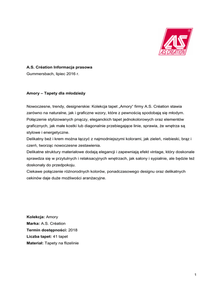 A.S. Création Informacja prasowa Gummersbach, lipiec 2016 r. Amory – Tapety dla młodzieży Nowoczesne, trendy, designerskie: Kolekcja tapet „Amory“ firmy A.S. Création stawia zarówno na naturalne, jak i graficzne wzory, które z pewnością spodobają się młodym. Połączenie stylizowanych pnączy, eleganckich tapet jednokolorowych oraz elementów graficznych, jak małe kostki lub diagonalnie przebiegające linie, sprawia, że wnętrza są stylowe i energetyczne. Delikatny beż i krem można łączyć z najmodniejszymi kolorami, jak zieleń, niebieski, brąz i czerń, tworząc nowoczesne zestawienia. Delikatne struktury materiałowe dodają elegancji i zapewniają efekt vintage, który doskonale sprawdza się w przytulnych i relaksacyjnych wnętrzach, jak salony i sypialnie, ale będzie też doskonały do przedpokoju. Ciekawe połączenie różnorodnych kolorów, ponadczasowego designu oraz delikatnych cekinów daje duże możliwości aranżacyjne. Kolekcja: Amory Marka: A.S. Création Termin dostępności: 2018 Liczba tapet: 41 tapet Materiał: Tapety na flizelinie 1