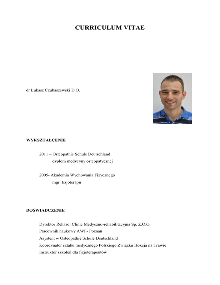 CURRICULUM VITAE dr Łukasz Czubaszewski D.O. WYKSZTAŁCENIE 2011 – Osteopathie Schule Deutschland dyplom medycyny osteopatycznej 2005- Akademia Wychowania Fizycznego mgr. fizjoterapii DOŚWIADCZENIE Dyrektor Rehasol Clinic Medyczno-rehabilitacyjna Sp. Z.O.O. Pracownik naukowy AWF- Poznań Asystent w Osteopathie Schule Deutschland Koordynator sztabu medycznego Polskiego Związku Hokeja na Trawie Instruktor szkoleń dla fizjoterapeutów Prywatna praktyka rehabilitacyjna i osteopatyczna SZKOLENIA • Medycyna Osteopatyczna - Osteopathie Schule Deutschland • Manipulacje wisceralne w ginekologi – Caroline Stone • Mózg w ujęciu osteopatycznym – Marek Mularczyk • Osteopatyczne techniki limfatyczne – Bruno Chikly • Intergracja Strukturalna – Martin Morales • Somatic Experiencing (Trauma Healing) – Elizabeth Kaizer • Holistyczna terapia manualna- Andrzej rakowski • Terapia tkanek miękkich- Jarosław Ciechomski • Masaż Takanek Głębokich -Deep Tissue Massage- Art Riggs • Kinesiotaping podstawowy, rozwijający Tomasz Senderek